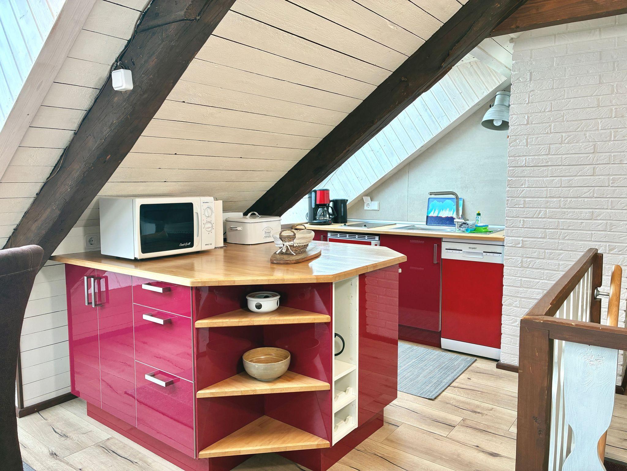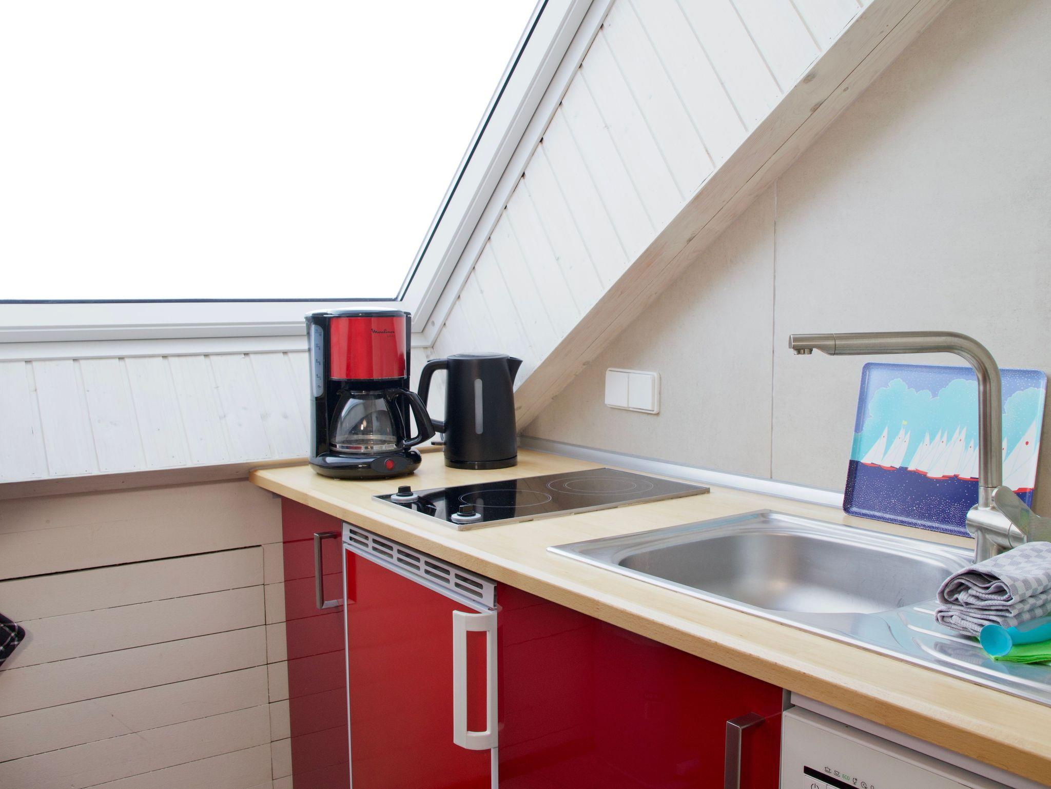Die offene Wohnküche ist modern gestaltet und lässt keine Wünsche für die Selbstversorgung im Urlaub offen. Kaffeemaschine, Gefriermöglichkeit und Geschirrspüler ergänzen die Ausstattung der Küche. Ein Esstisch direkt am Fenster verbindet gemeinsame Mahlzeiten mit dem freien Blick nach draußen.