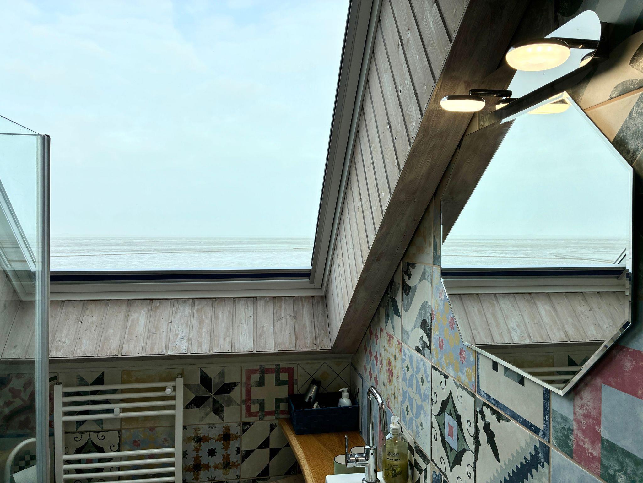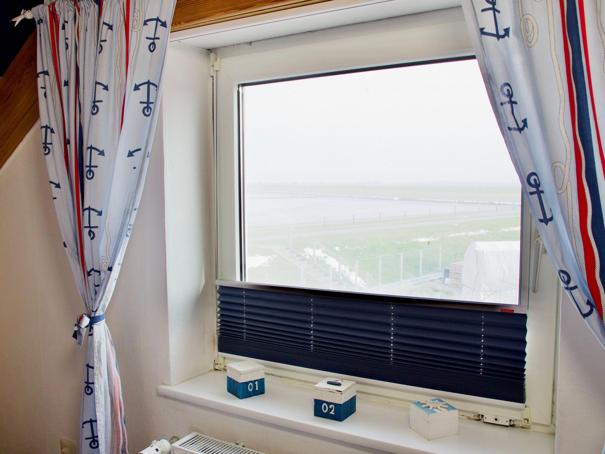 Das Schlafzimmer ist mit einem französischen Doppelbett und einem Kleiderschrank ausgestattet und bietet ebenfalls Meerblick. Ein weiteres Bett befindet sich in einer ruhigen Ecke des Wohnzimmers und ist harmonisch in den Raum integriert. Das moderne Badezimmer ergänzt die Wohnung funktional und bietet ebenfalls einen Ausblick auf das Weltnaturerbe Wattenmeer.