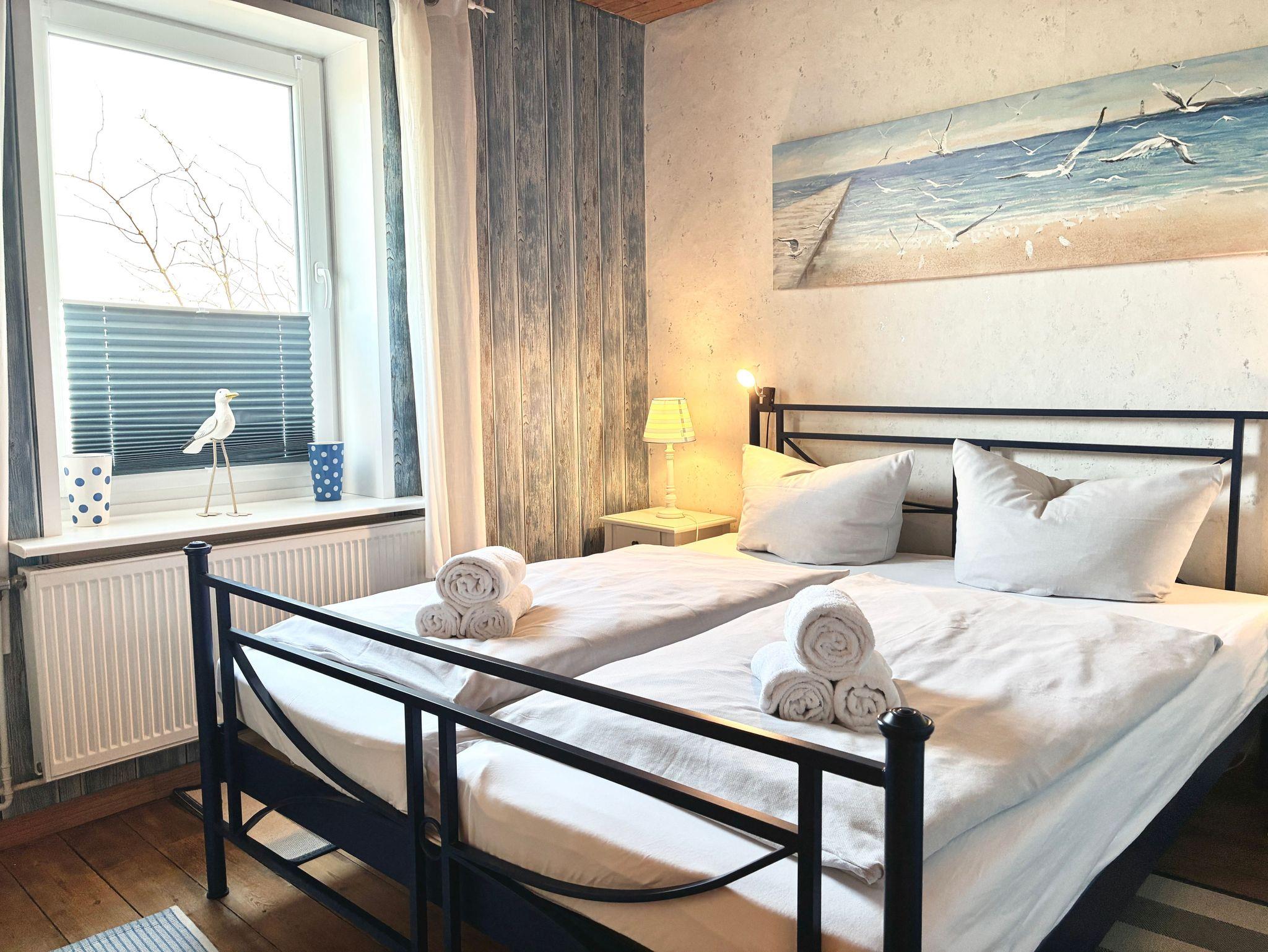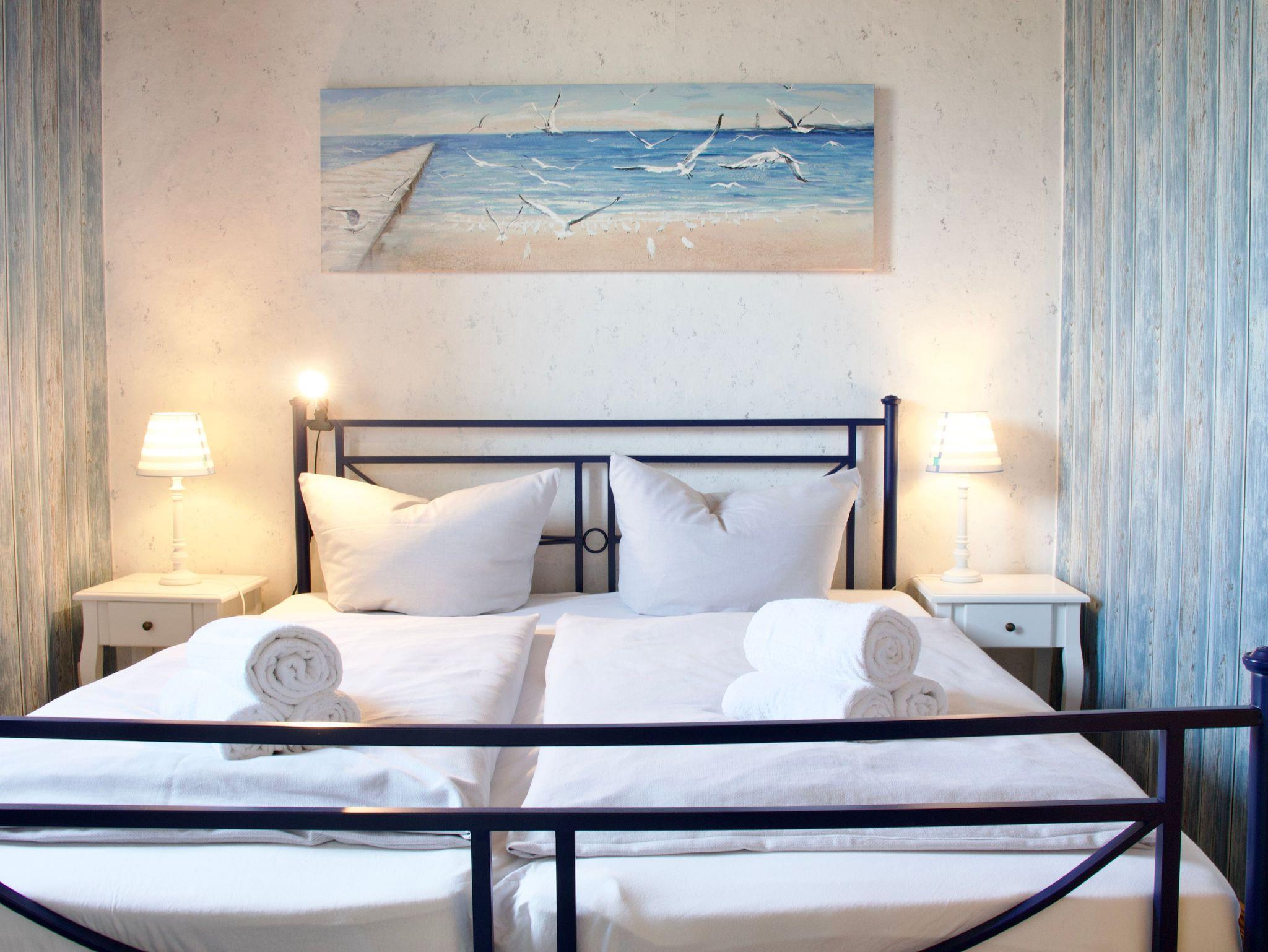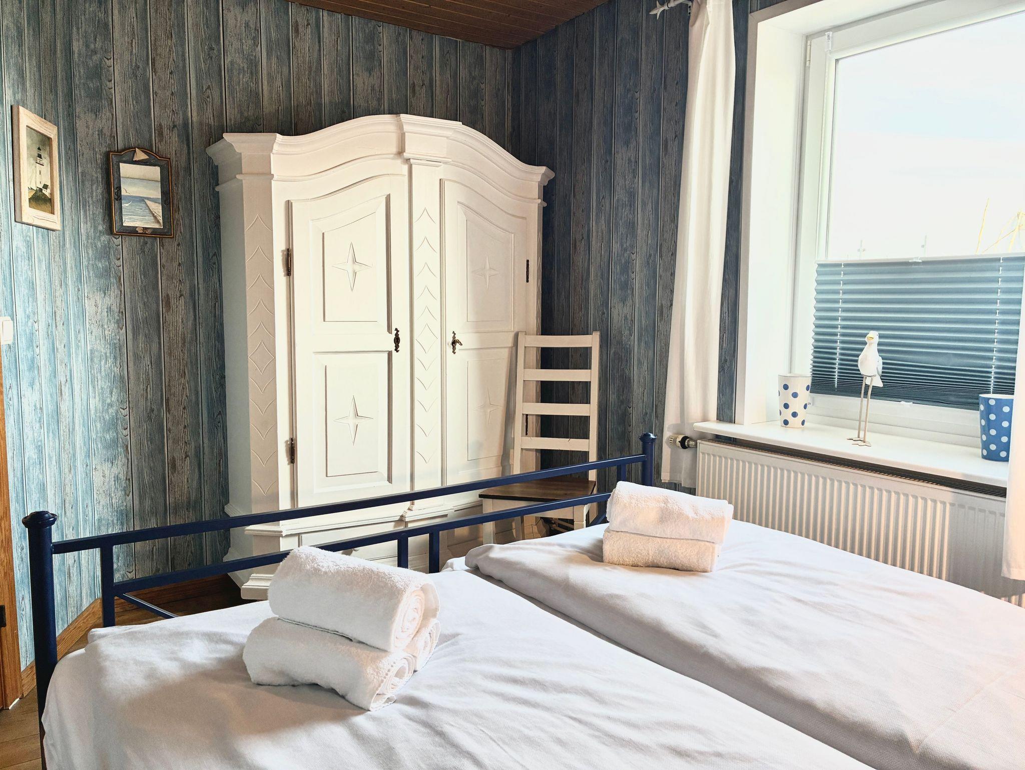 Die rund 38 Quadratmeter große Wohnung ist für zwei Personen eingerichtet und ruhig sowie einladend gestaltet. Das Schlafzimmer verfügt über ein Doppelbett und einen Kleiderschrank und bietet ebenfalls direkten Meerblick, so dass Sie mit dem Nordseepanorama aufwachen und auch wieder einschlafen können. Von hier aus gelangen Sie direkt in das maritim gestaltete Duschbad.