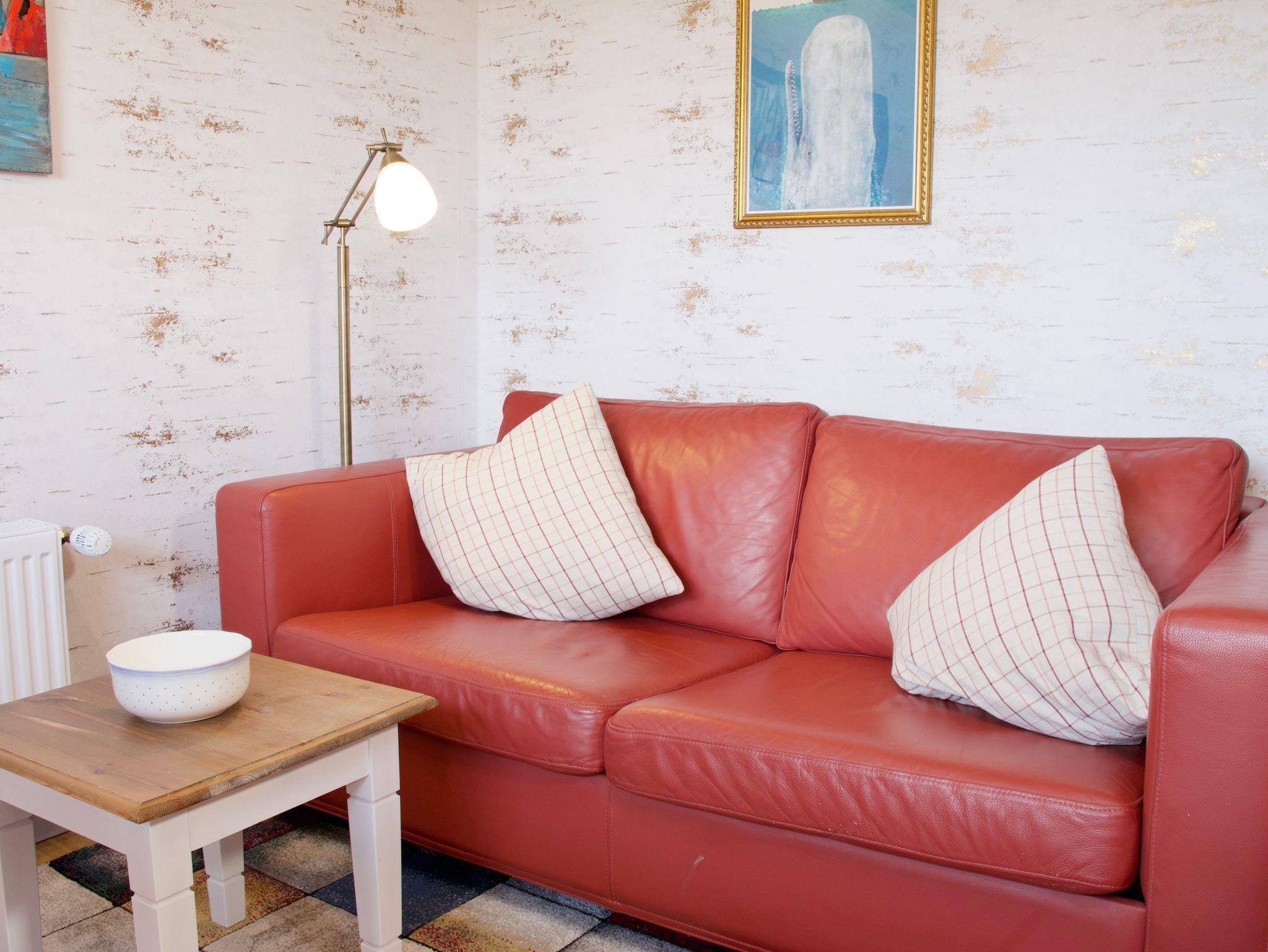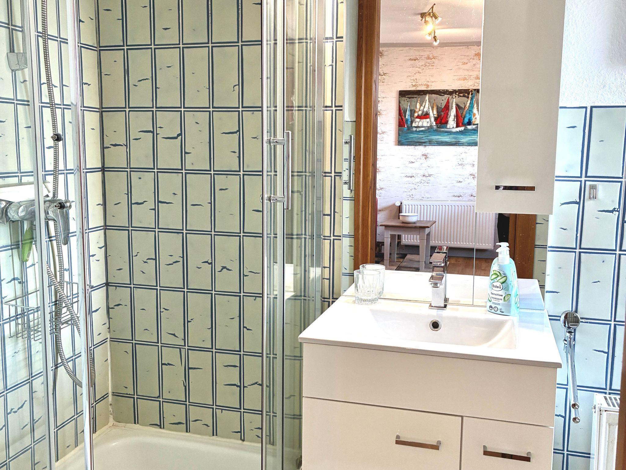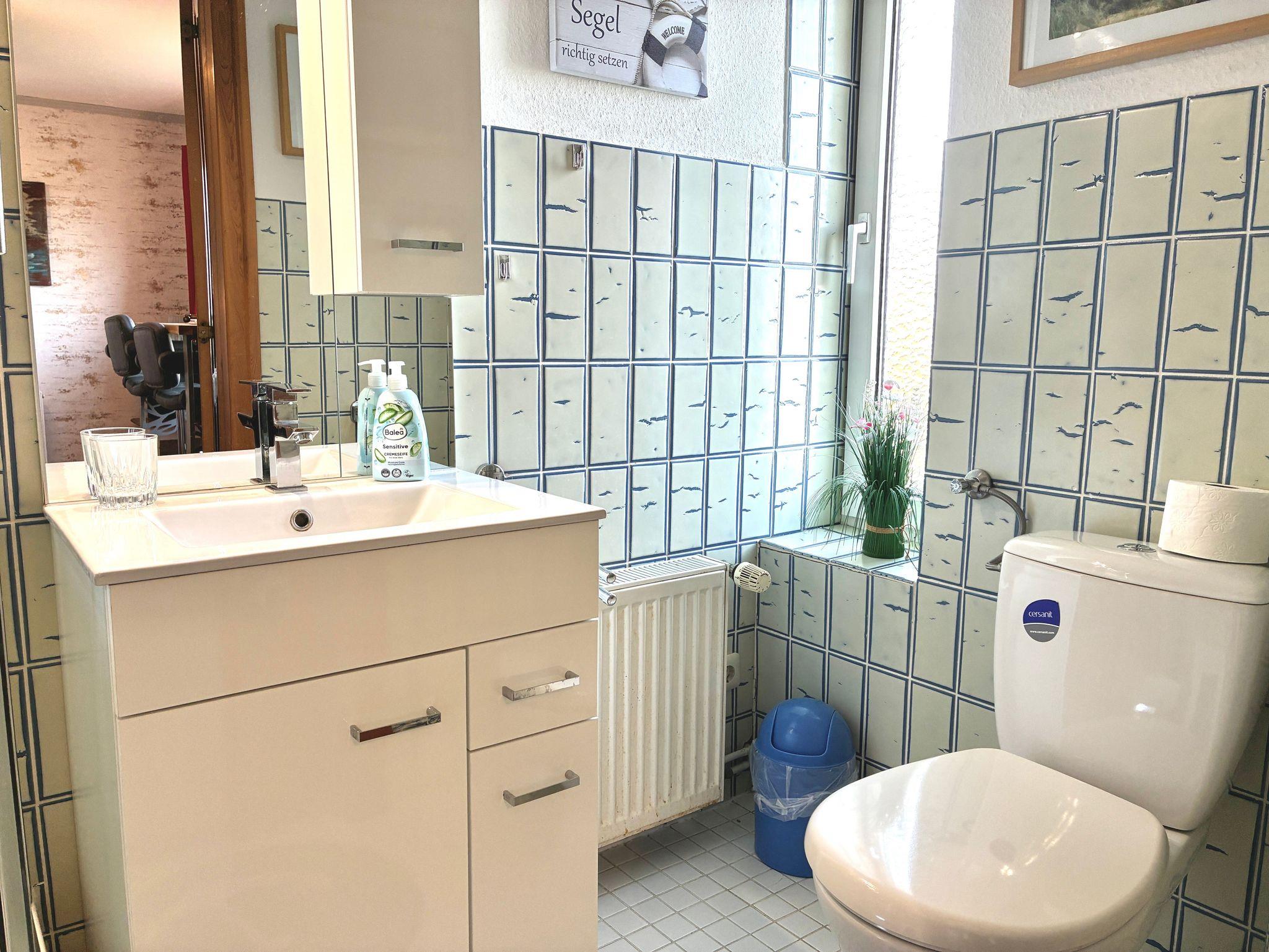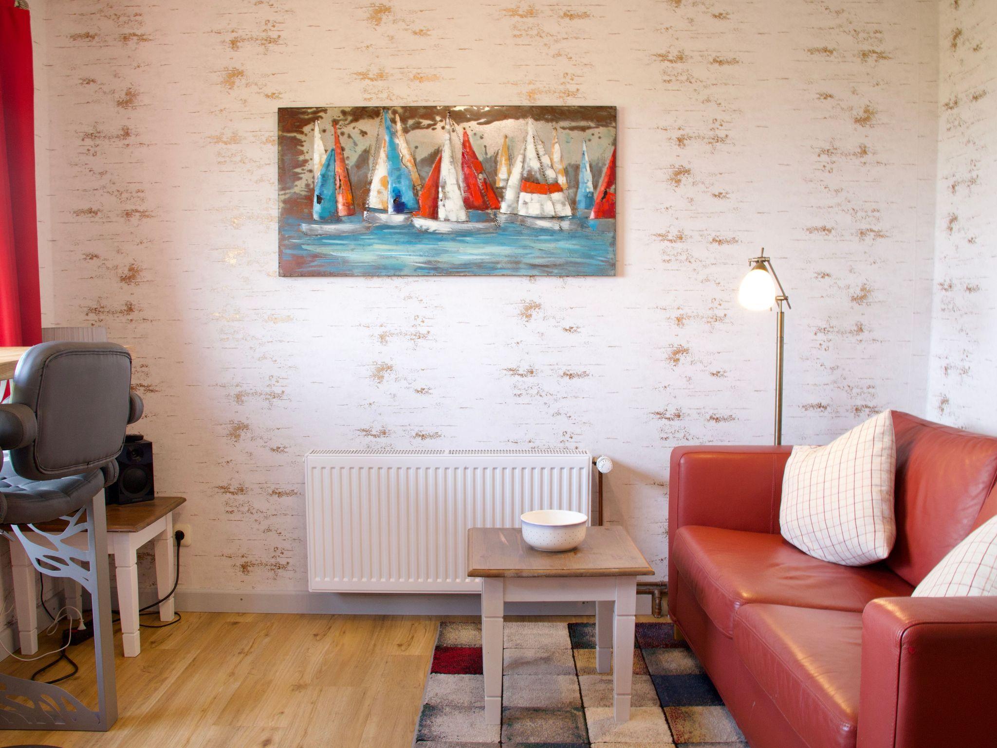 Die rund 38 Quadratmeter große Wohnung ist für zwei Personen eingerichtet und ruhig sowie einladend gestaltet. Das Schlafzimmer verfügt über ein Doppelbett und einen Kleiderschrank und bietet ebenfalls direkten Meerblick, so dass Sie mit dem Nordseepanorama aufwachen und auch wieder einschlafen können. Von hier aus gelangen Sie direkt in das maritim gestaltete Duschbad.