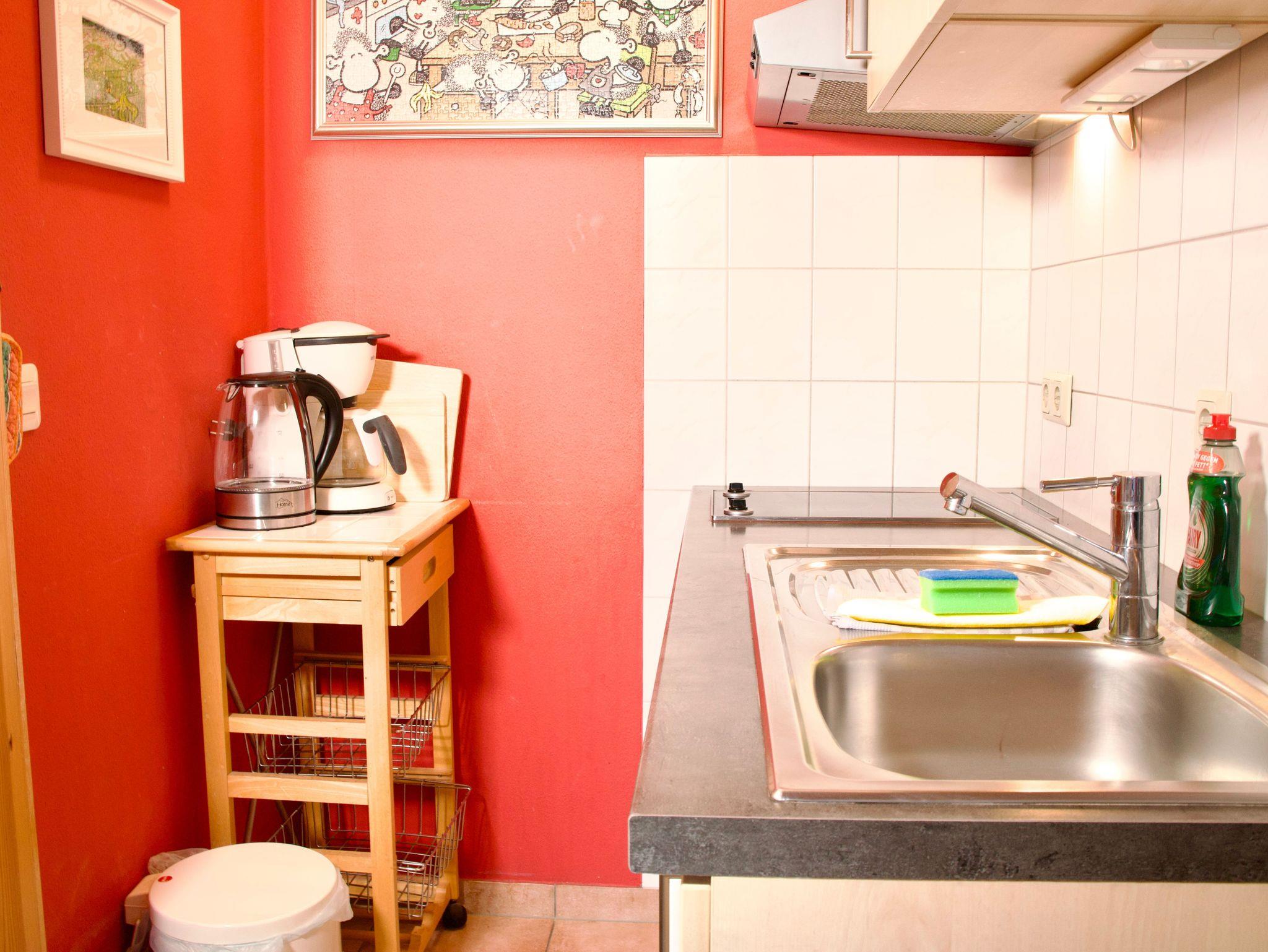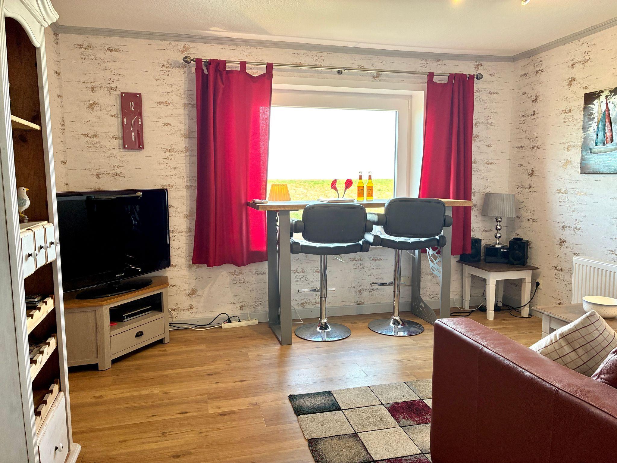 Der Wohnbereich ist hell gehalten und mit einem Esstisch ausgestattet, der zu entspannten Mahlzeiten mit Blick nach draußen einlädt. Die Pantryküche fügt sich harmonisch in den Raum ein und bietet alles, was für die Selbstversorgung im Urlaub benötigt wird. Eine Kaffeemaschine sowie eine Gefriermöglichkeit stehen Ihnen zur Verfügung und runden die Ausstattung sinnvoll ab.