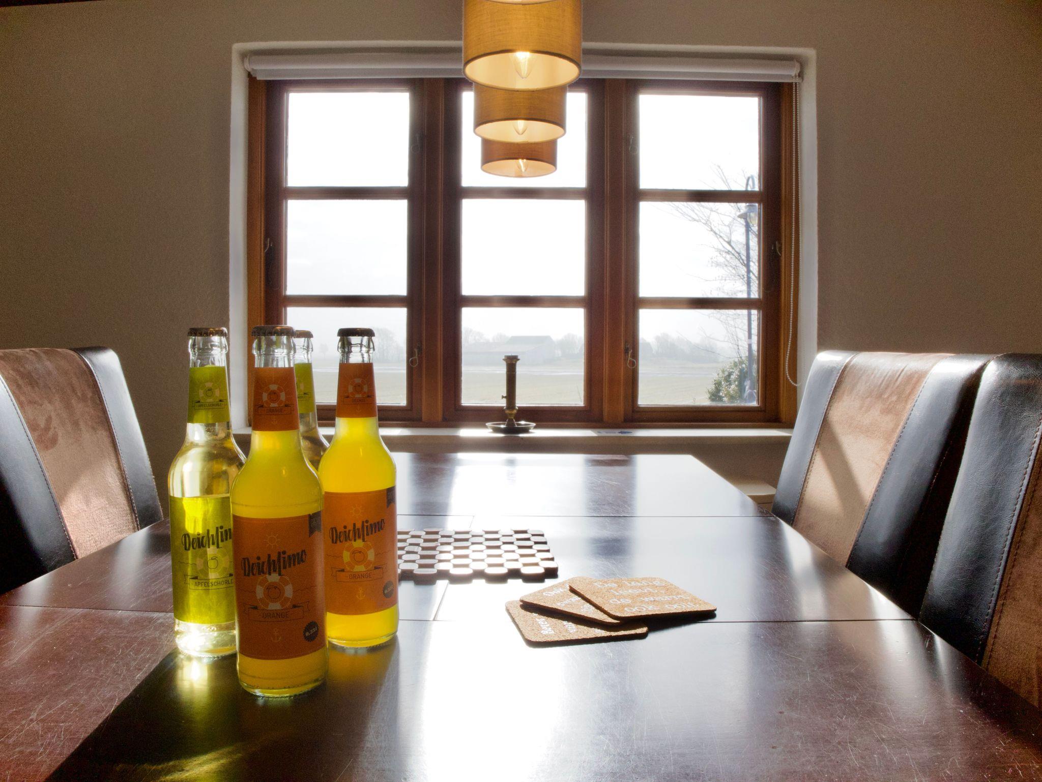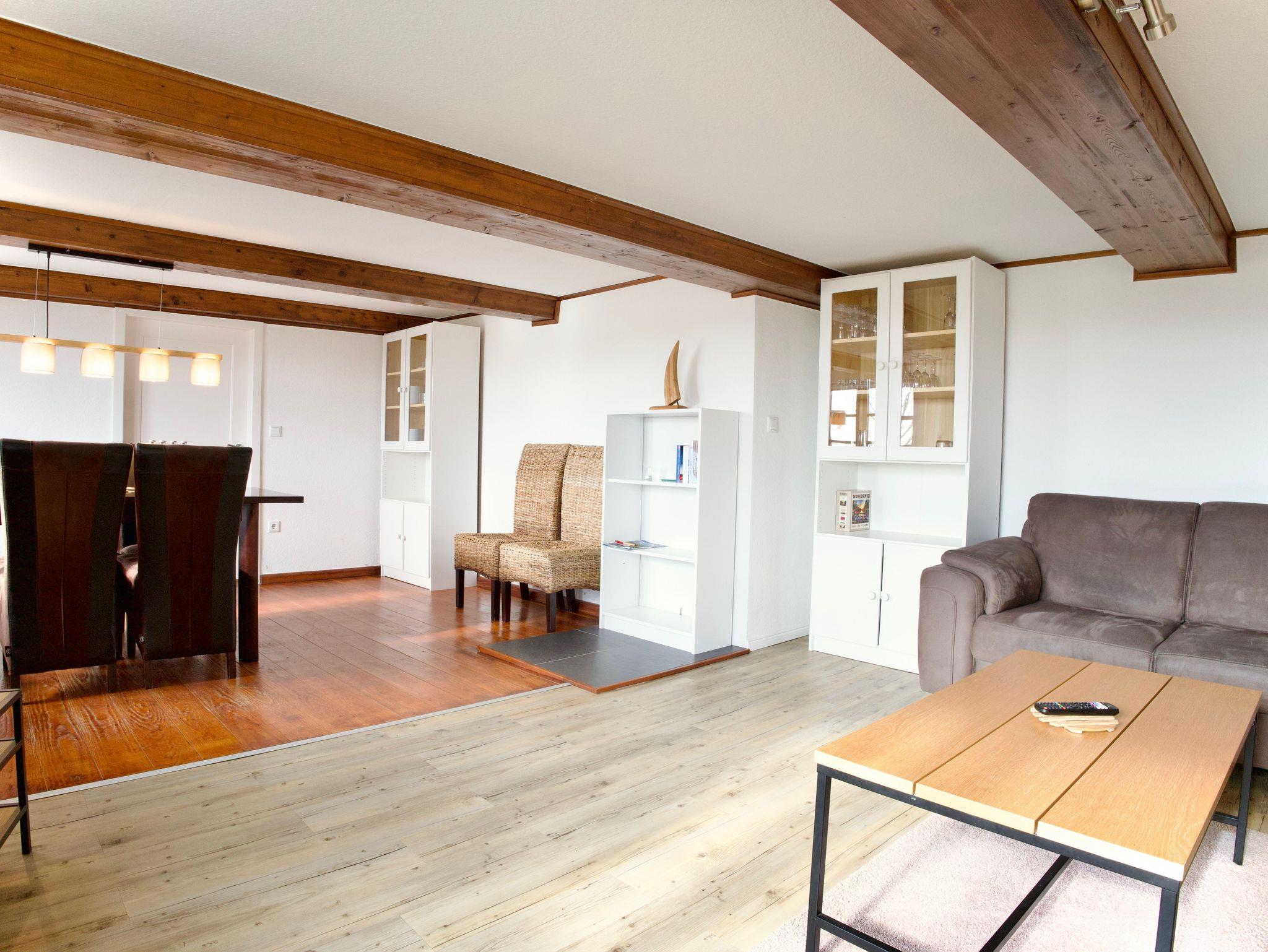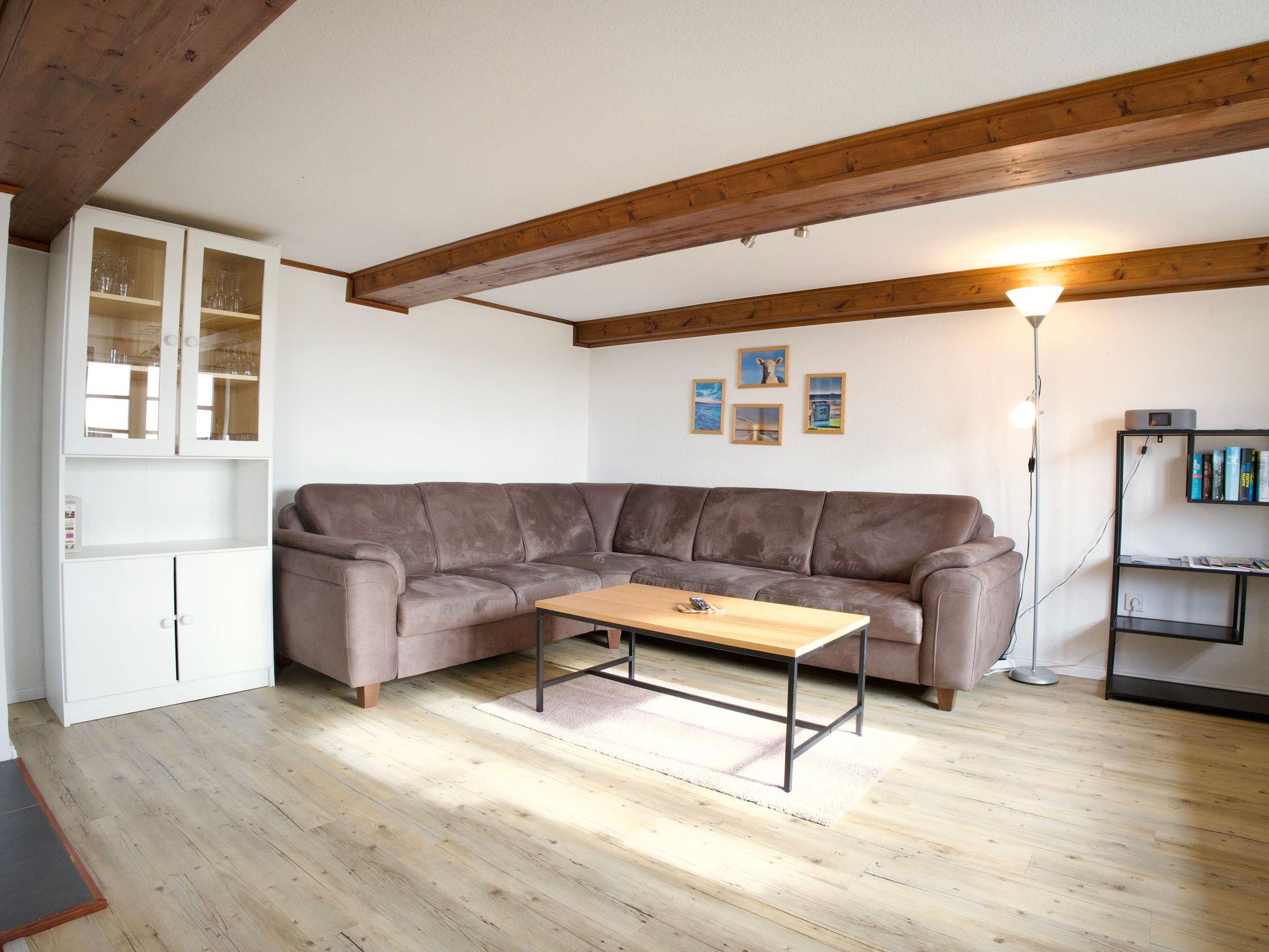 Im Erdgeschoss befindet sich das großzügige Wohnzimmer mit integriertem Essbereich. Der helle, offen gestaltete Raum wird von einer Holzbalkendecke und einem Dielenboden geprägt und vermittelt eine warme, behagliche Atmosphäre. Eine große Couch, ein Smart-TV sowie Bücher, Spiele und Infomaterial rund um Nordstrand laden zu entspannten Stunden ein. Der Esstisch ist am Fenster platziert und bietet einen freien Blick ins Grüne und über die Felder der Umgebung.