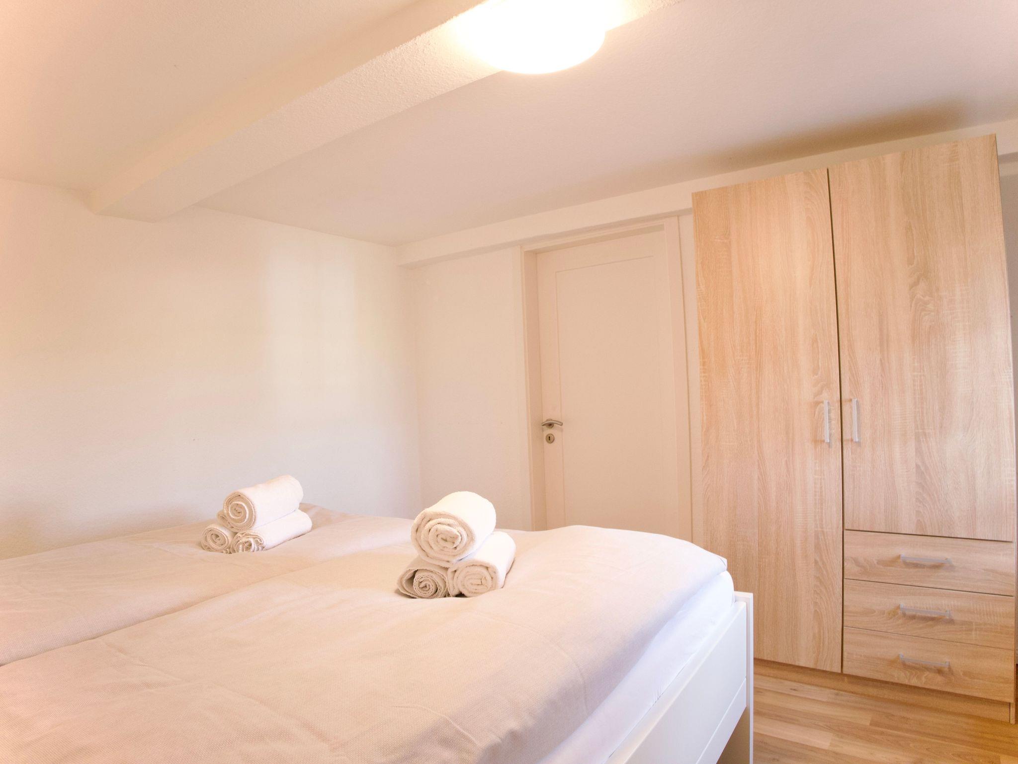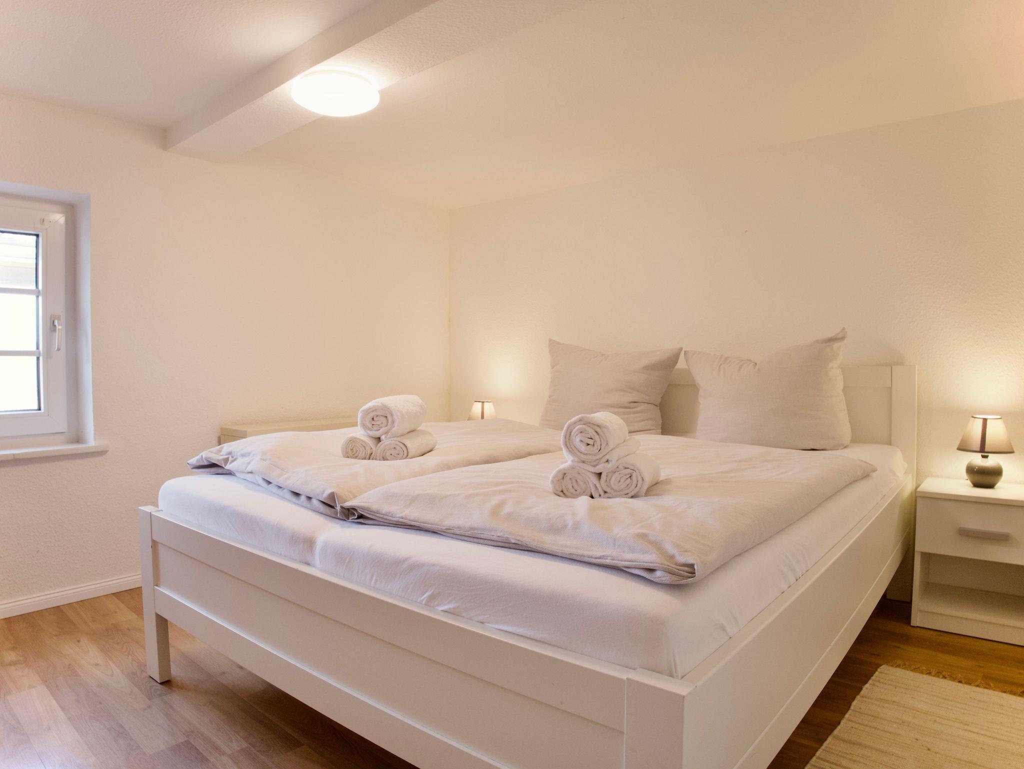 Von hier aus gelangen Sie direkt in das erste Schlafzimmer im Erdgeschoss, das mit einem 160 Zentimeter breiten Doppelbett ausgestattet ist.