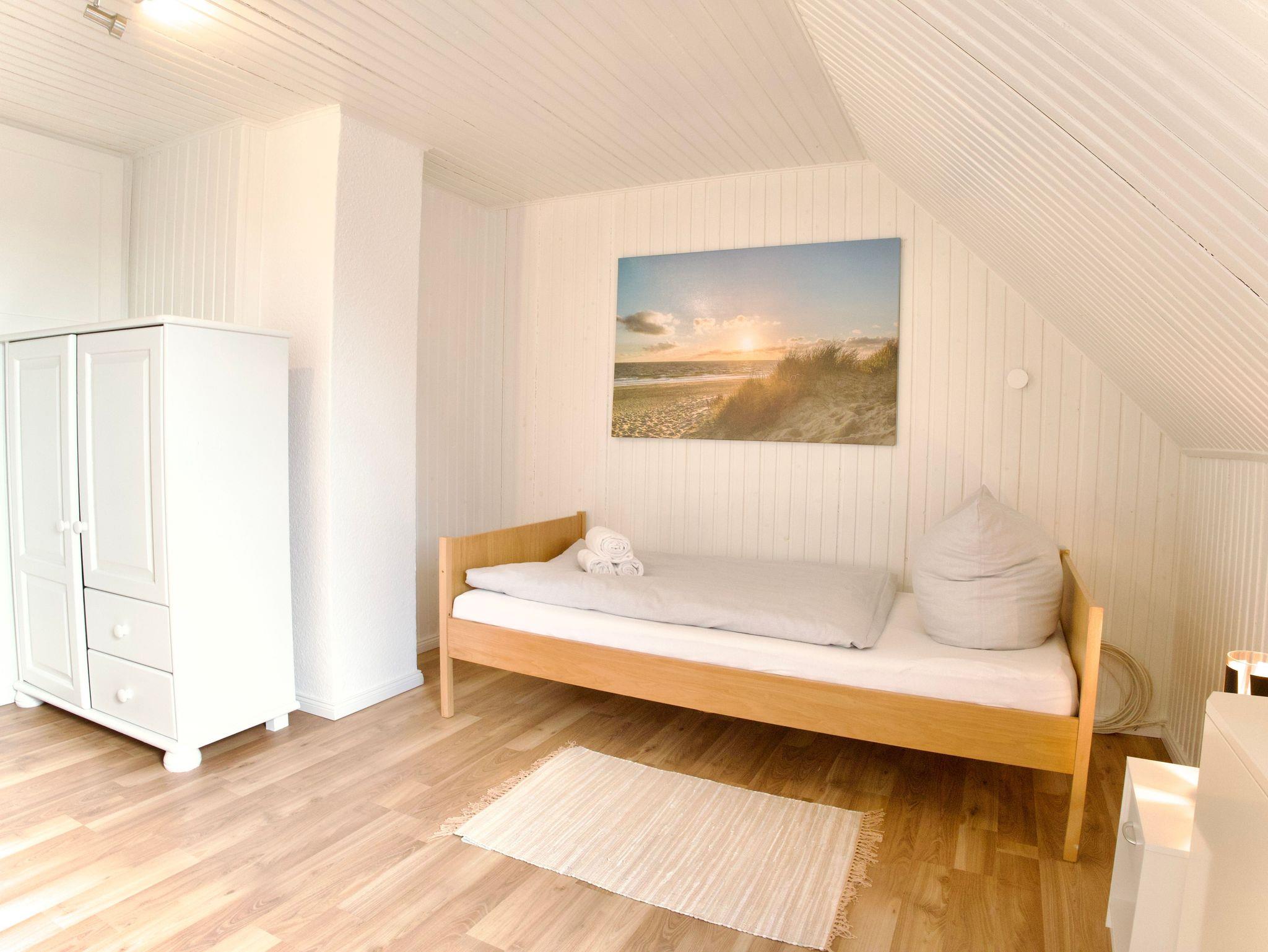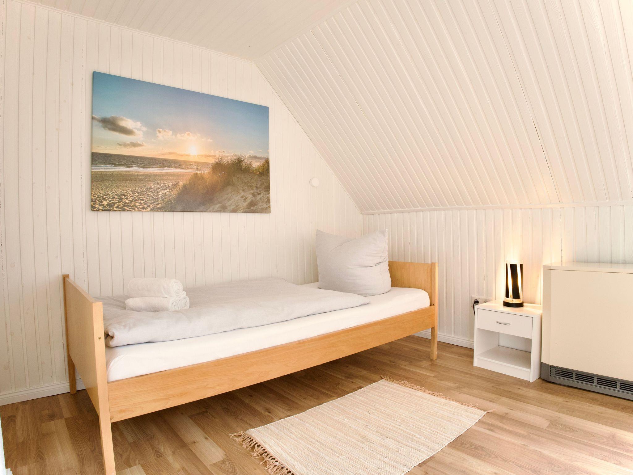 Über eine offene Treppe gelangen Sie in das Obergeschoss. Hier befinden sich zwei großzügige Schlafzimmer. Eines ist mit zwei 90 Zentimeter breiten Einzelbetten ausgestattet und bietet einen schönen Blick in die Landschaft. Das zweite Schlafzimmer verfügt über ein 180 Zentimeter breites Doppelbett mit Meerblick und freier Sicht auf die Weiden mit Schafen und Lämmern.