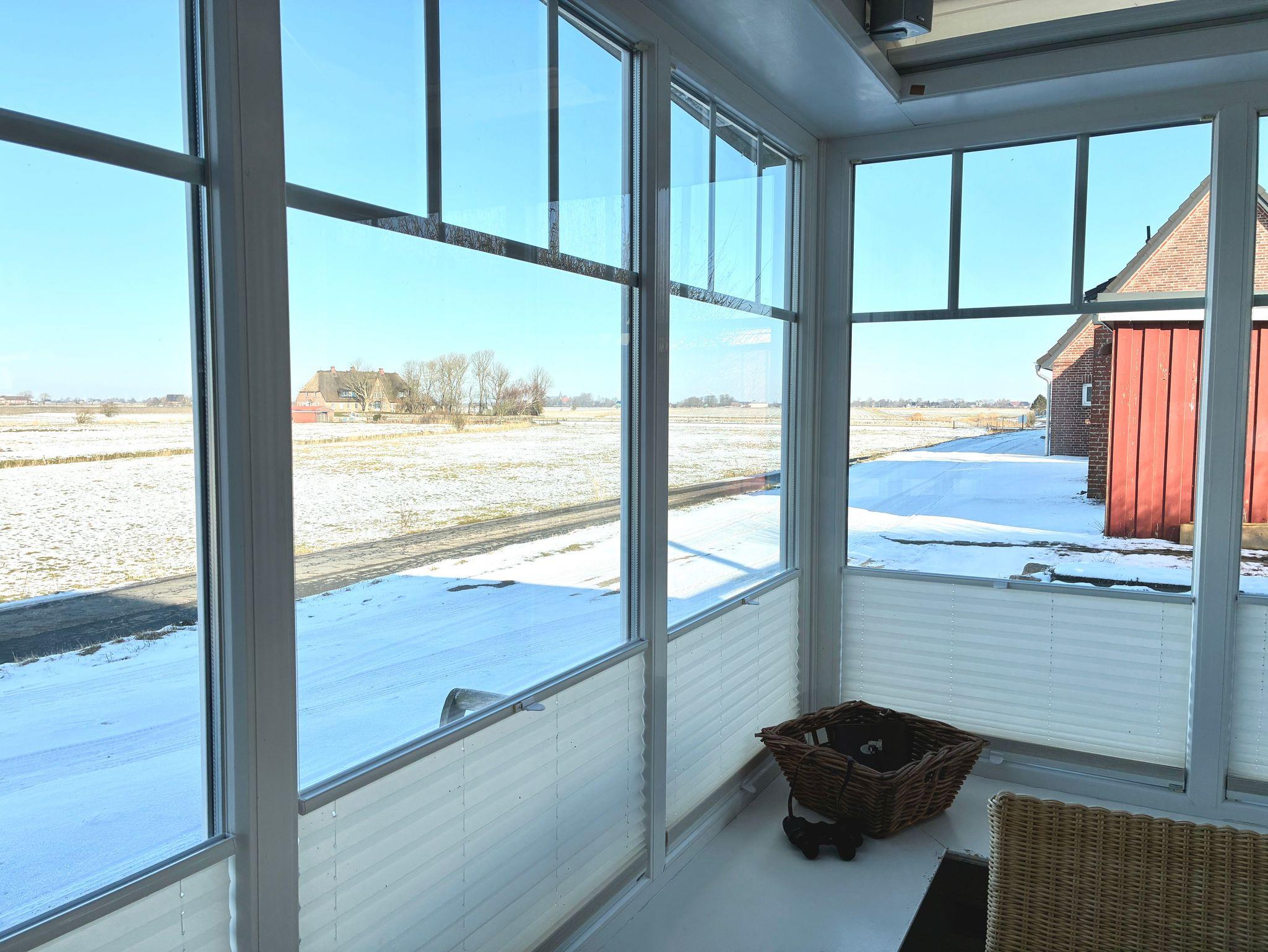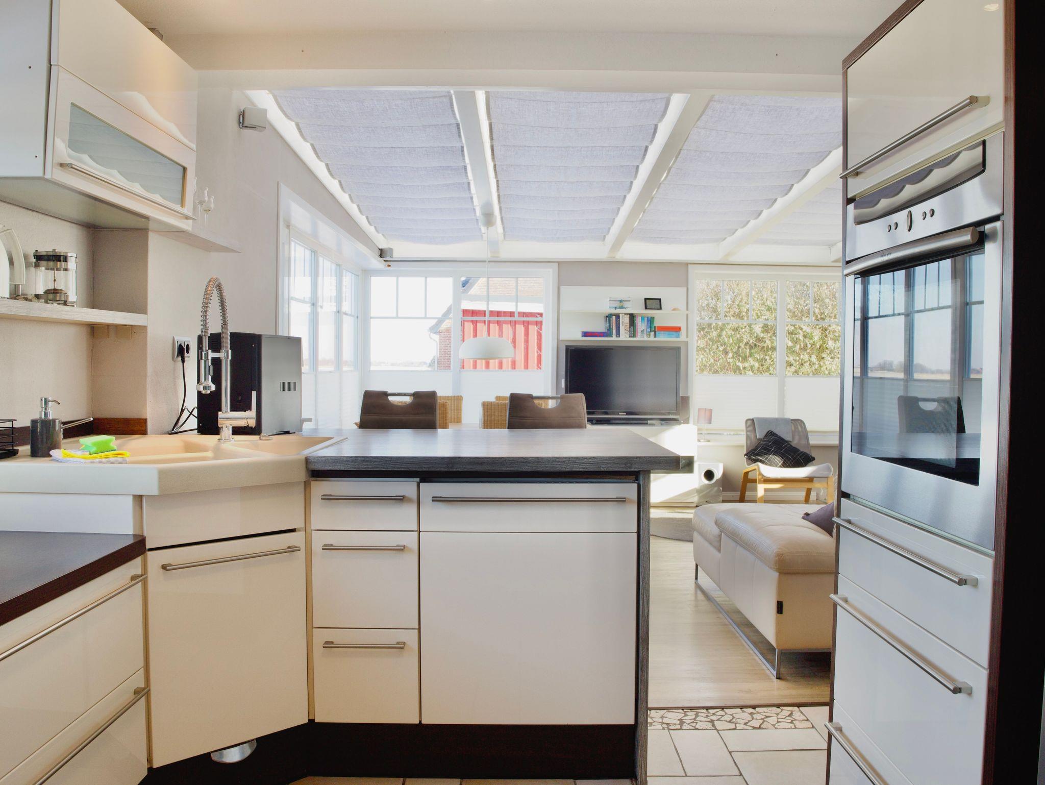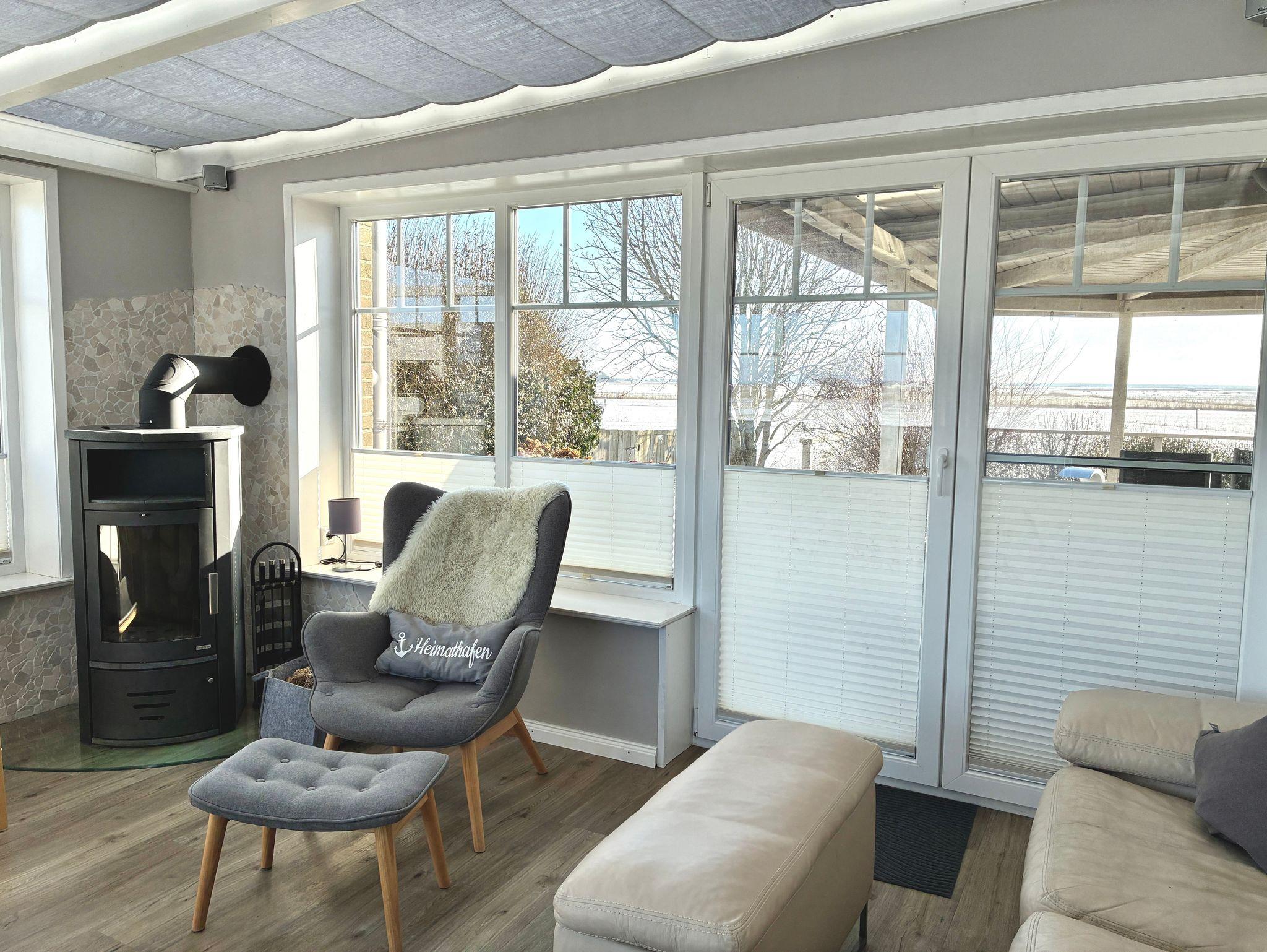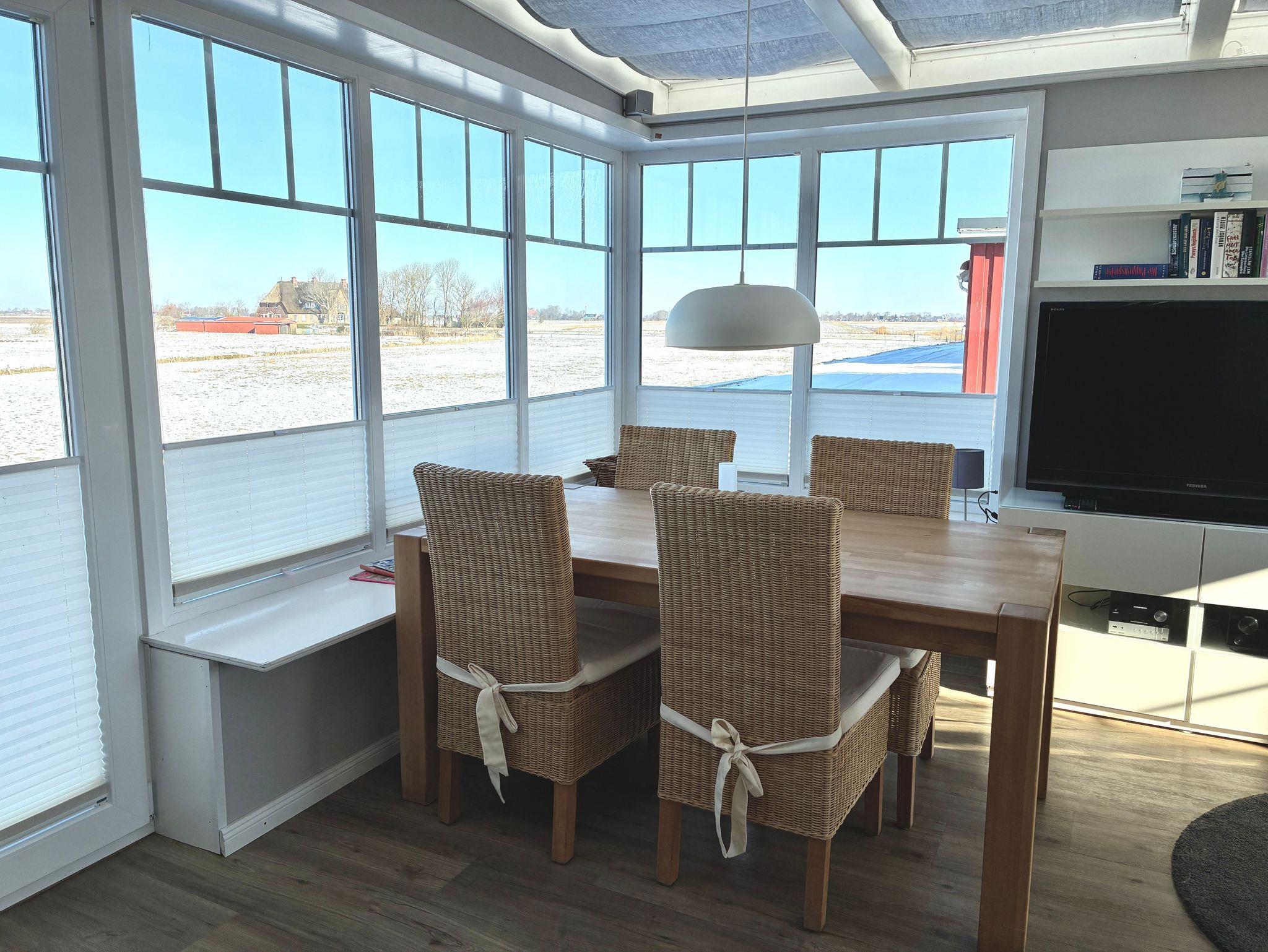 Der helle Wohn- und Essbereich ist zurückhaltend gestaltet und geht fließend in den angrenzenden Wintergarten über. Dieser bildet einen geschützten Rückzugsort mit freiem Blick über die grünen Felder Nordstrands und lädt zu entspannten Stunden zu jeder Jahreszeit ein. Ein Kaminofen ergänzt die wohnliche Atmosphäre und sorgt besonders an kühleren Tagen für behagliche Wärme. Ein Smart-TV fügt sich dezent in den Wohnbereich ein und bietet zusätzlichen Komfort.