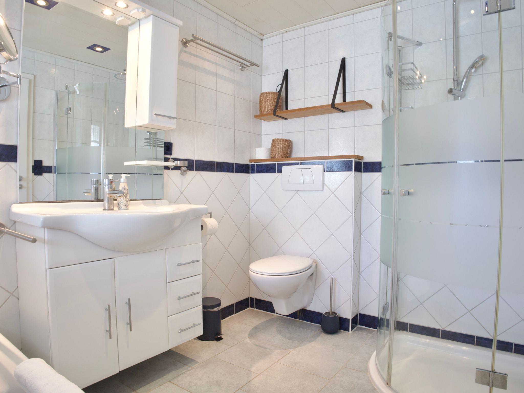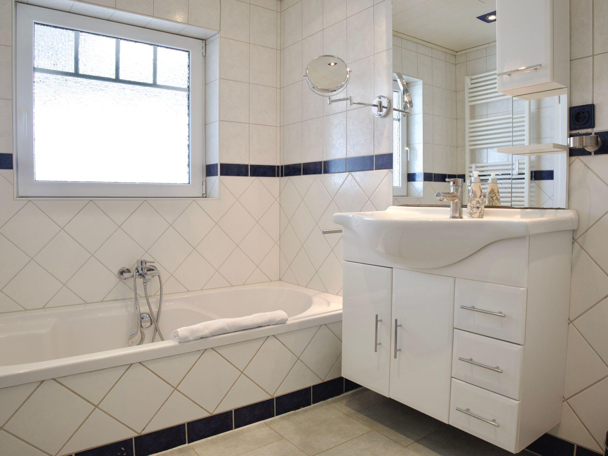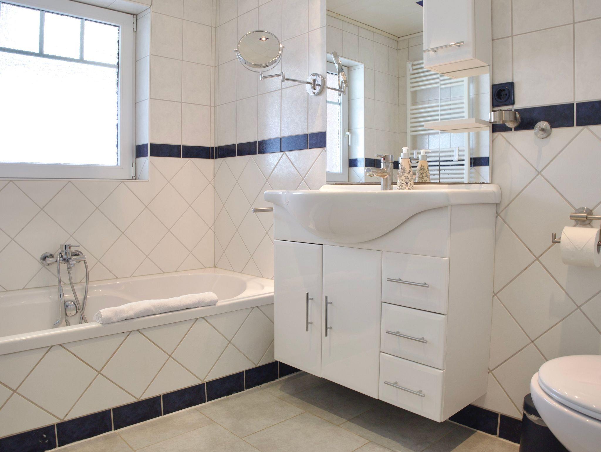 Das großzügig geschnittene Badezimmer ist hell und ruhig gestaltet. Es verfügt über eine Badewanne, eine separate Dusche, ein Fenster sowie eine Handtuchheizung. Eine Waschmaschine steht ebenfalls zur Verfügung und ergänzt die Ausstattung sinnvoll.
