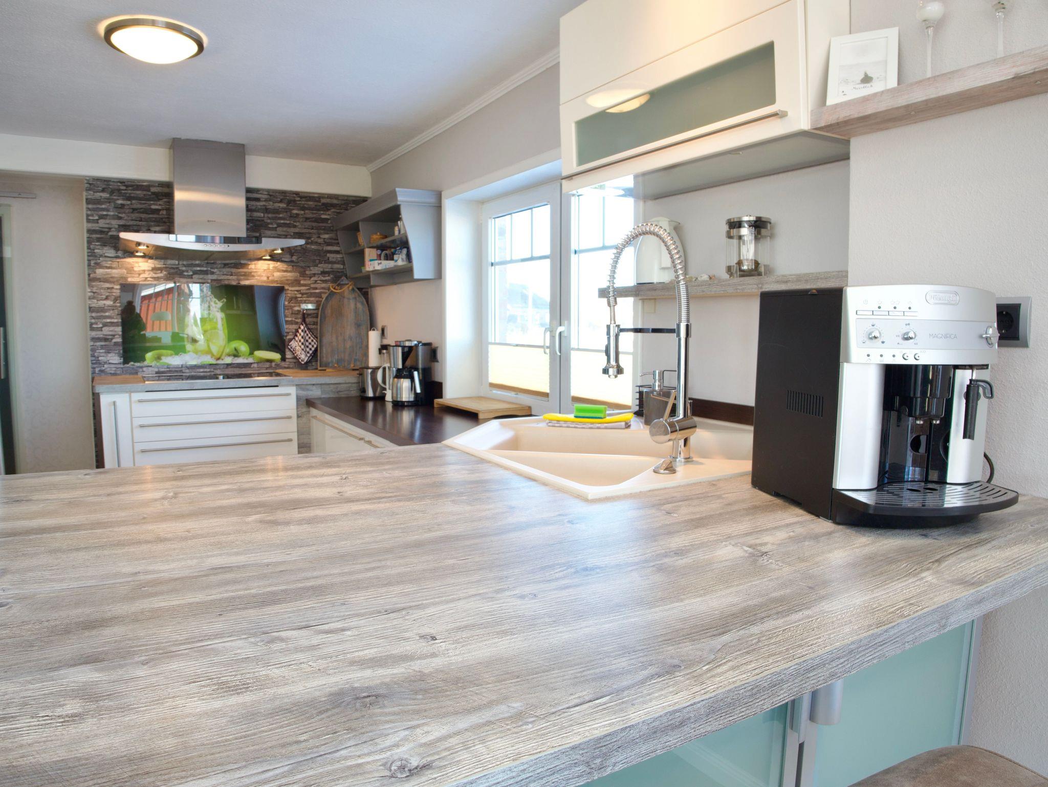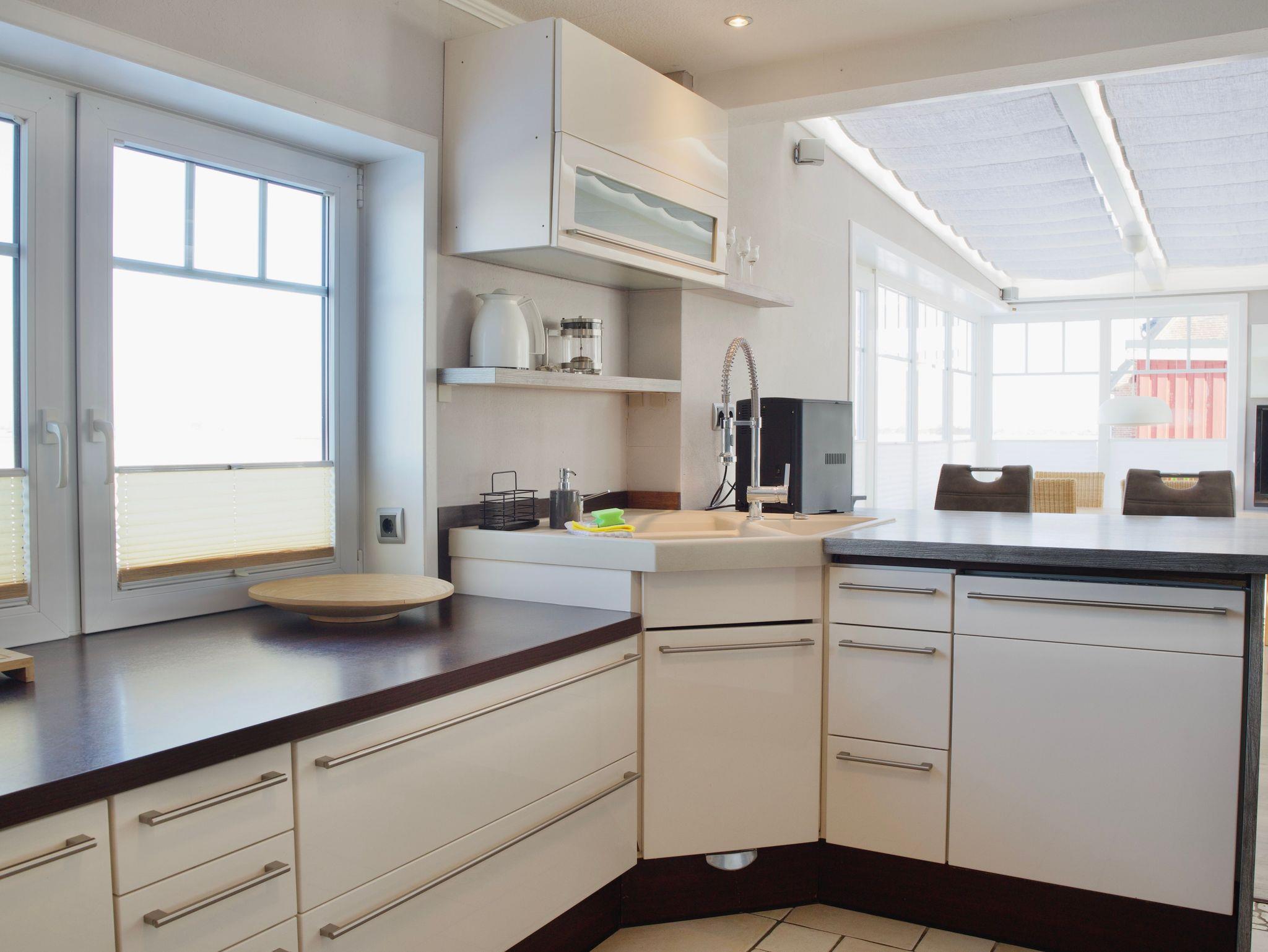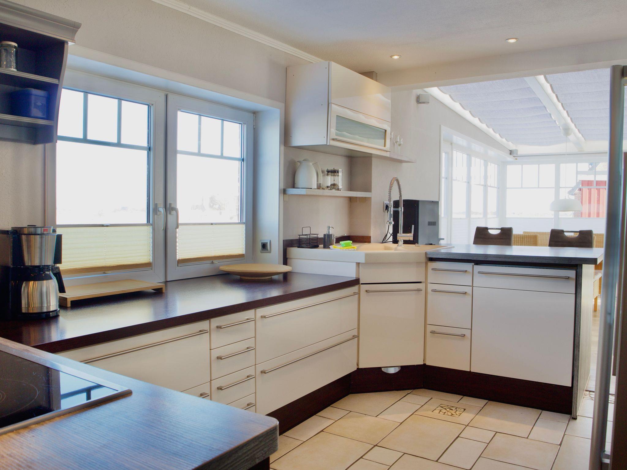 Die großzügige Eckküche ist offen in den Wohnraum integriert und in ruhigen, dezenten Farbtönen gehalten. Sie lässt keine Wünsche für die Selbstversorgung im Urlaub offen und verfügt unter anderem über eine Spülmaschine, eine Kaffeemaschine sowie eine Gefriermöglichkeit. Ein Fenster bringt Tageslicht in den Kochbereich und verbindet auch hier den Innenraum mit der umgebenden Landschaft.