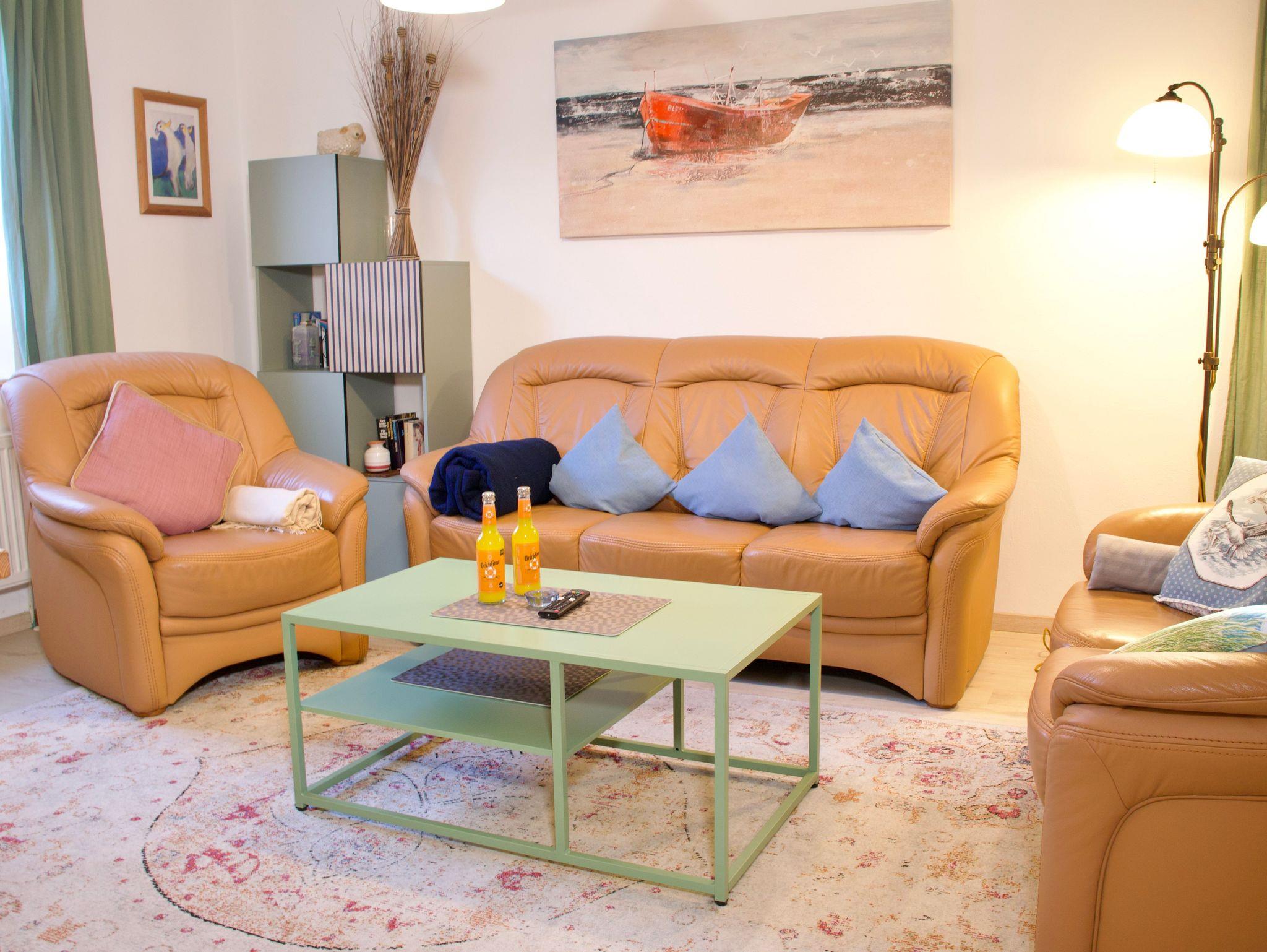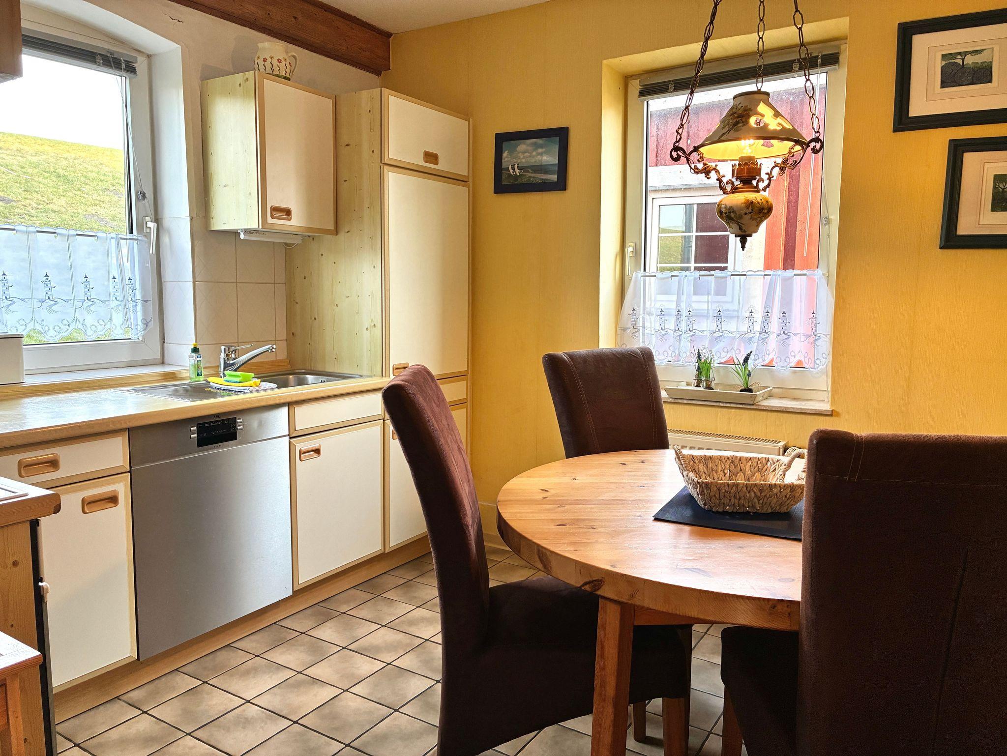 Das Wohnzimmer bietet viel Raum zum Ankommen und Entspannen, sodass jeder seinen Platz findet. Natürliche Materialien, Holzmöbel und liebevolle Details schaffen eine warme, wohnliche Atmosphäre. Die Küche ist zentral im Wohnbereich gelegen und lässt keine Wünsche für die Selbstversorgung im Urlaub offen. Sie verfügt unter anderem über eine Spülmaschine, eine Gefriermöglichkeit, sowie eine Kaffeemaschine und bildet mit der angrenzenden Essecke den Mittelpunkt der Wohnung für gemeinsame Mahlzeiten und gesellige Stunden.