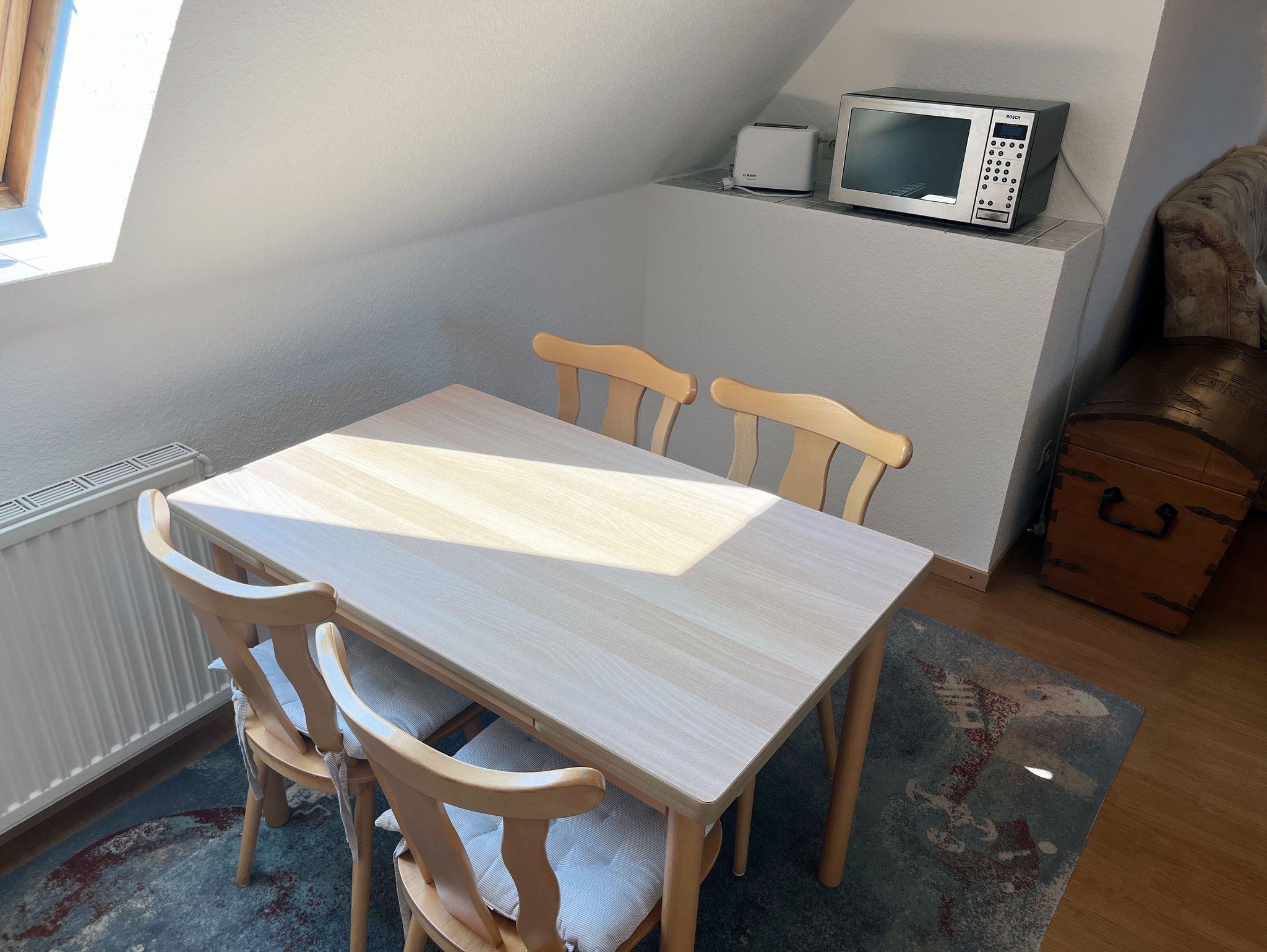 Die Fewo 2 ist ausgestattet für zwei Personen mit einem Schlafzimmer (1,8 x 2 m) und einem großzügigen Wohn/Esszimmer, sowie einer Küchenzeile und Duschbad. Die Wohnung liegt im zwar im 1. Stock, dennoch ist eine Terrasse samt Standkorb im Garten vorhanden.