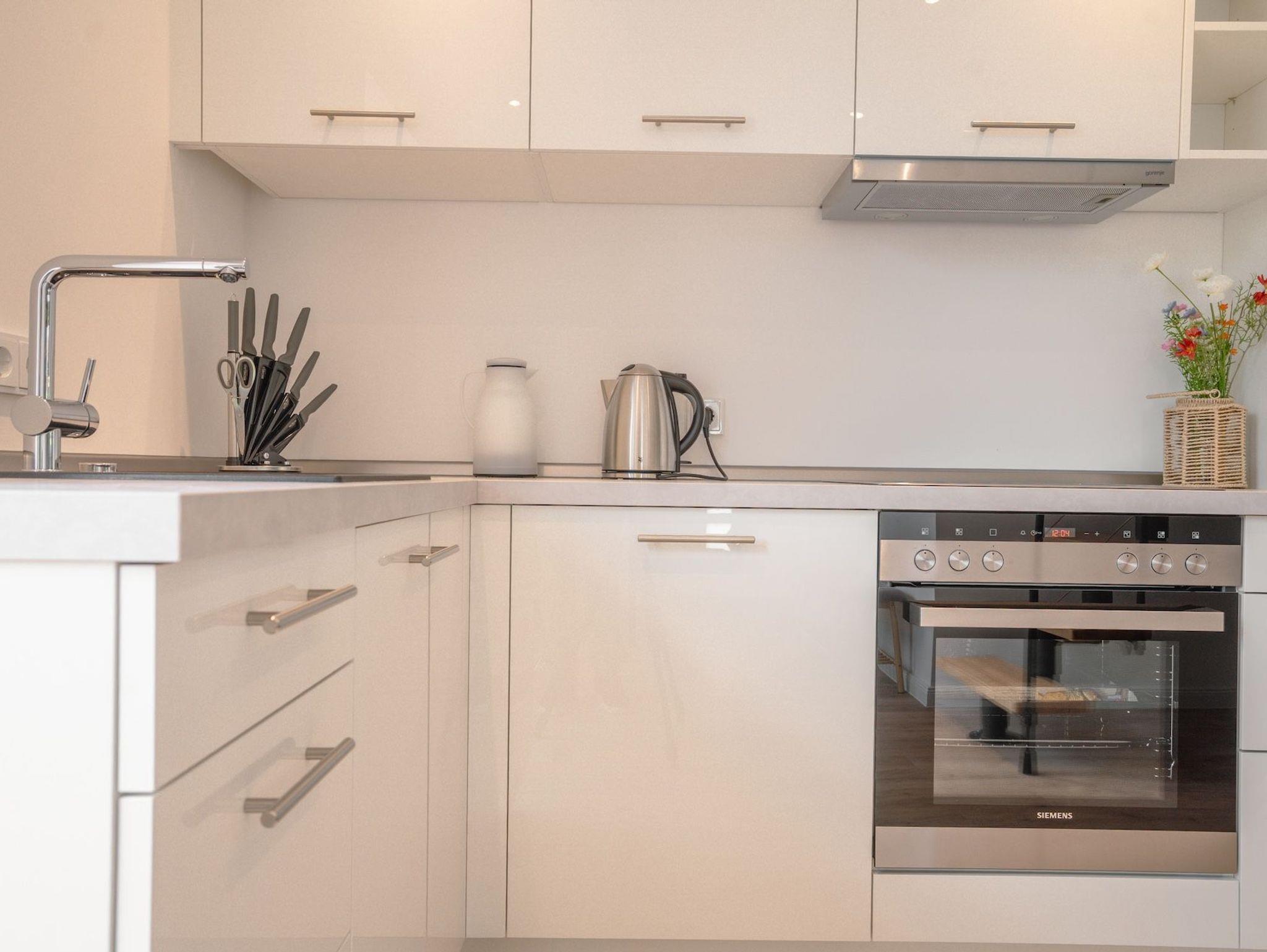 Voll ausgestattete Küche mit Spülmaschine, Backofen, Ceranfeld & Kaffeemaschine