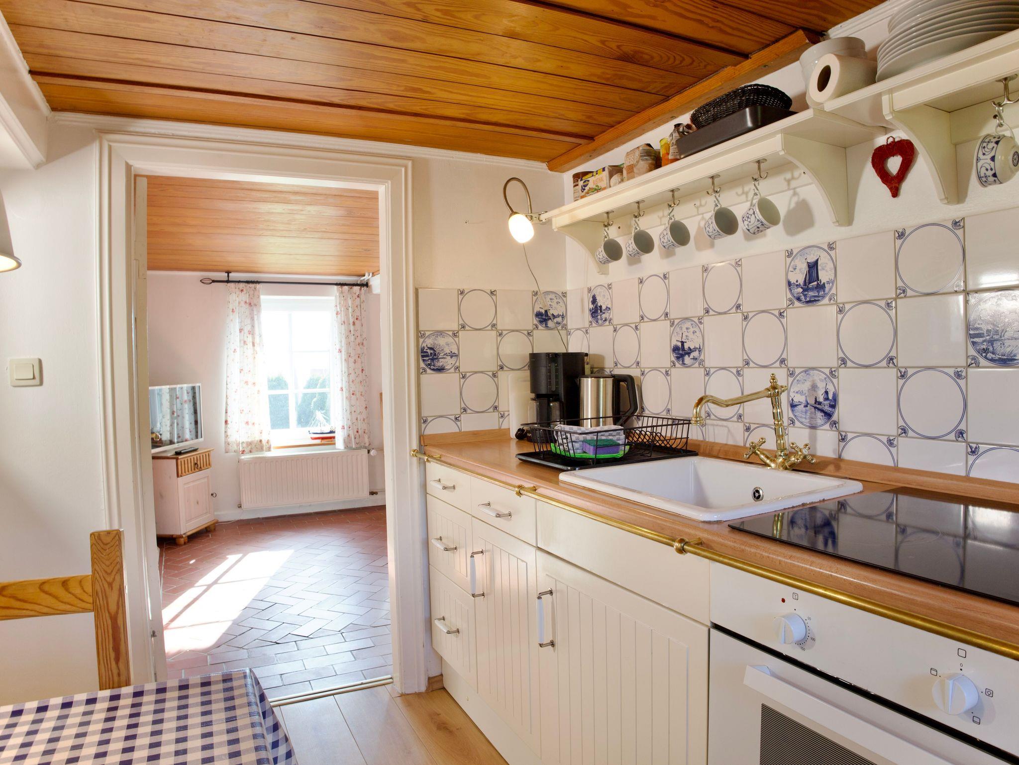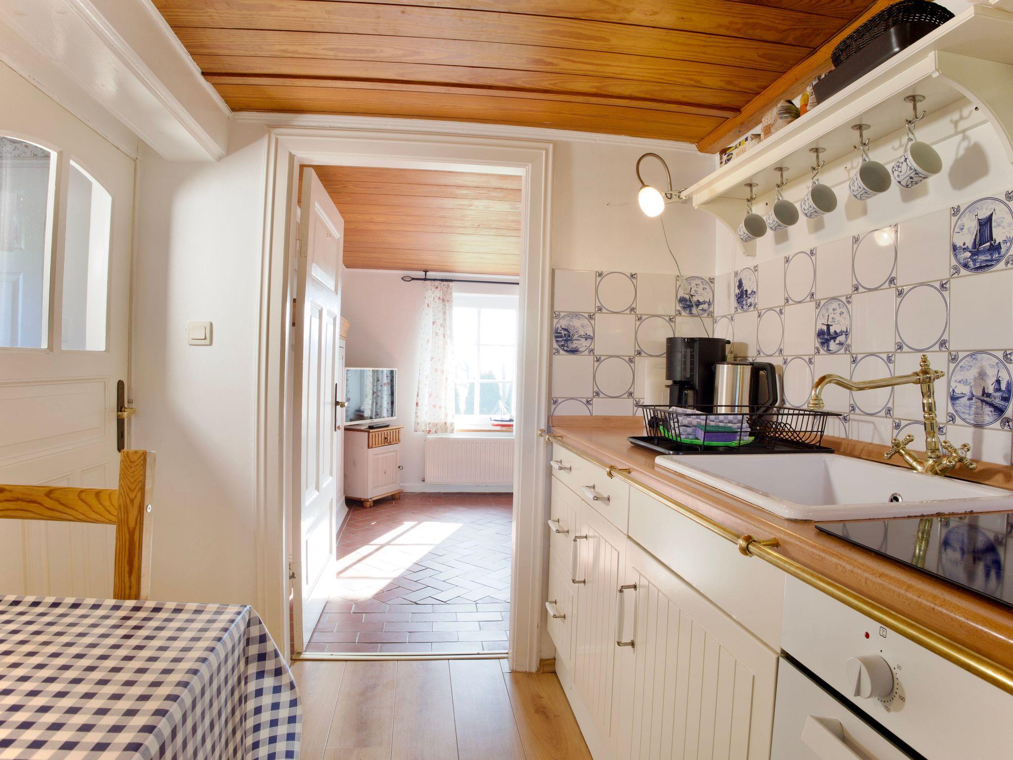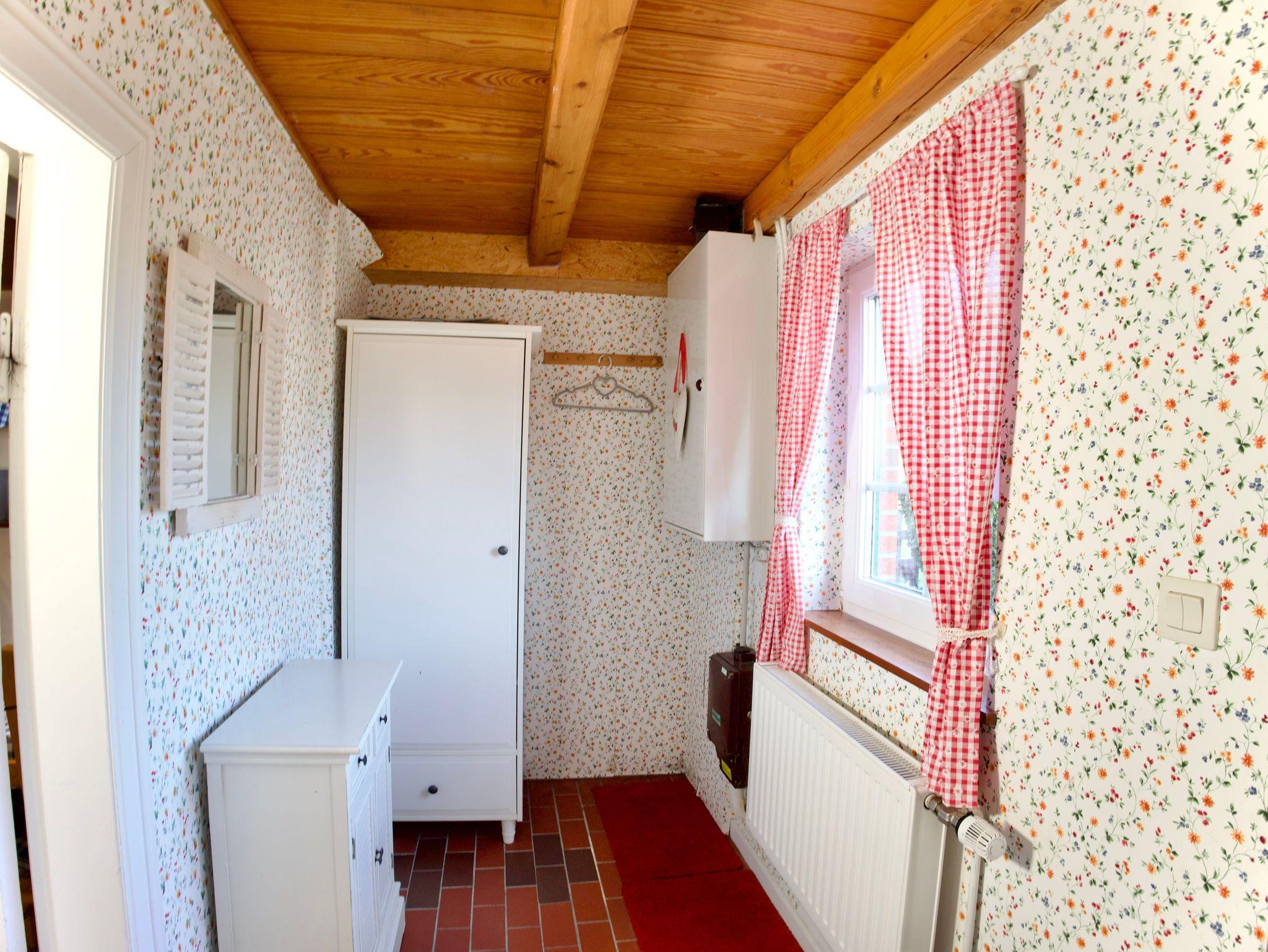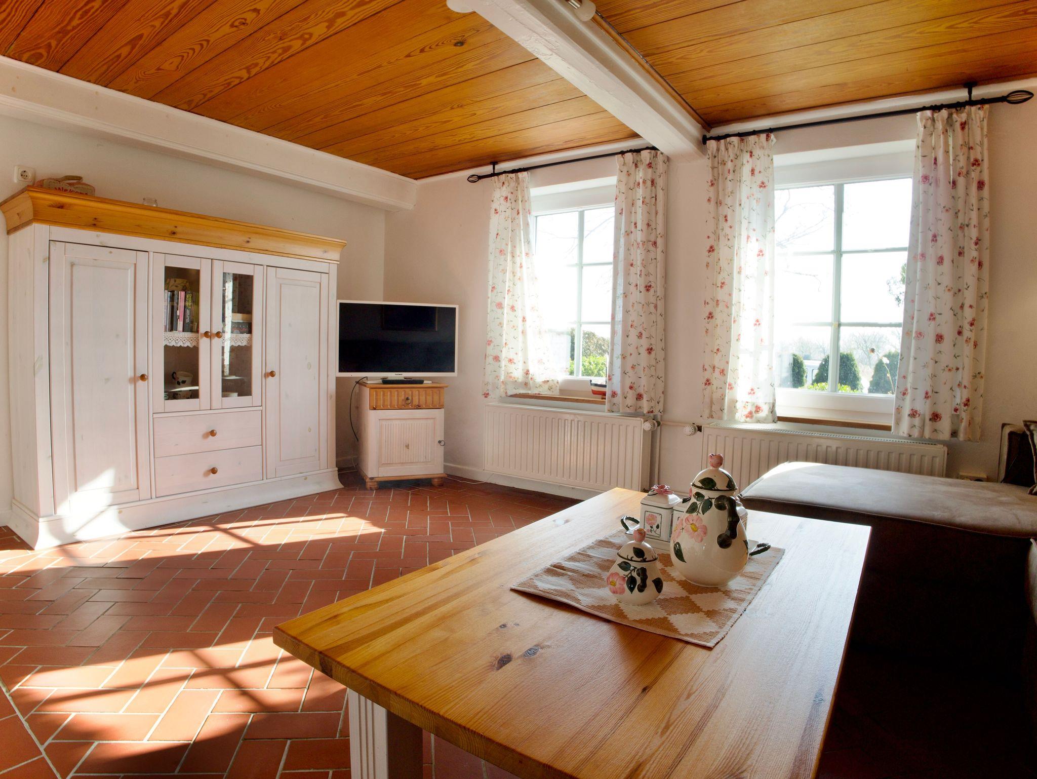 Die niedrigen Decken mit freiliegendem Balkenwerk und holzvertäfelten Flächen prägen den besonderen Charme des Hauses und schaffen eine behagliche, geschützte Atmosphäre. Helle, warme Farbtöne, florale Tapeten und die geschmackvoll ausgewählte Einrichtung unterstreichen den verspielt-nostalgischen Stil und machen das Friesenhus zu einem sehr persönlichen Rückzugsort.