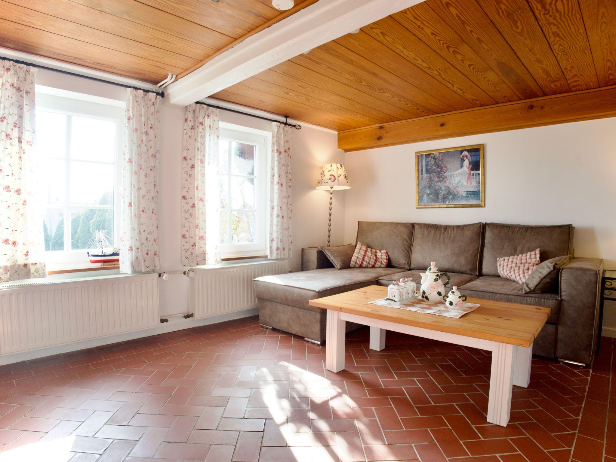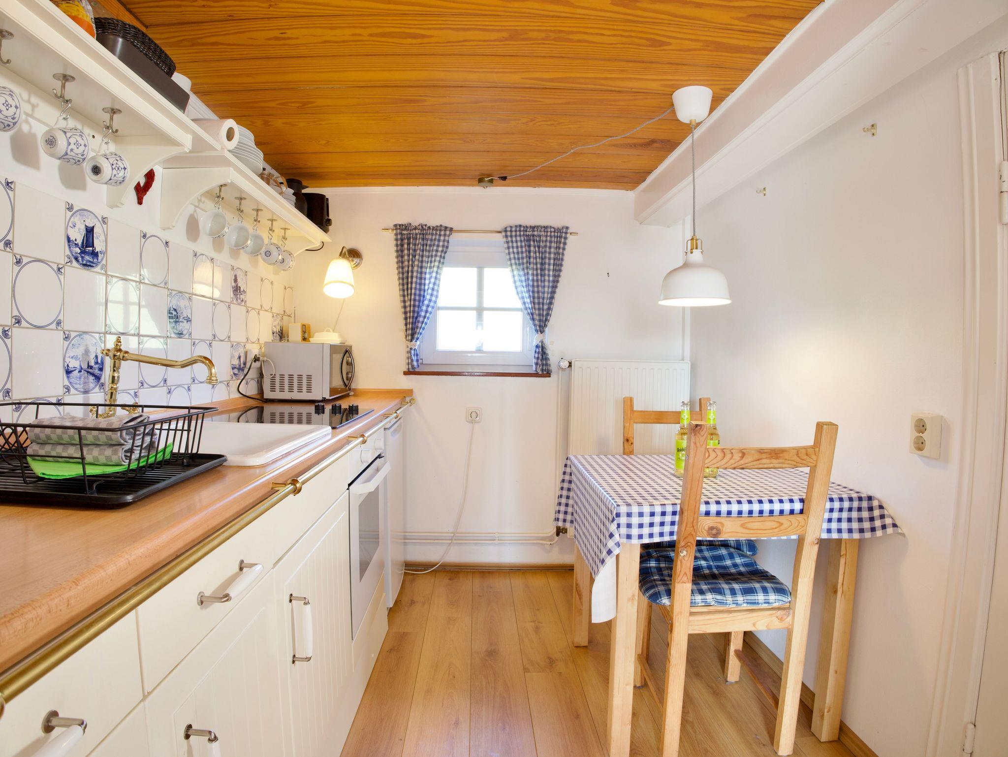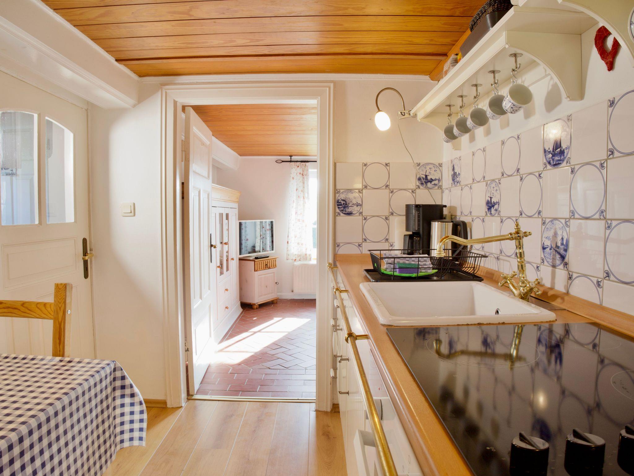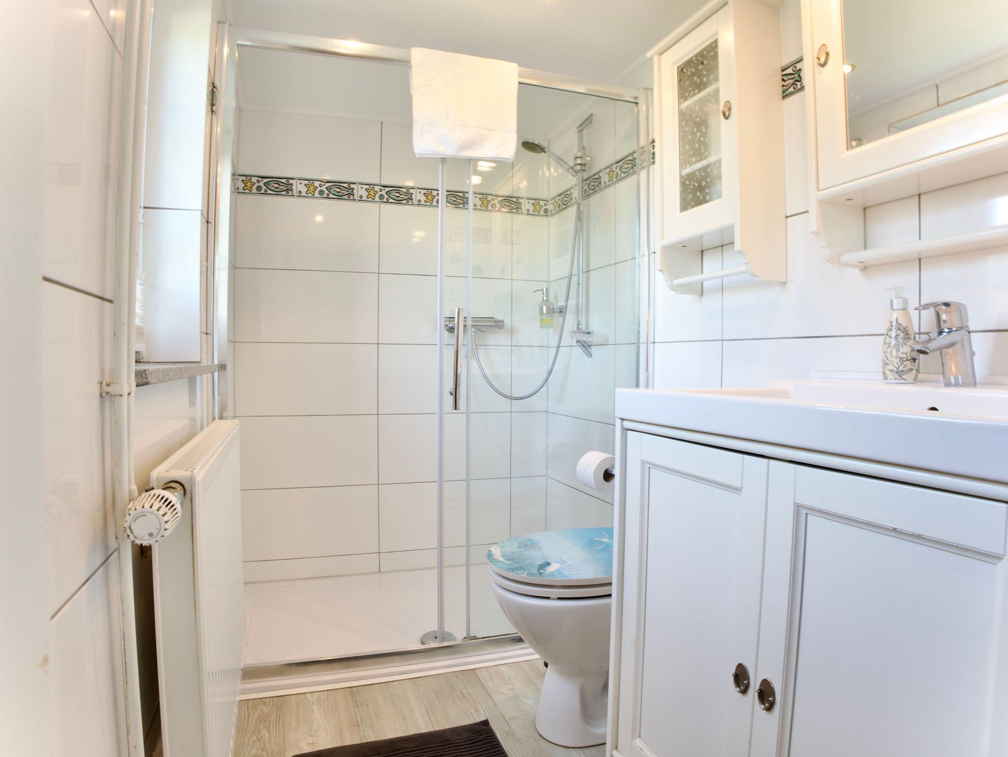 Im Erdgeschoss befinden sich das moderne Duschbad mit bodengleicher Dusche, die helle Küche mit Holzakzenten und maritimer Gestaltung sowie das Wohnzimmer mit gemütlicher Sitzecke. In der Küche lädt eine Essgarnitur zu gemeinsamen Mahlzeiten ein, während der Wohnbereich Raum für entspannte Stunden bietet.