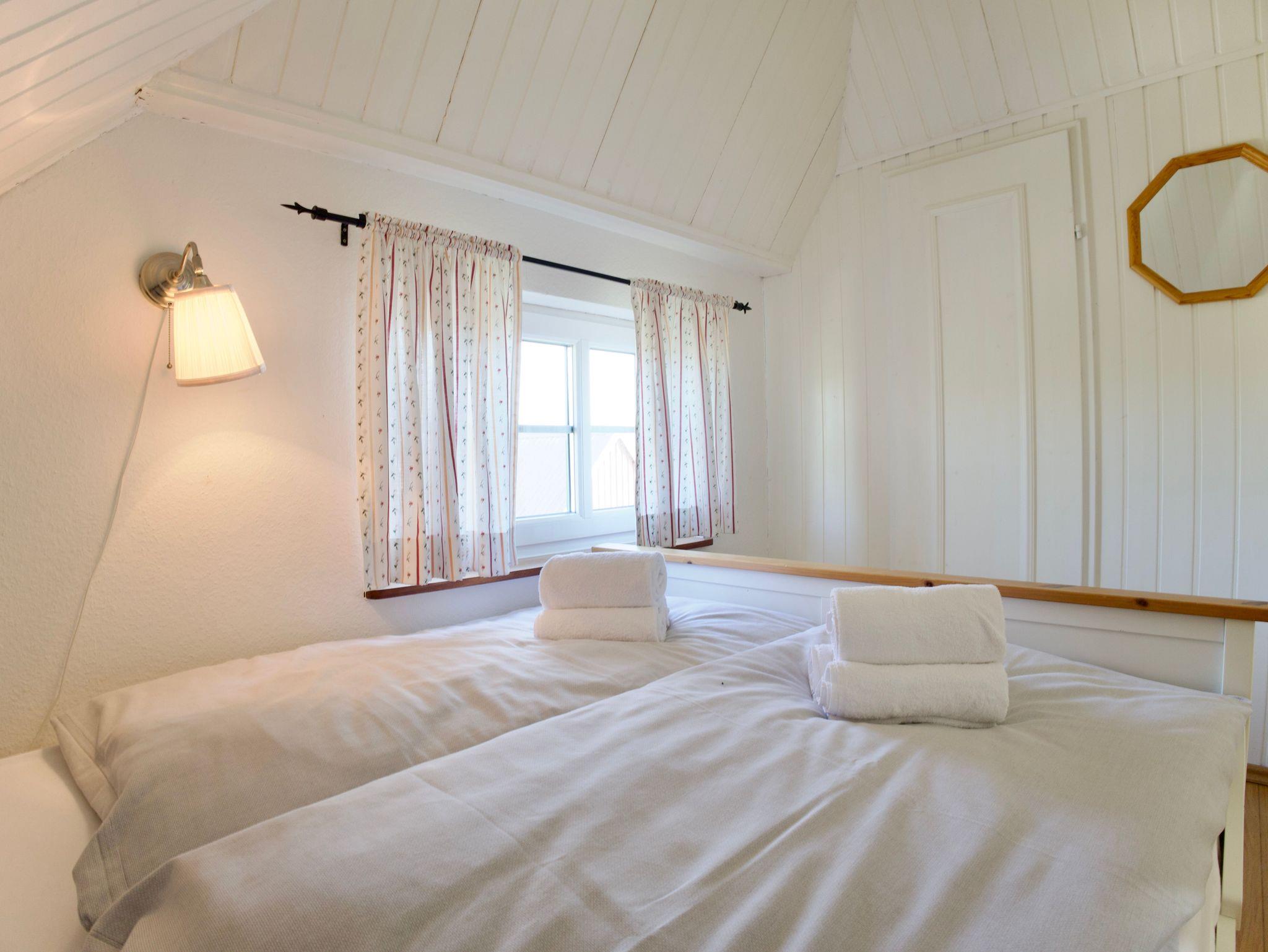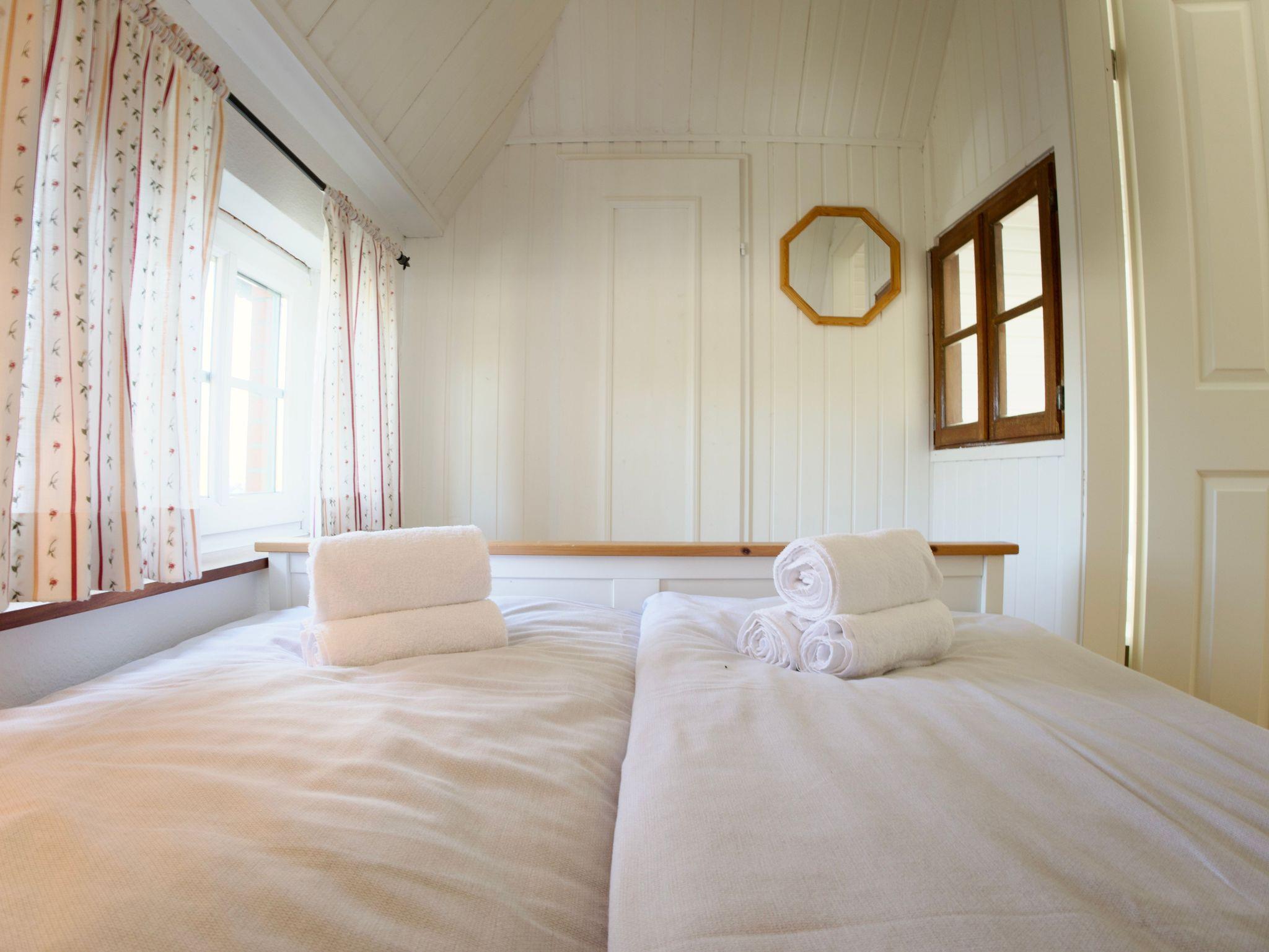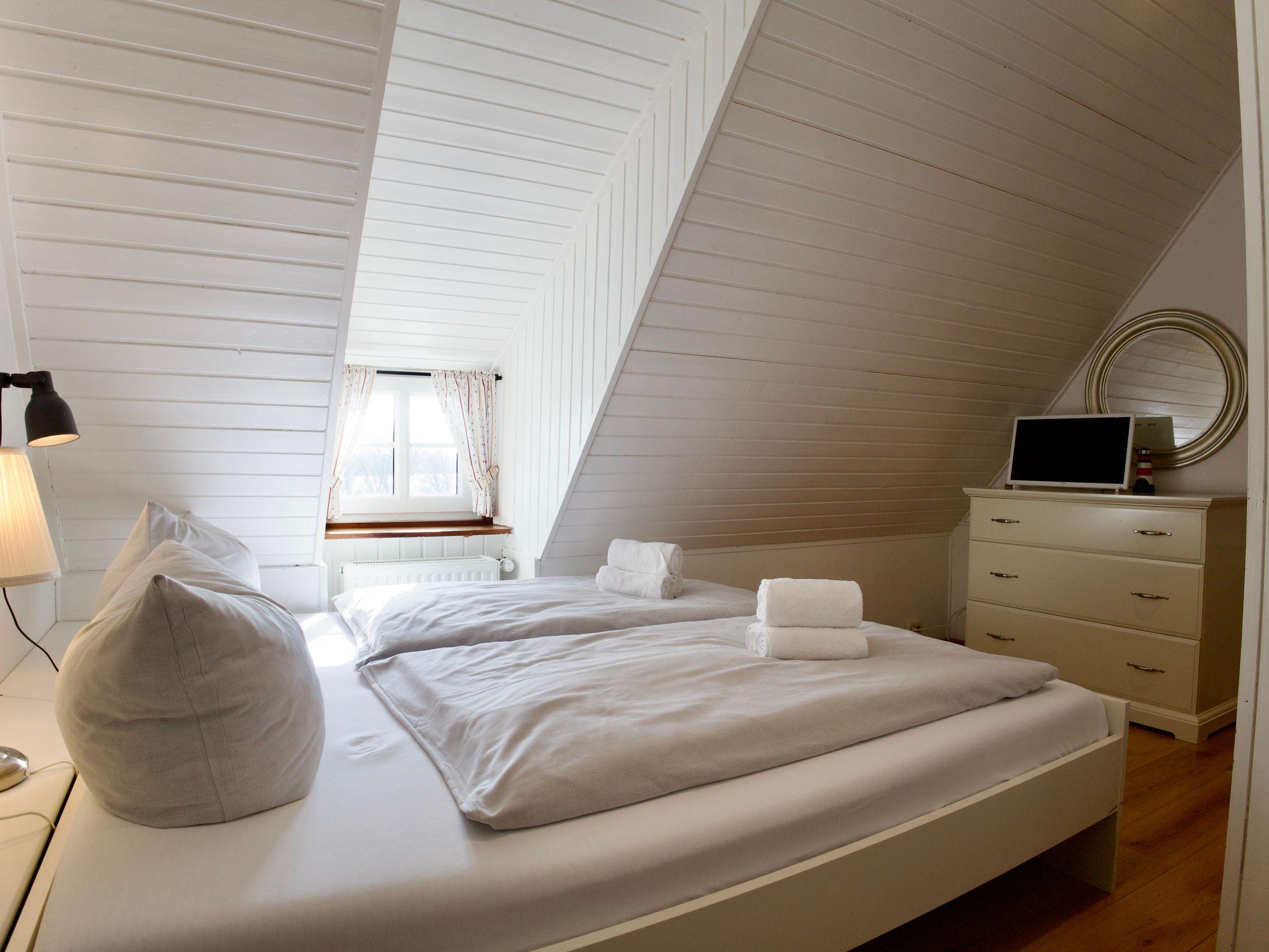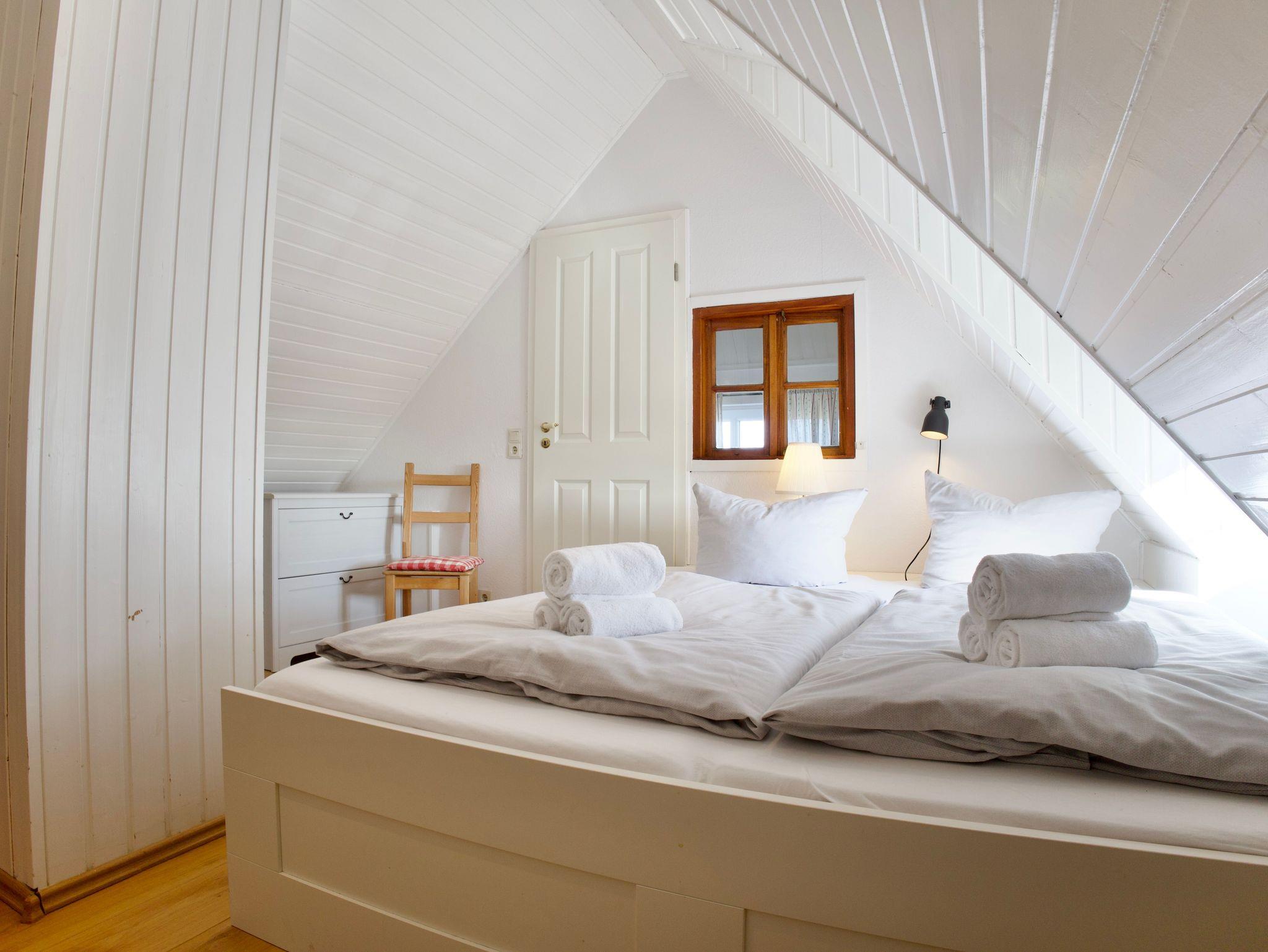 Über eine Holztreppe gelangen Sie in das Obergeschoss. Hier liegt das offen gestaltete Schlafgeschoss mit einem Doppelbett in der Größe 180 × 200 Zentimeter. Dahinter befindet sich ein weiteres, kleineres Schlafzimmer mit französischem Doppelbett in der Größe 120 × 200 Zentimeter. Beide Räume sind mit weißer Holzvertäfelung gestaltet und vermitteln eine ruhige, leichte Wohnatmosphäre.
