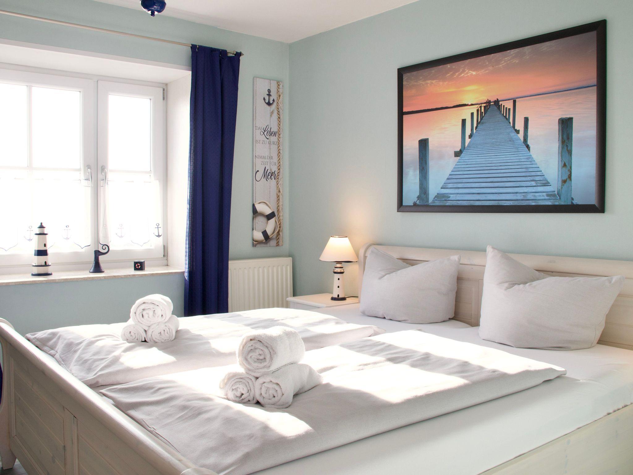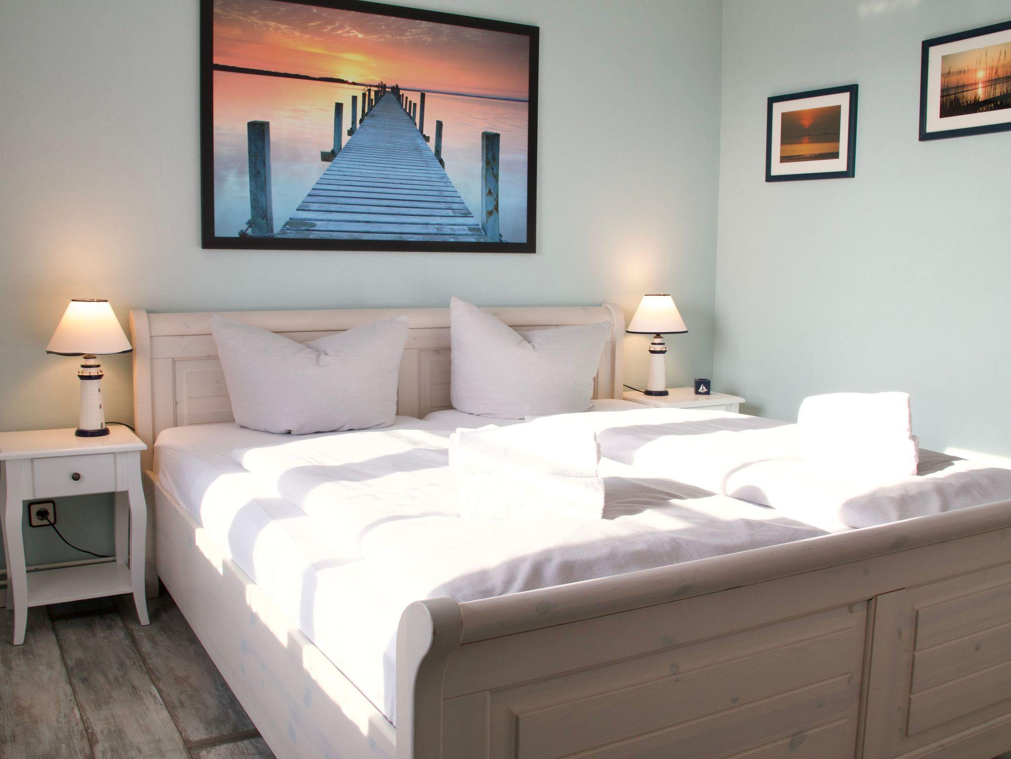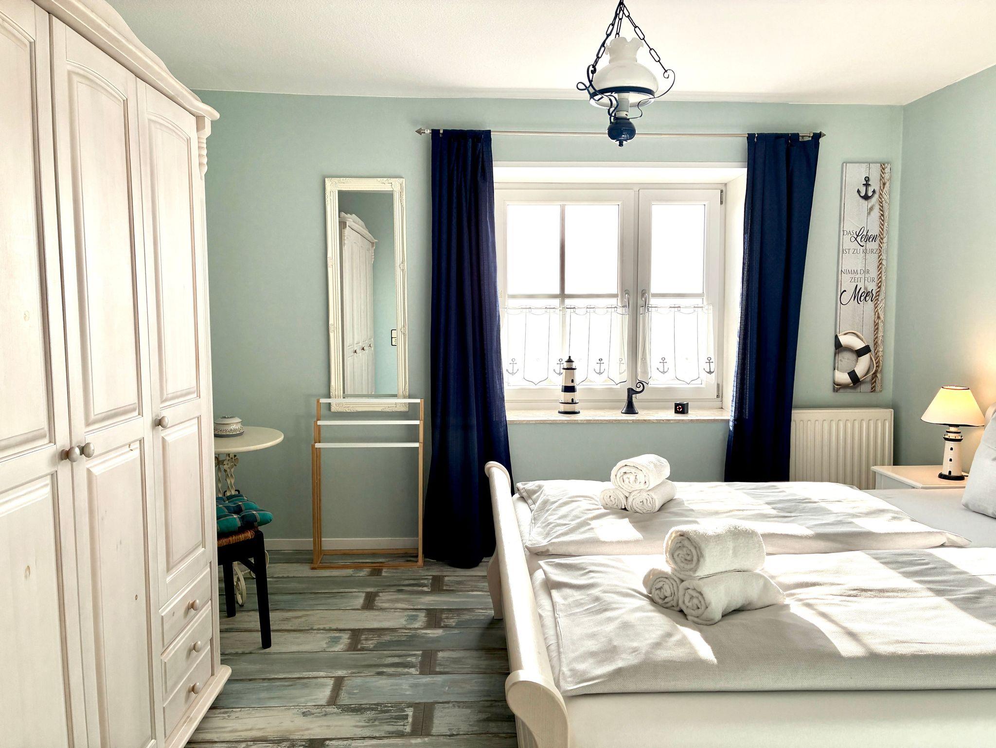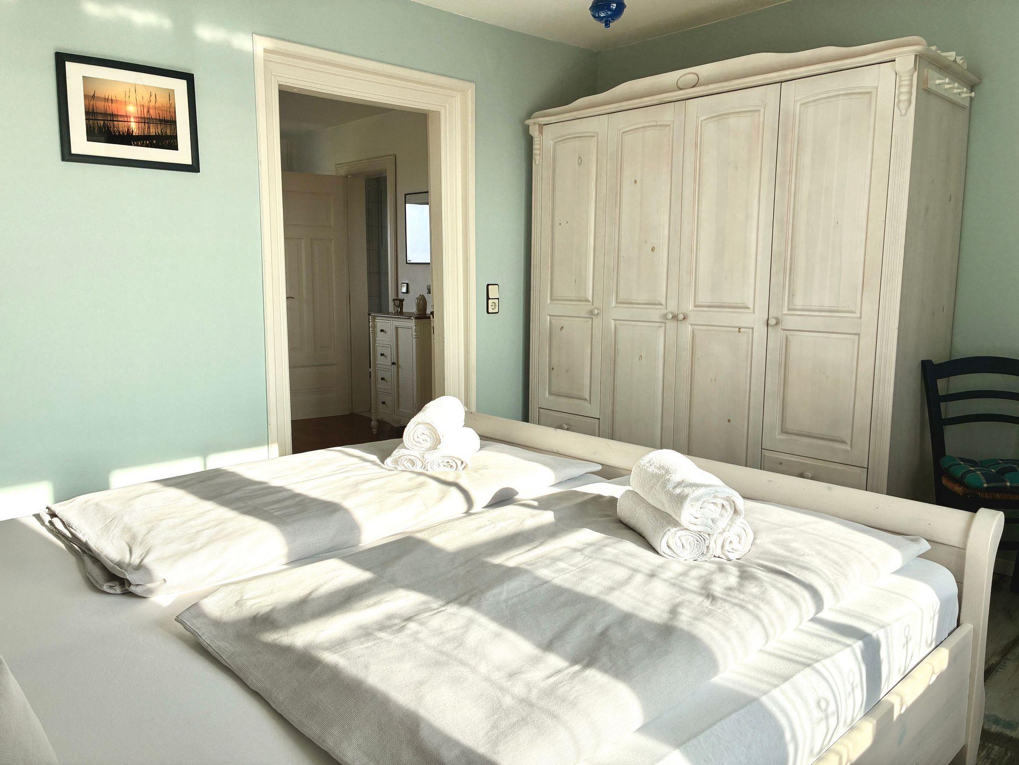 Die rund 38 Quadratmeter große Wohnung ist für zwei Personen eingerichtet und überzeugt durch eine ruhige, klar strukturierte Gestaltung. Natürliche Holzelemente in den Möbeln verleihen den Räumen eine warme, angenehme Atmosphäre. Das Schlafzimmer ist mit einem Doppelbett und einem Kleiderschrank ausgestattet und bietet einen übersichtlichen, aufgeräumten Rückzugsort für erholsame Nächte.