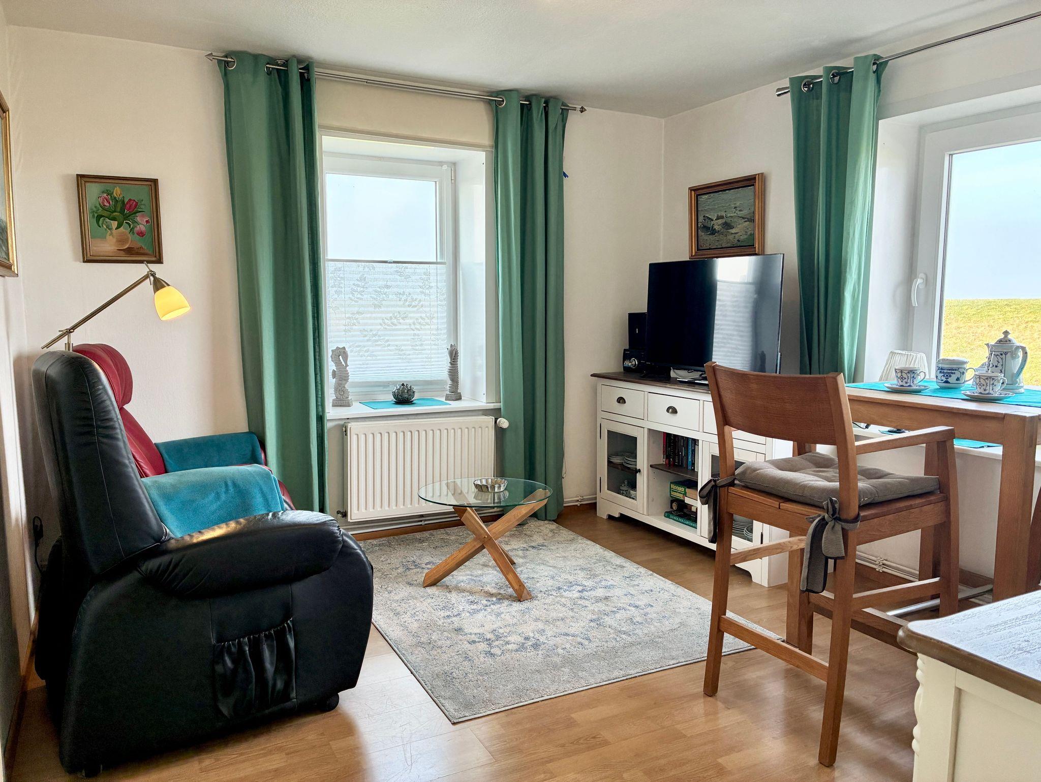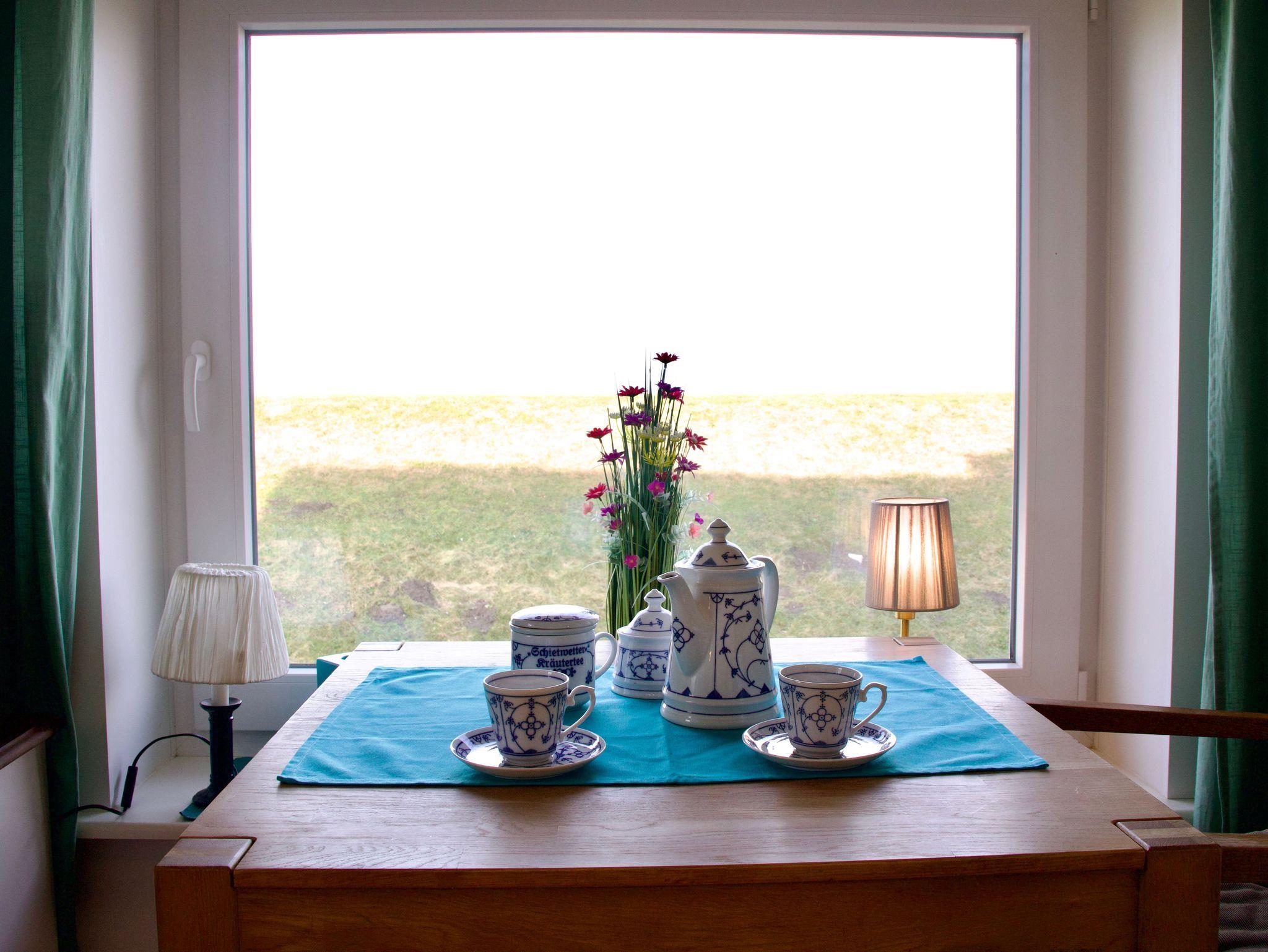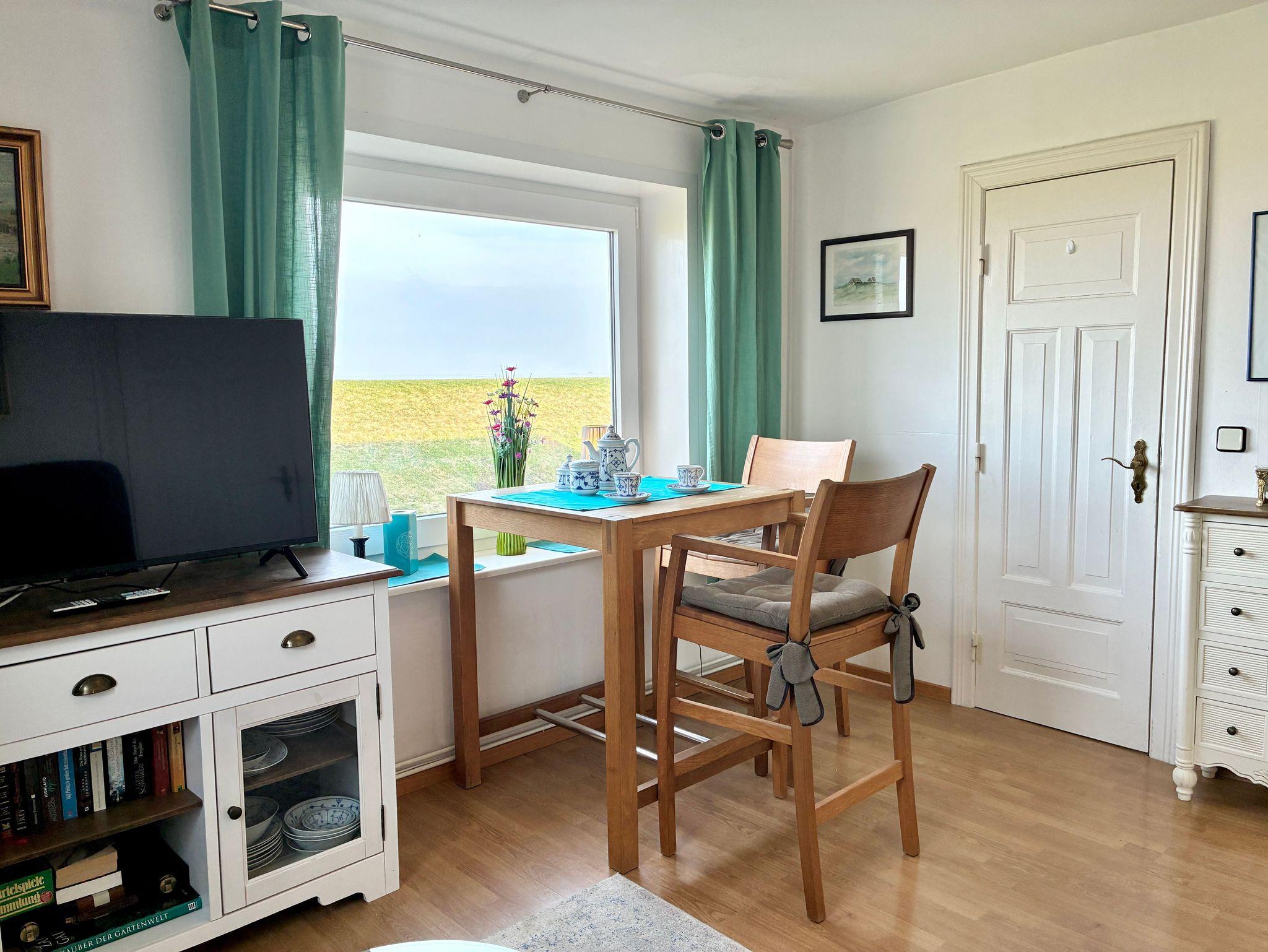Die Ferienwohnung Westwind befindet sich im ersten Obergeschoss des Kapitänshus und liegt direkt am Außendeich. Durch diese besondere Lage eröffnet sich ein weiter, freier Blick über den Deich auf die Halligen, die Insel Pellworm und die offene Nordsee. Der Meerblick egleitet den Aufenthalt hier nahezu durchgehend und macht die Weite der Nordsee zu einem festen Bestandteil des Wohngefühls.