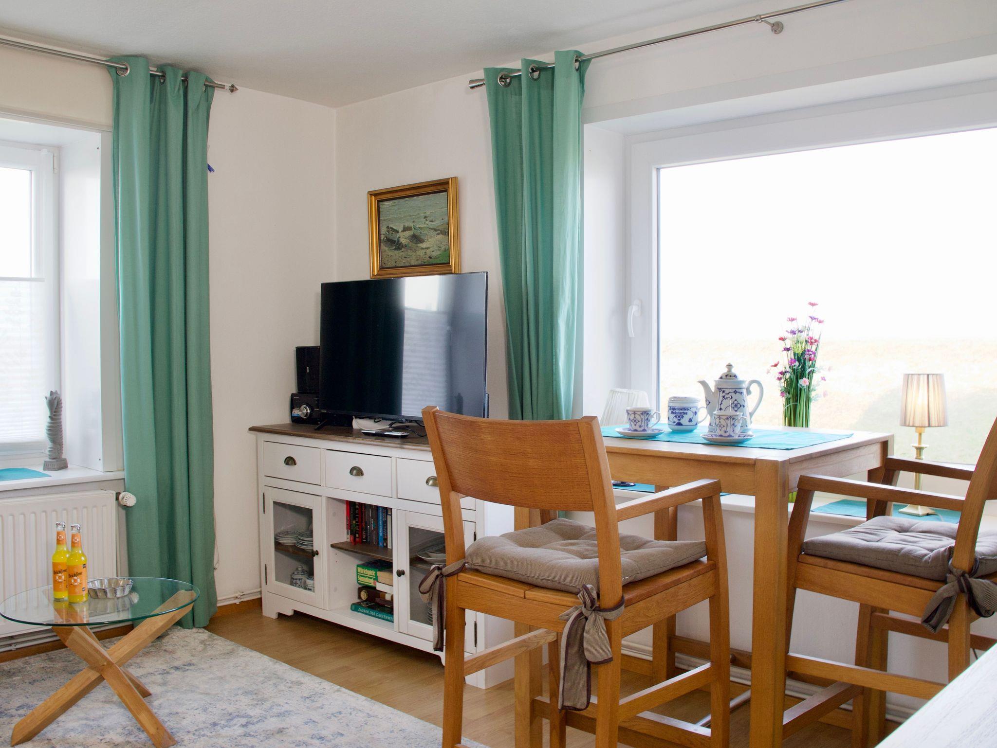 Die Wohnküche bildet den Mittelpunkt der Wohnung. Der Esstisch steht direkt am Fenster und ermöglicht einen freien Blick nach draußen, sodass Mahlzeiten stets von der Küstenlandschaft und dem Meer begleitet werden. Die Küche lässt keine Wünsche für die Selbstversorgung im Urlaub offen und verfügt unter anderem über eine Kaffeemaschine sowie eine Gefriermöglichkeit. Von der Wohnküche aus gelangen Sie direkt in das helle und freundlich gestaltete Duschbad.