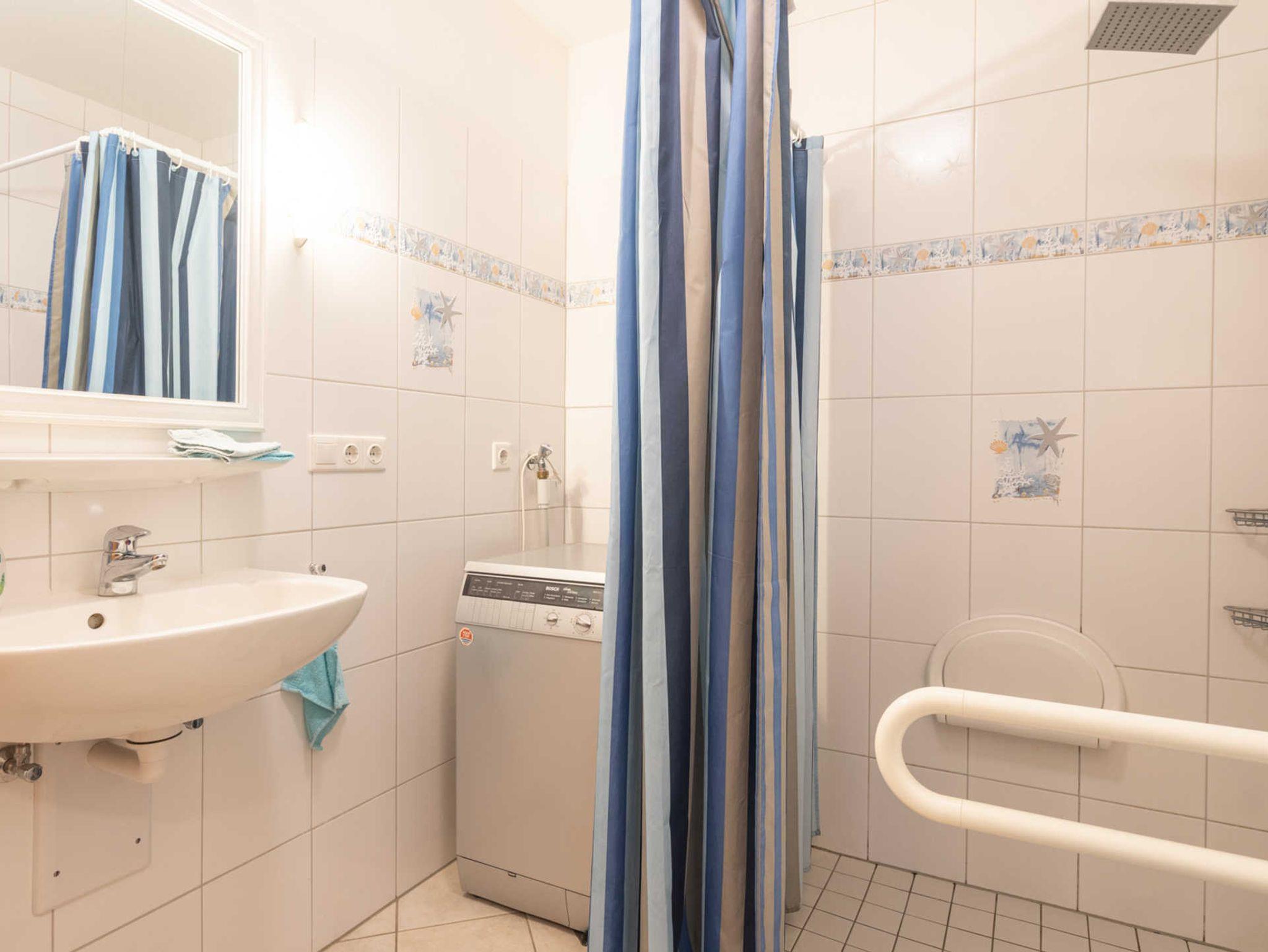 Der Sanitärbereich ist mit einer ebenerdigen begehbaren, barrierefreien Dusche ausgestattet.