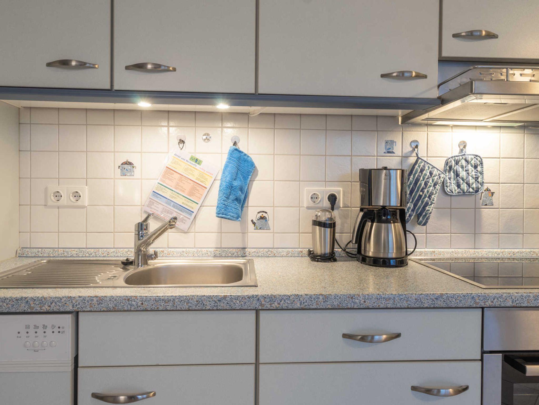 Die offene Einbauküche bietet sämtlichen Komfort, sodass Sie sich in Ihrem Urlaub komplett selbständig versorgen können. Hier stehen Ihnen unter anderem eine Kaffeemaschine, ein Backofen, Geschirrspüler und Gefrierschrank zur Verfügung. Direkt neben der Küchenzeile können bis zu 4 Personen am Esstisch Platz nehmen.