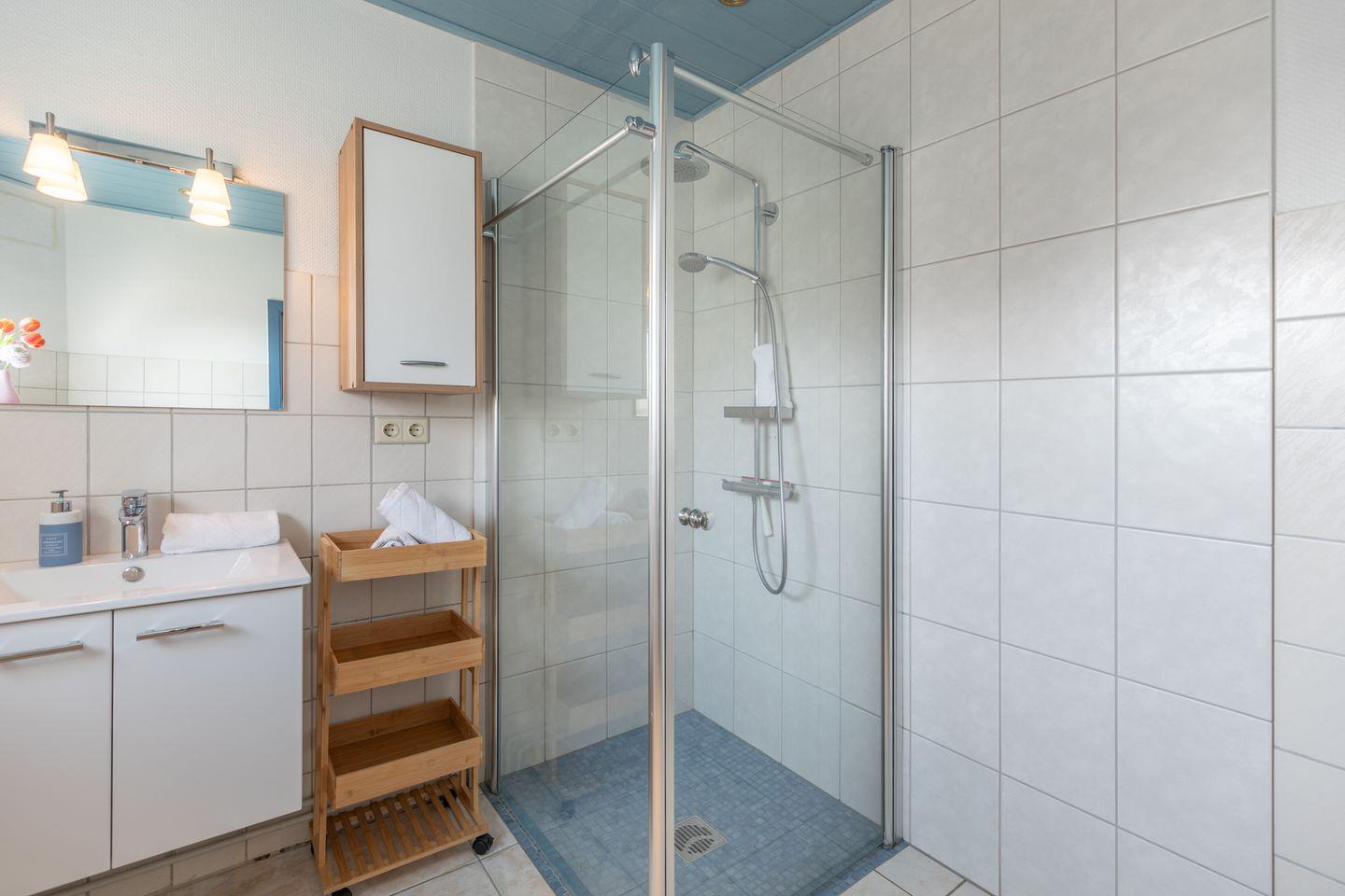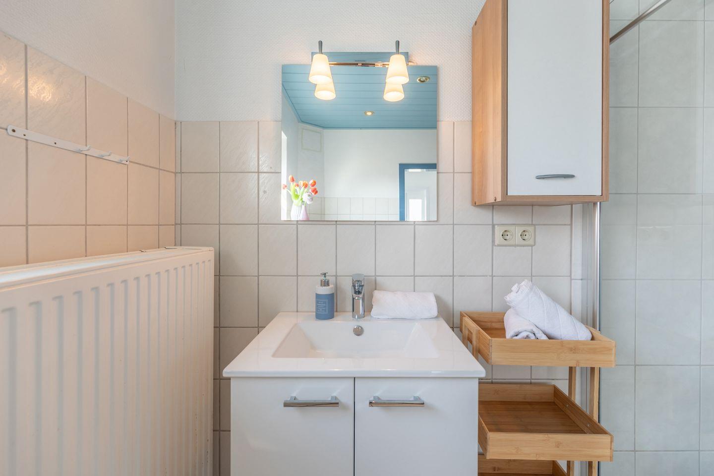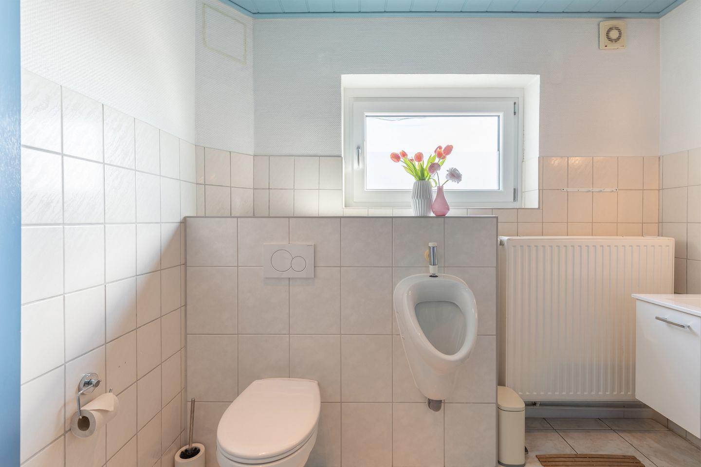 Das moderne Badezimmer ist mit einer Dusche, WC, Pissoir und Waschbecken eingerichtet.