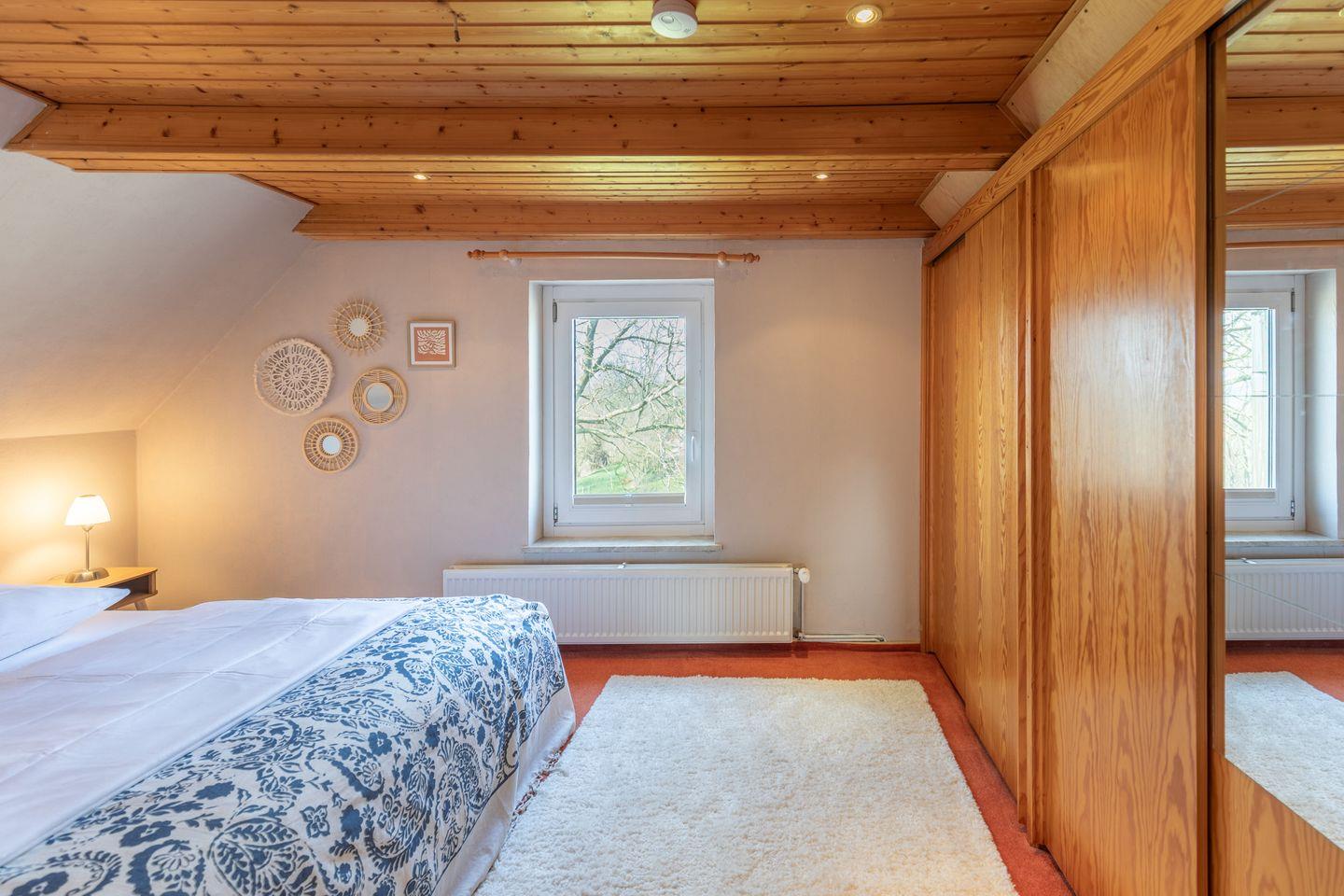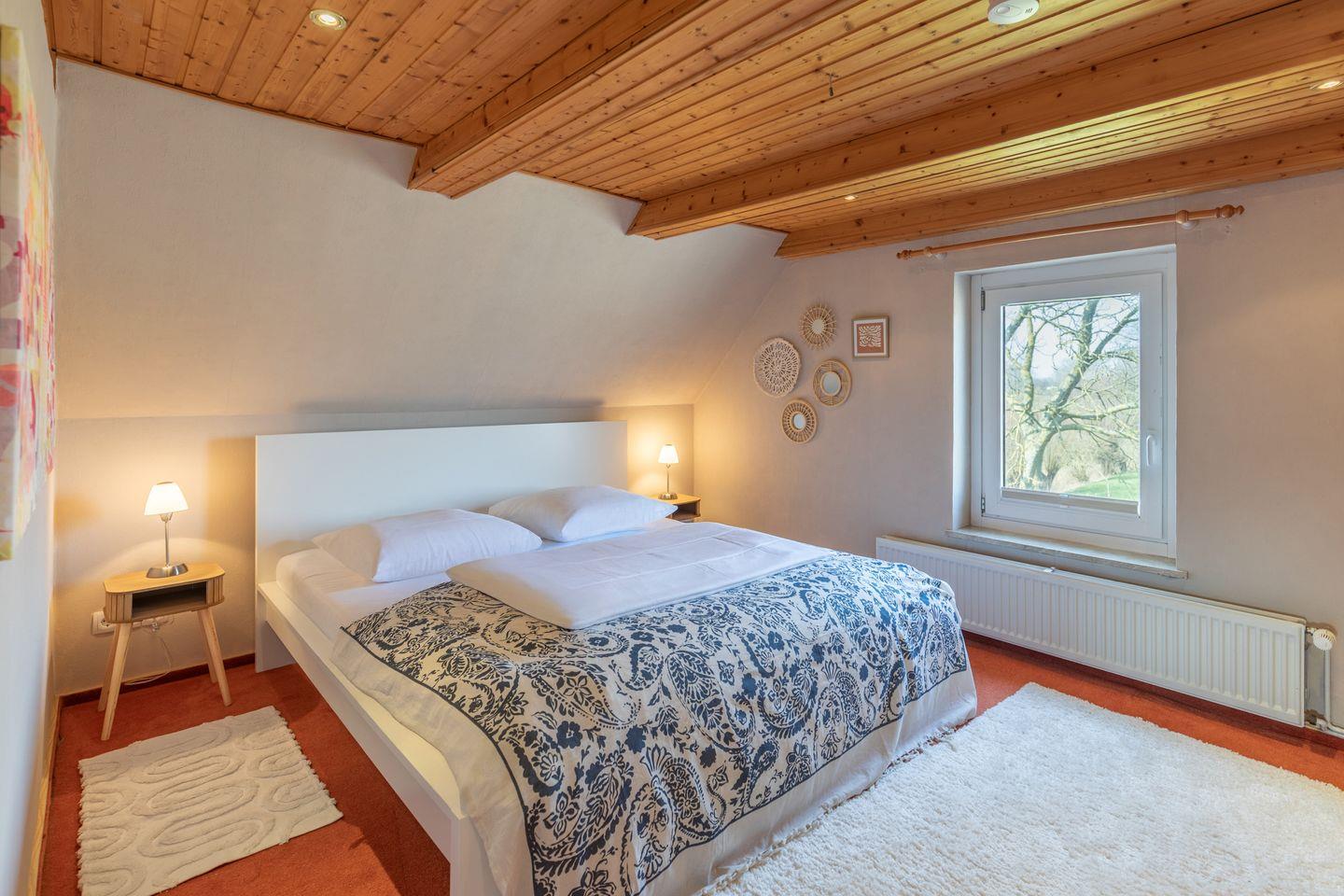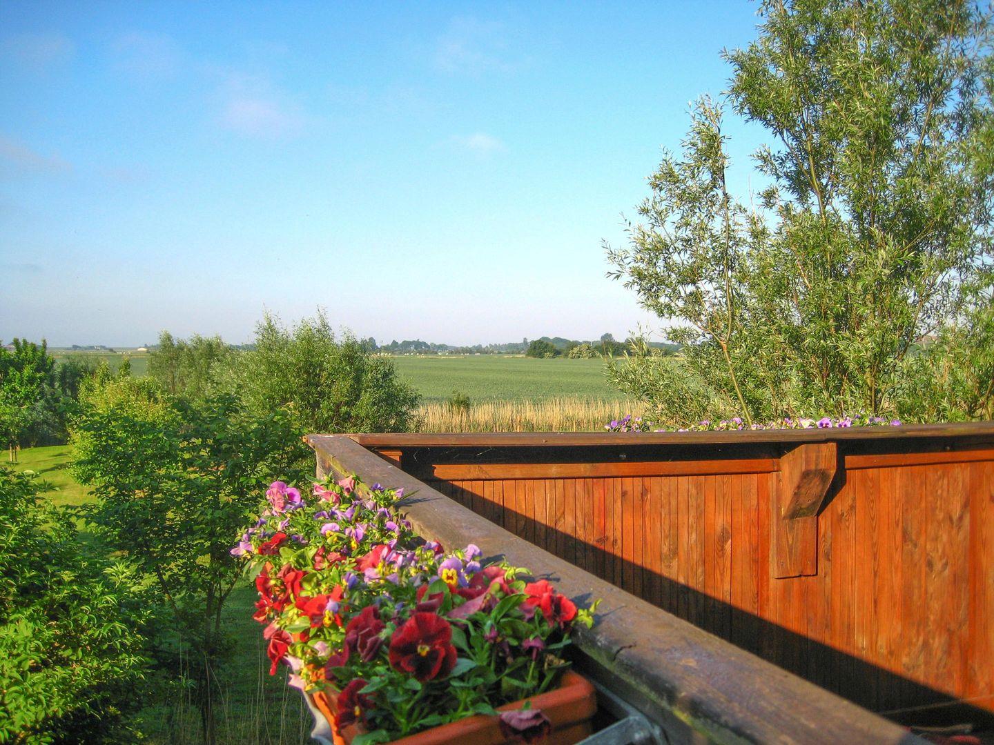 Das Ferienhaus verfügt über zwei Schlafzimmer (je ein Doppelbett, 180 x 200) beide im Obergeschoss und über eine recht steile Treppe erreichbar. Die Küche ist sehr gut ausgestattet: Ceranfeld, Backofen, Geschirrspülmaschine, Kühl/Gefrierschrank, Waschmaschine, Mikrowelle und Kaffeemaschine (Filtergröße 4). Der Wohnbereich verfügt über eine Sitzecke, einen Kaminofen und einen Flachbild-TV. Von hier aus haben Sie Zugang zu der Terrasse, auf der Sie den außergewöhnlichen Weitblick über die Felder genießen können. Liege- und Gartenstühle und ein Grill stehen für Sie bereit.