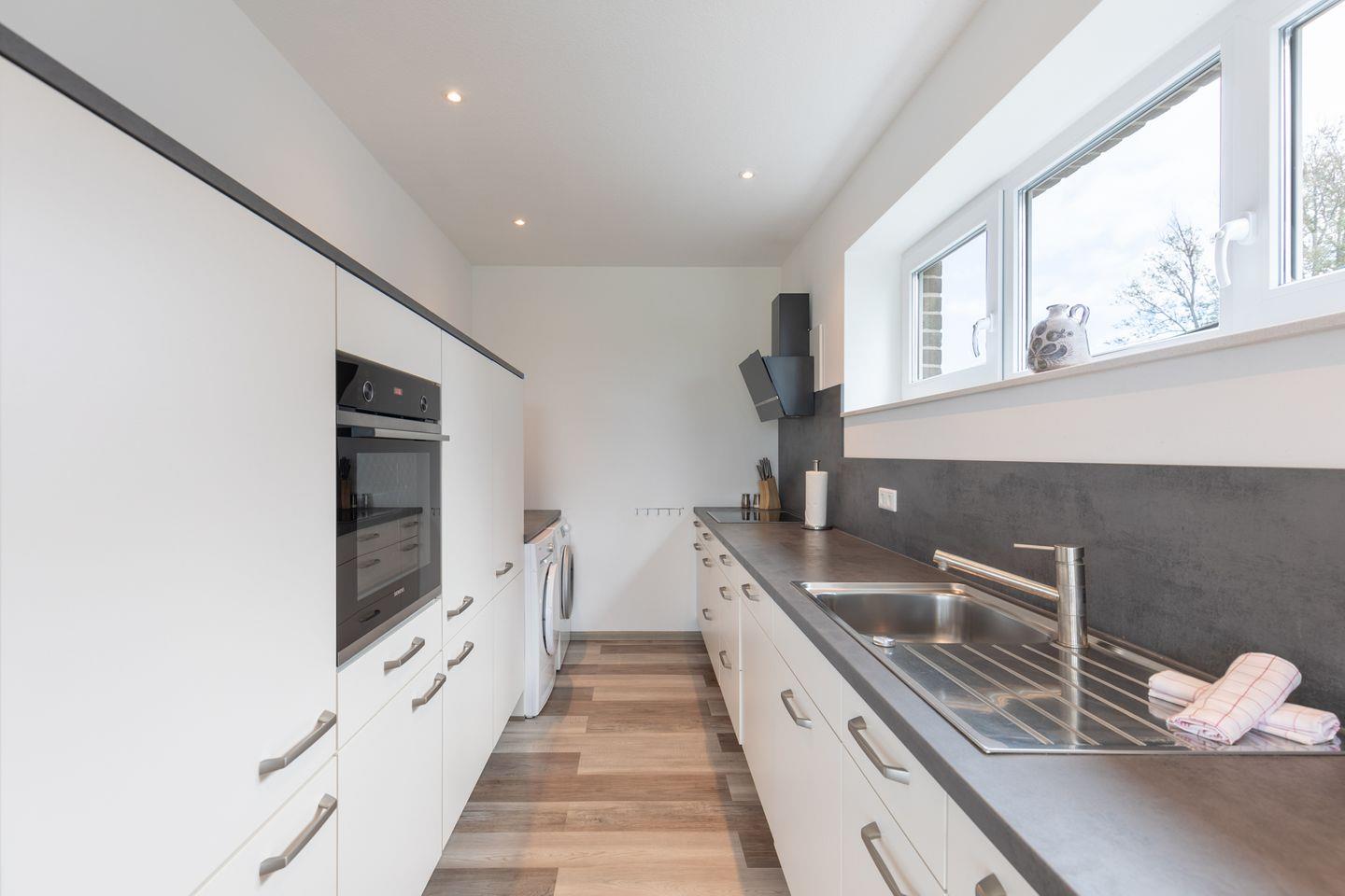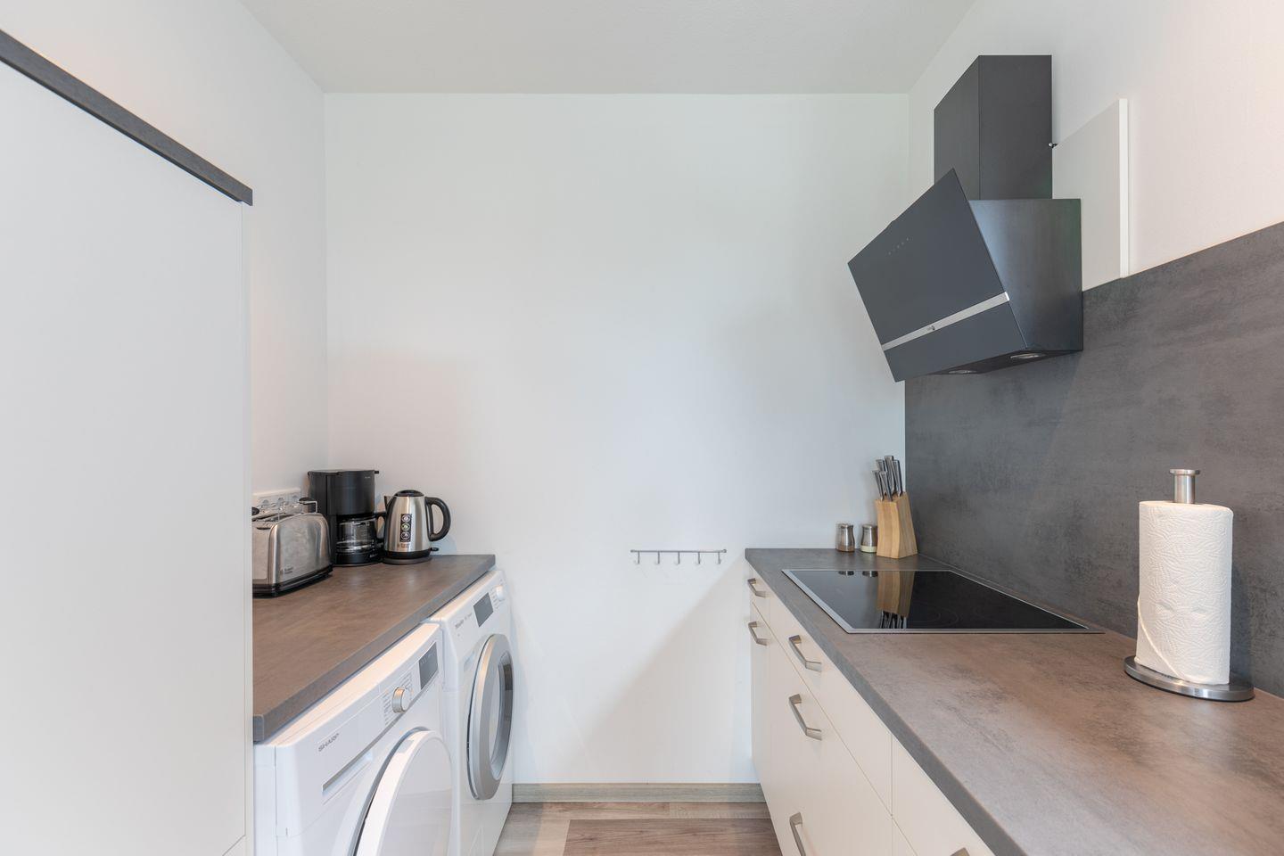 Die offene Küche ist sehr gut ausgestattet: Cerankochfeld, Backofen, Geschirrspülmaschine und Kaffeemaschine (Filtergröße 4), Waschmaschine und Trockner.