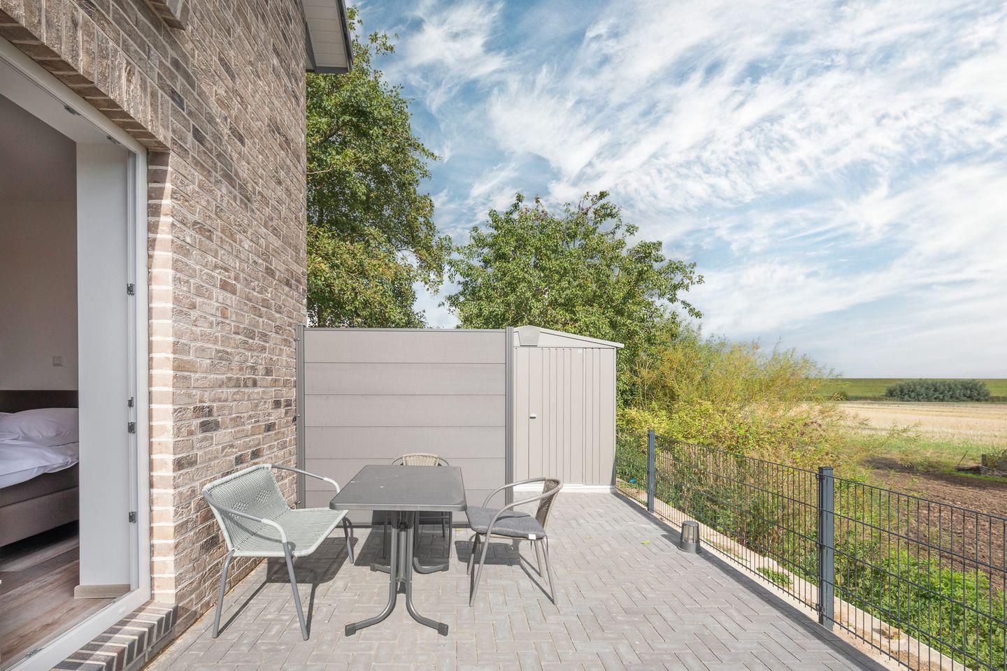 Auf der sonnigen Terrasse können Sie auf Gartenmöbeln mit Blick über die Felder den Tag ausklingen lassen.