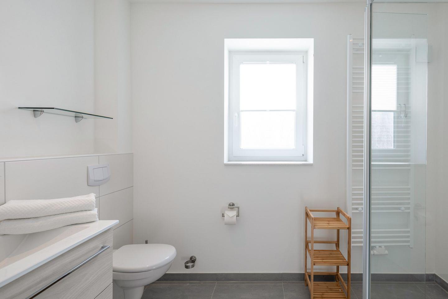 Das moderne Bad bietet Ihnen eine bodengleiche Dusche.