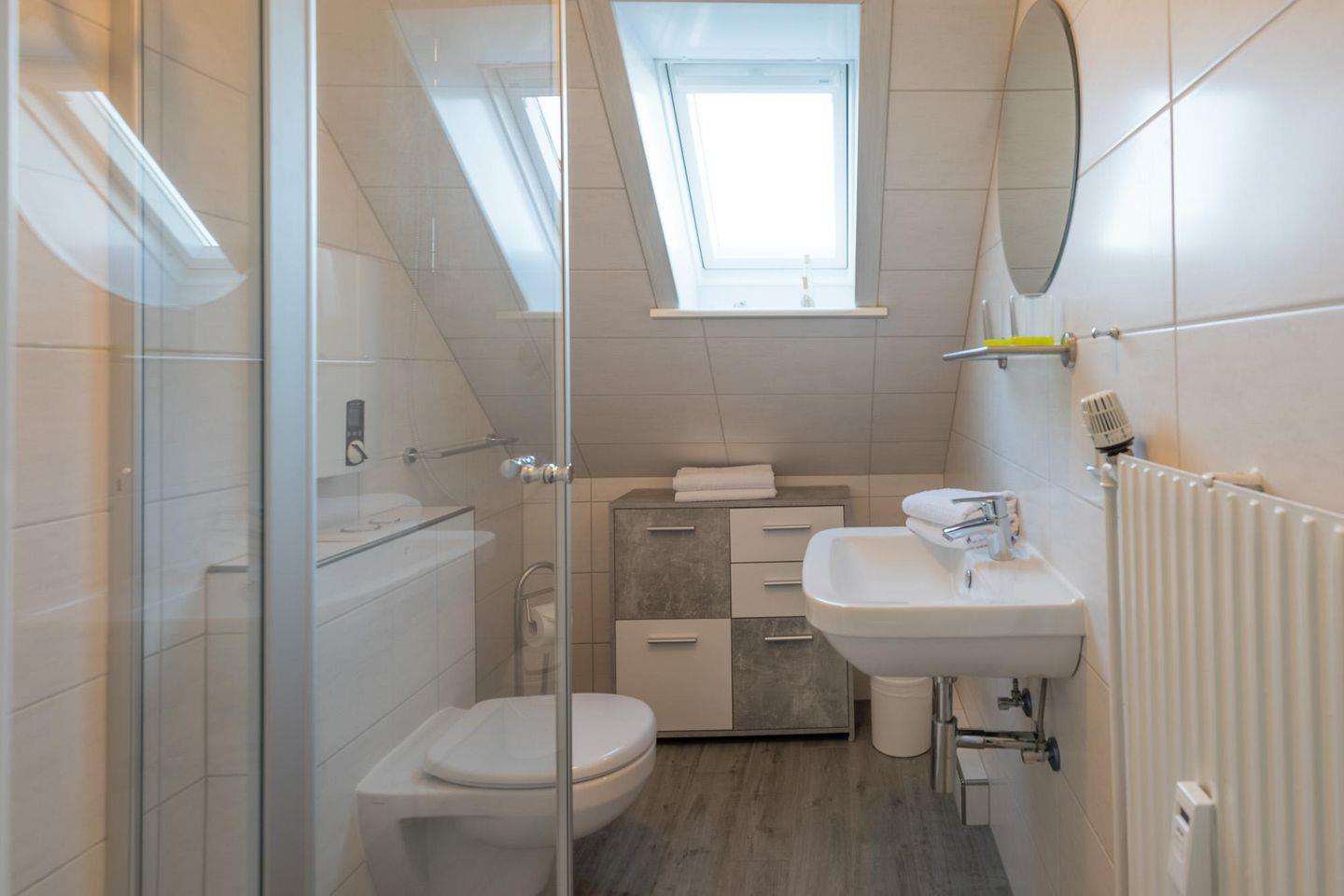 Das moderne Bad bietet Ihnen eine bodengleiche Dusche.