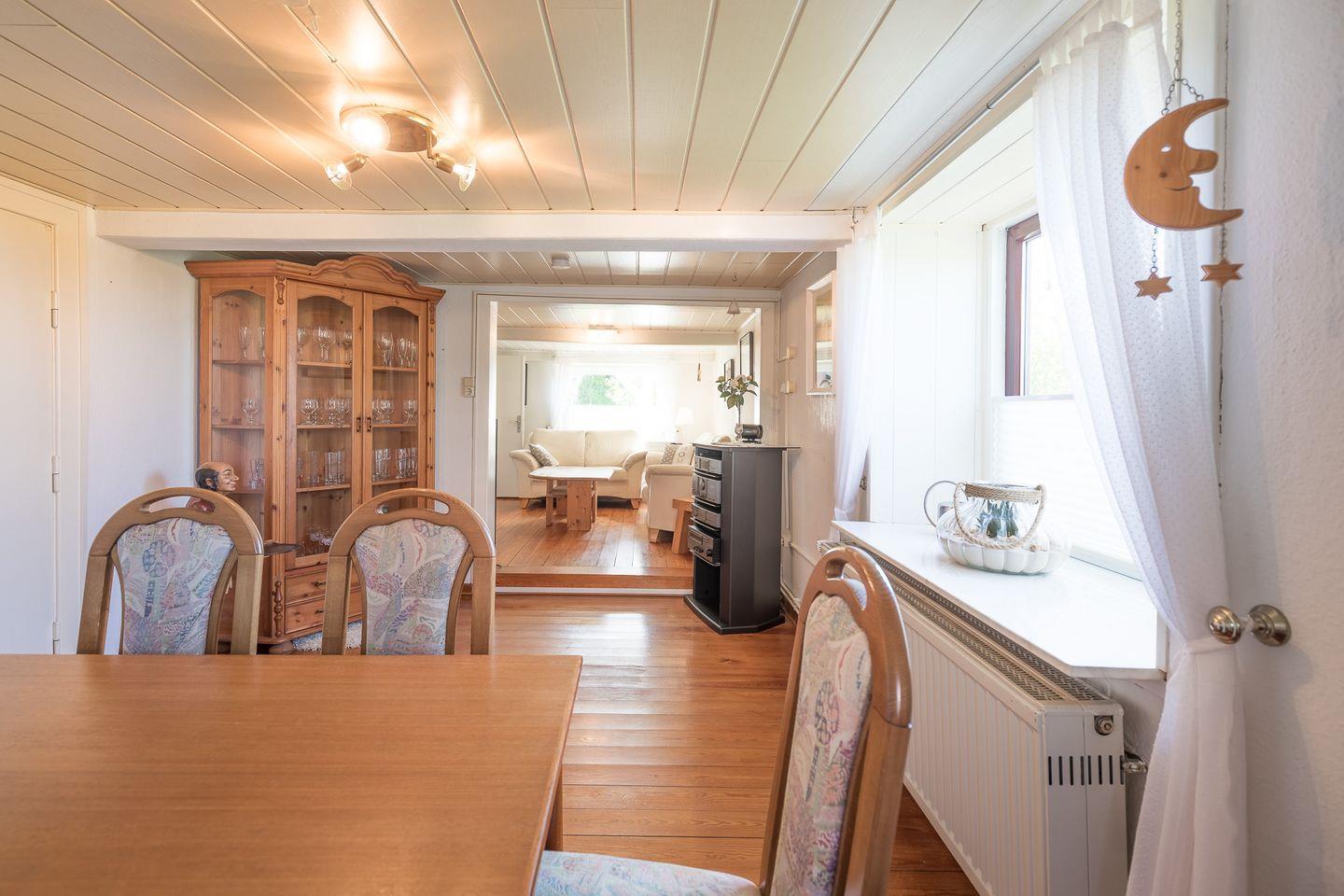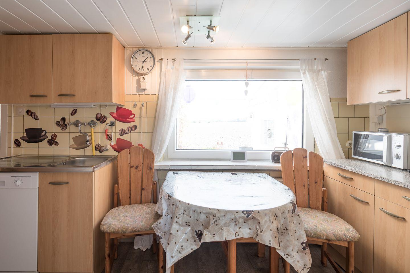 Das Ferienhaus verfügt über drei Schlafzimmer (ein Doppelbett, 180 x 200 (Durchgangszimmer), 2 Einzelbetten und 1 Einzelbett (im EG)). Die Küche ist gut ausgestattet: Ceranfeld, Backofen, Geschirrspülmaschine, Kühl/Gefrierschrank und Kaffeemaschine (Filtergröße 4). Der Wohnbereich verfügt über eine Sitzecke und einen Flachbild-TV.
