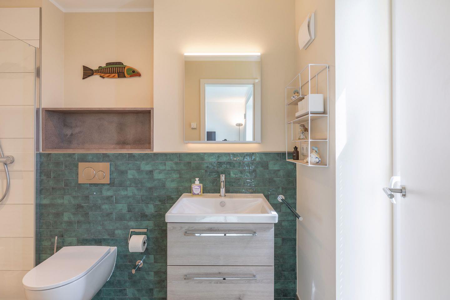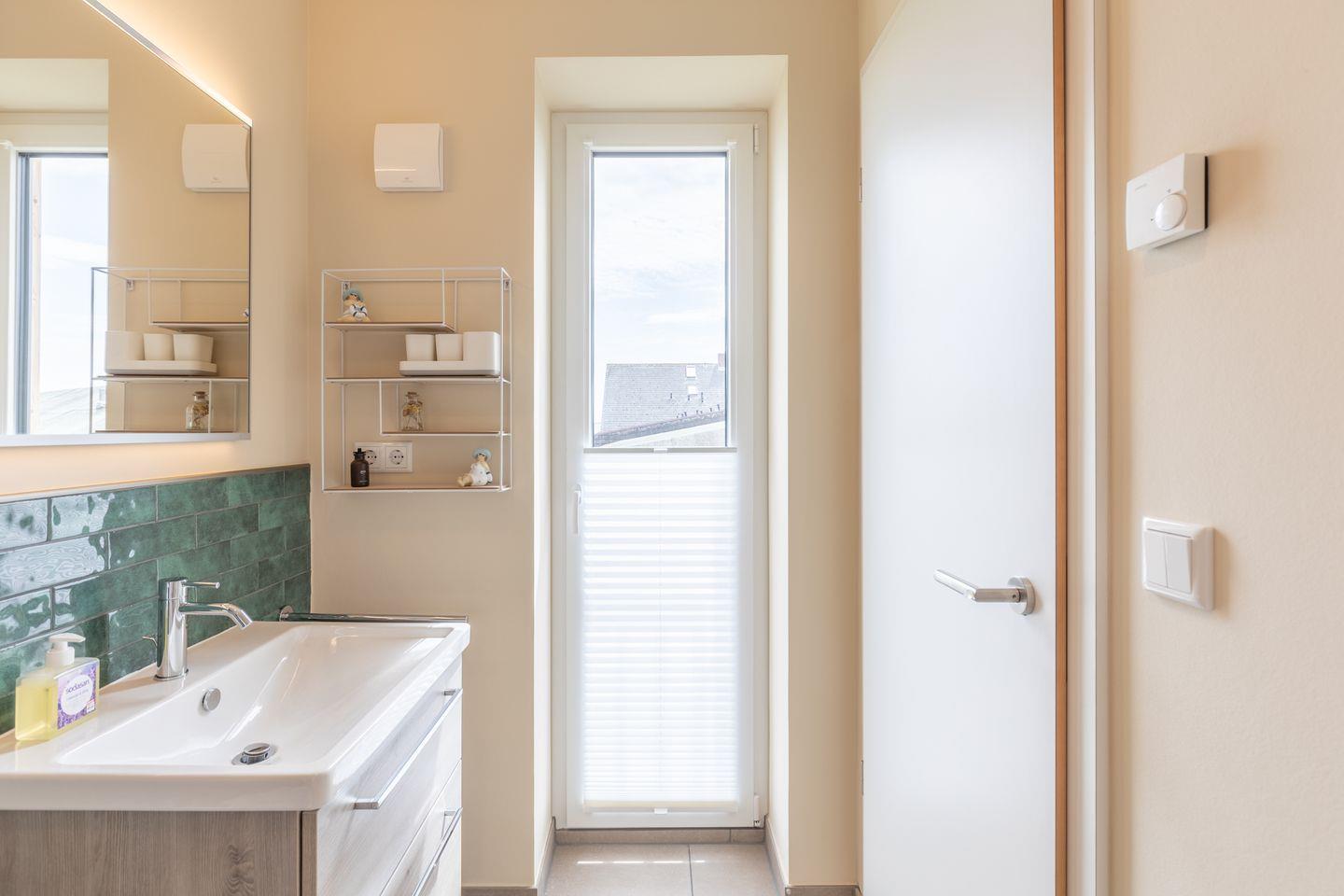 Das großzügige Bad verfügt über Tageslicht, eine ebenerdige Dusche mit Regenbrause, Föhn und einen Handtuchheizkörper.