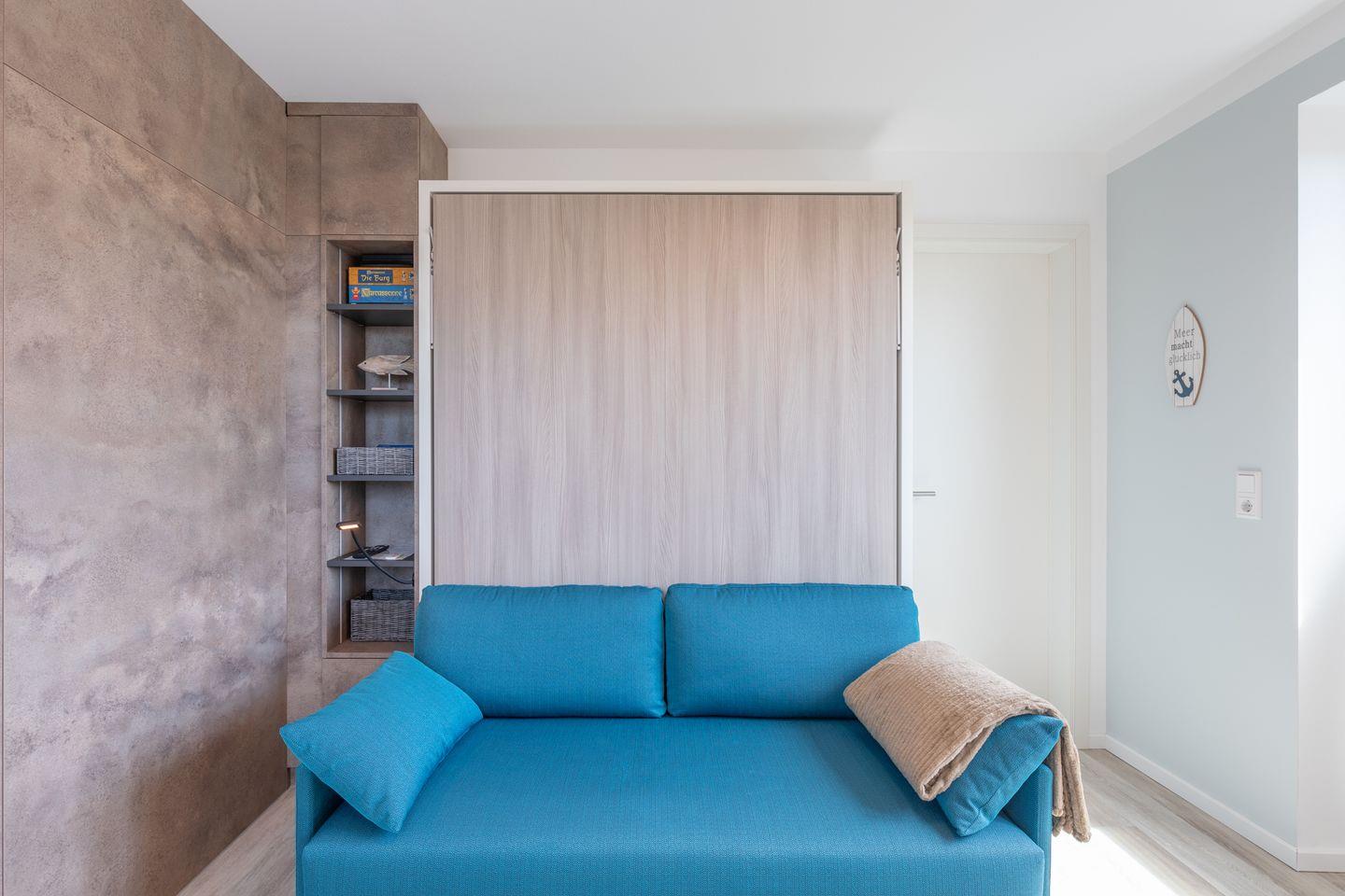 Der helle Wohnraum gliedert sich in einen Eingangs-, den Koch-/Essbereich und den Wohn- und Schlafbereich. Von der Leseecke aus haben Sie einen schönen Blick auf den Angelteich und die Felder. Entspannung finden Sie durch ein smartes 43-Zoll-LED-TV-Gerät mit Soundsystem. Über den Fernseher empfangen Sie auch alle Radioprogramme. Das bequeme Sofa ist Teil des modernen Schrankbetts und lässt sich einfach in ein komfortables Bett mit einer Liegefläche von 160 x 200 cm verwandeln.