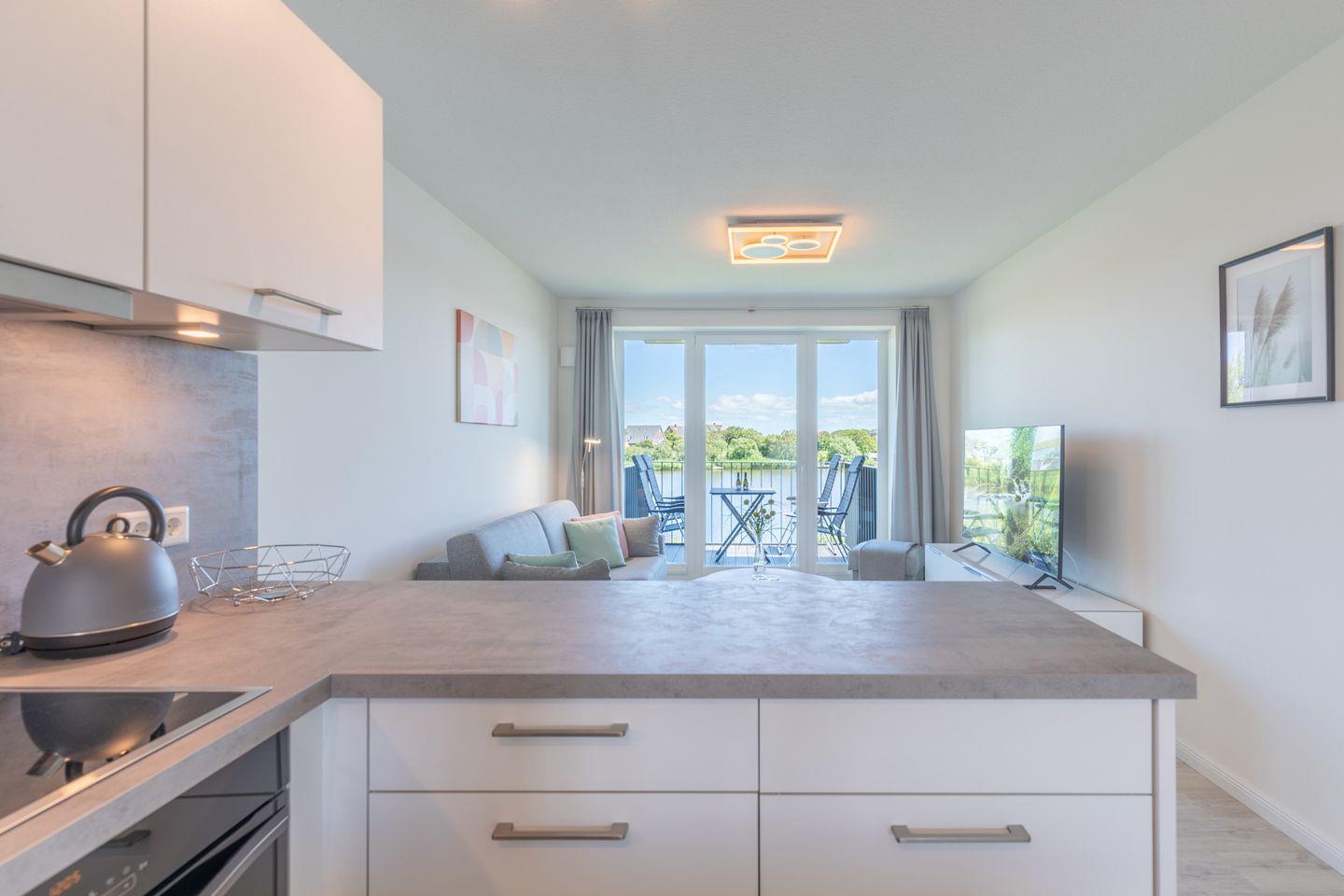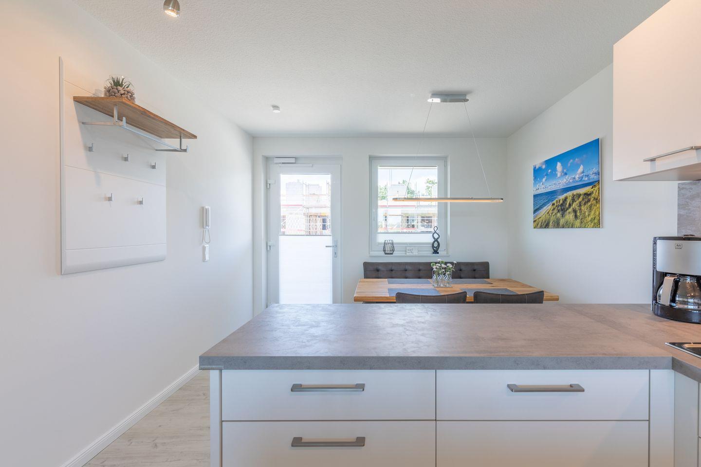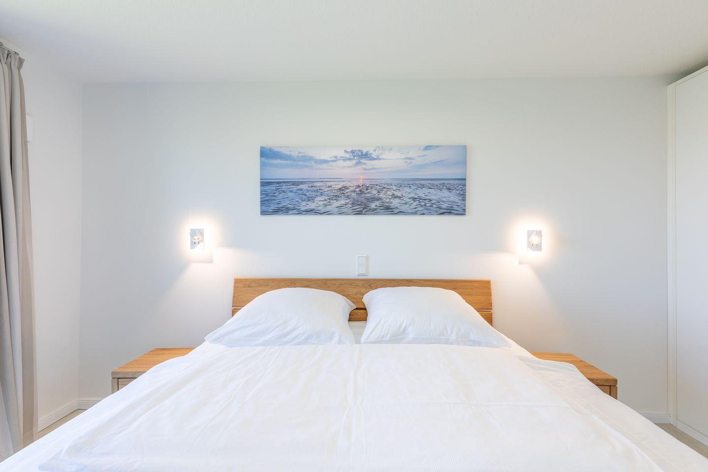 Die 73 qm große Ferienwohnung lädt zu einem erholsamen Nordseeurlaub ein: helles, gemütliches Wohnzimmer mit Schlafsofa (160 x 200) und Sessel, SAT-TV, eine gut ausgestattete Einbauküche mit Cerankochfeld, Backofen mit integrierter Mikrowelle, Geschirrspüler und Kühlschrank. Das erste Schlafzimmer hat ein bequemes Doppelbett (180 × 200) in Komforthöhe sowie Verdunkelungsmöglichkeiten, wie auch Insektenschutz für die Fenster. Das zweite Schlafzimmer ist ebenfalls mit einem Doppelbett (180 × 200) ausgestattet und verfügt über ein eigenes Bad mit Waschbecken, WC und Dusche. Beide Schlafzimmer sind mit einem Flachbildfernseher ausgestattet. Das andere Badezimmer verwöhnt Sie zusätzlich mit einem modernen Dampfbad.