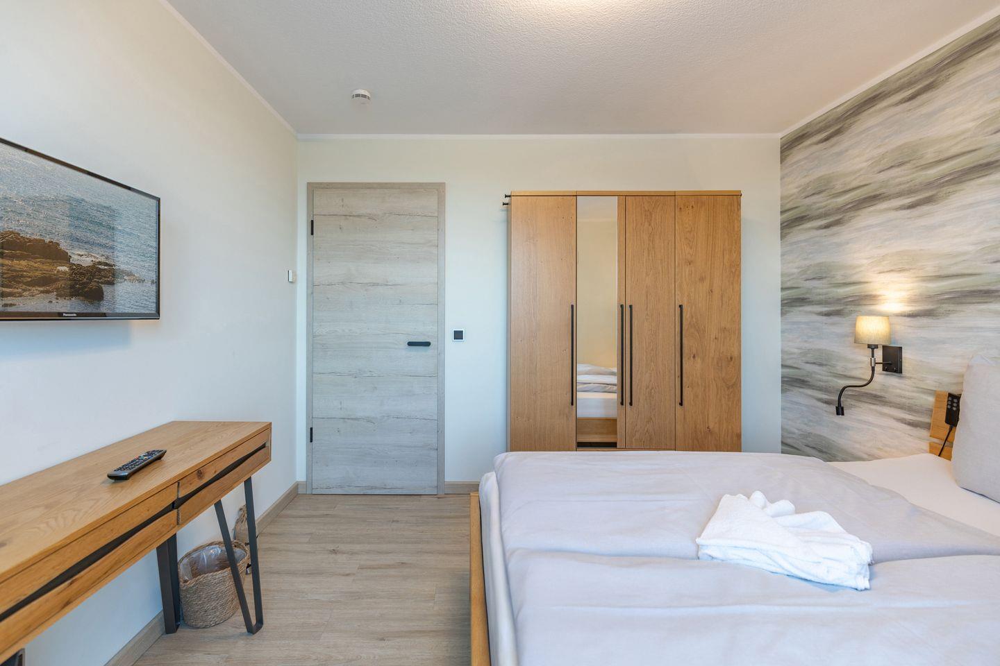 Die Wohnung verfügt über zwei Schlafzimmer (Betten 180 x 200 cm, Härtegrad 2) jeweils mit eigenem TV und Duschbad, so dass die Privatsphäre gegeben ist. Auch eine Waschmaschine mit Trocknerfunktion ist vorhanden.