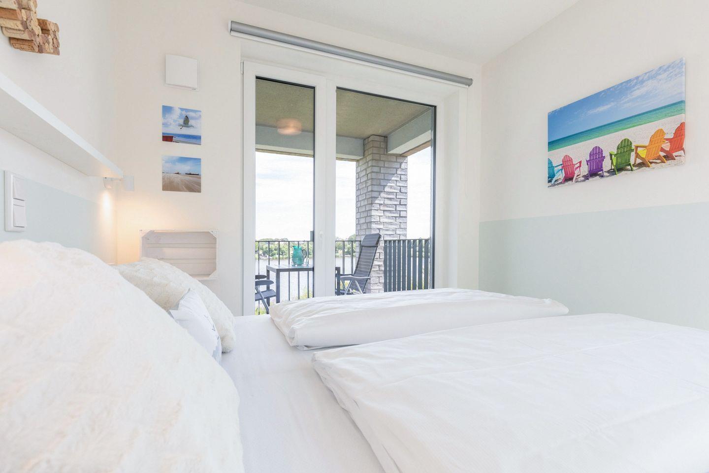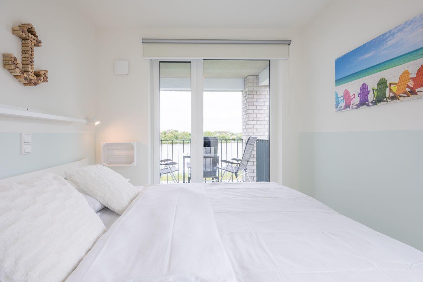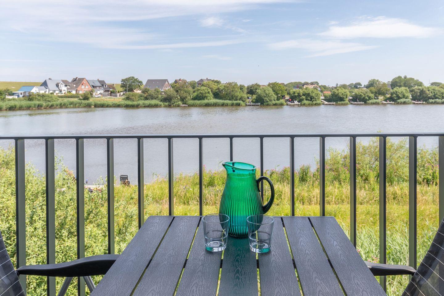 Über das Wohn- und das Schlafzimmer haben Sie Zugang zum sonnigen und (blick-) geschützten Eckbalkon mit Gartenmöbeln für gemütliche Stunden mit einem herrlichen Blick auf den idyllischen See und den Deich, auf dem man die Schafe beim Grasen beobachten kann. Hier können Sie Ihren Urlaubstag gemütlich ausklingen lassen, dem Vogelgezwitscher lauschen und das unvergleichliche Naturpanorama genießen.