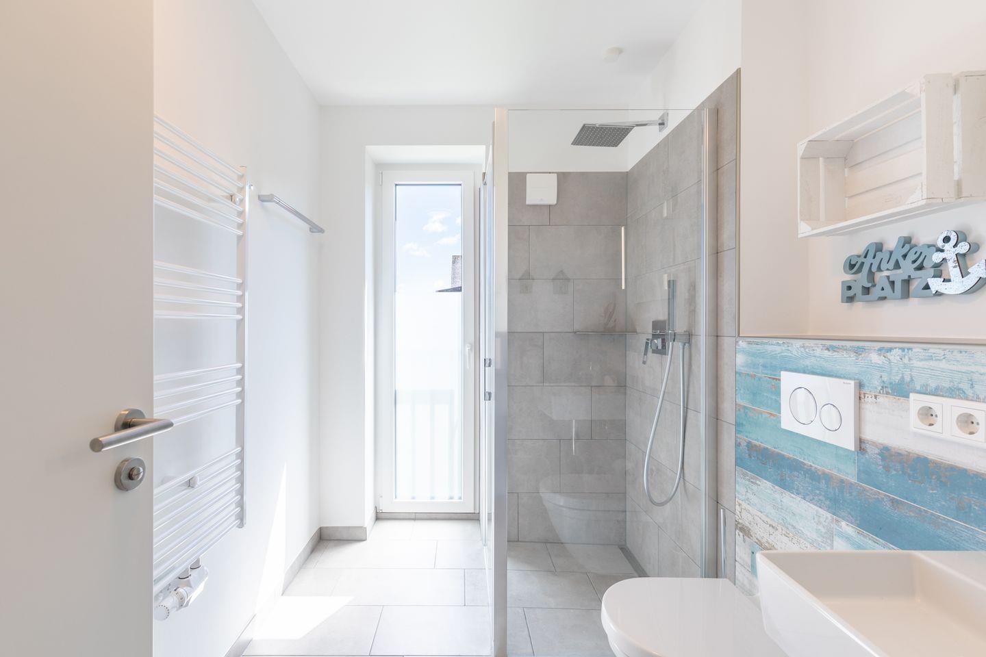 Im großzügigen, tageslichthellen Duschbad steht ein Waschtrockner für Sie bereit.