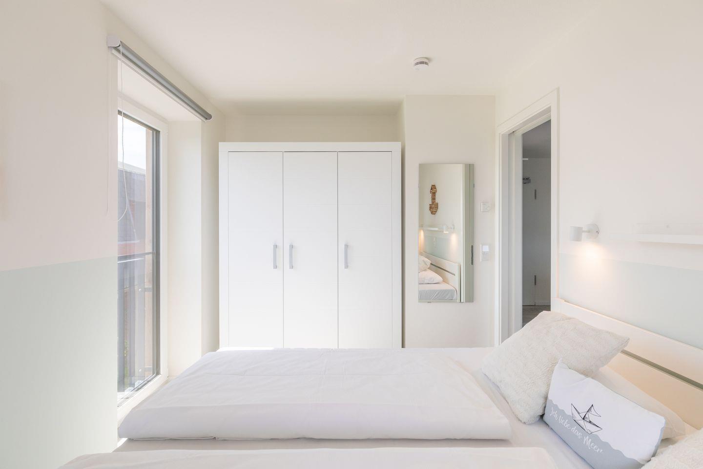 Das Schlafzimmer ist mit einem Doppelbett (180 × 200) und Kleiderschrank ausgestattet, die Fenster lassen sich verdunkeln.