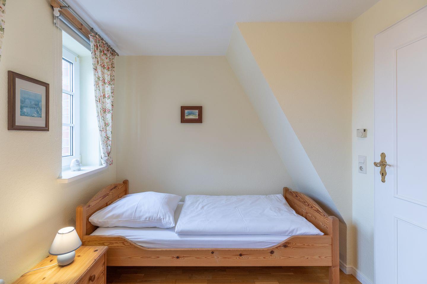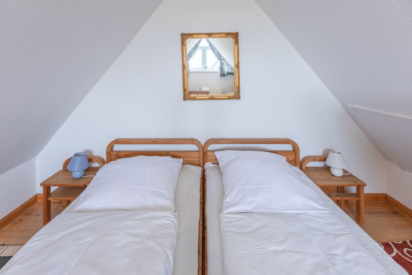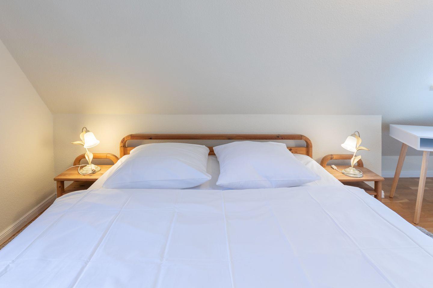 Im 1. OG finden Sie ein großes Schlafzimmer mit einem Doppelbett (180 x 200), ein Schlafzimmer mit zwei Einzelbetten, sowie ein helles, modernes Duschbad mit WC. Ein weiteres Schlafzimmer mit einem Doppelbett (180 x 200, das bei Bedarf auch auseinander geschoben werden kann ) steht Ihnen im 2. OG zur Verfügung. Dieses Schlafzimmer ist über eine recht steile Holztreppe erreichbar.