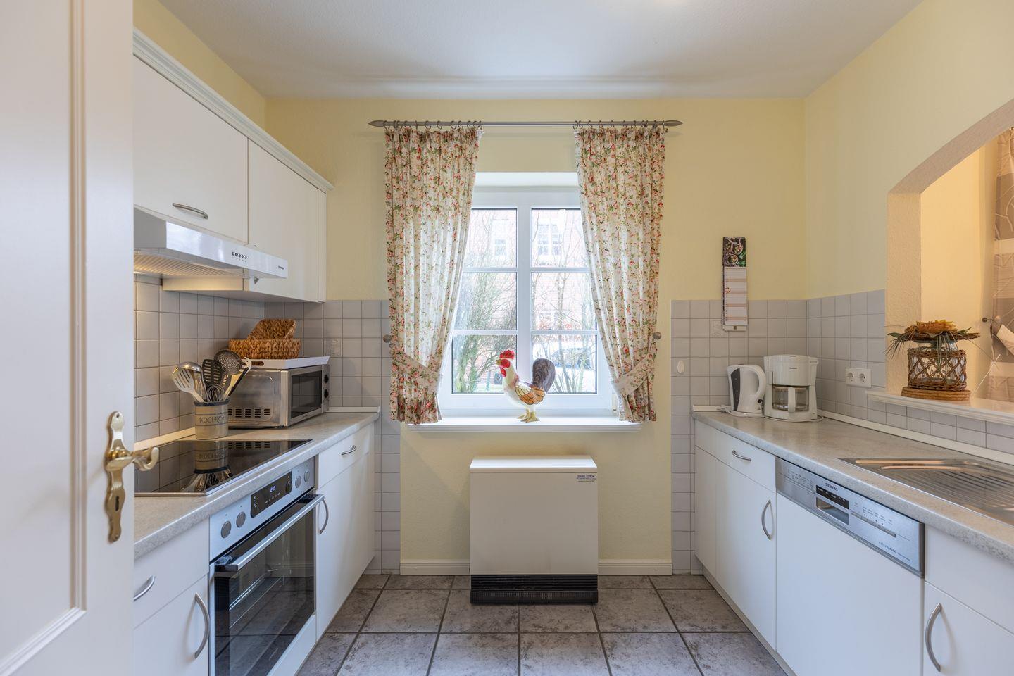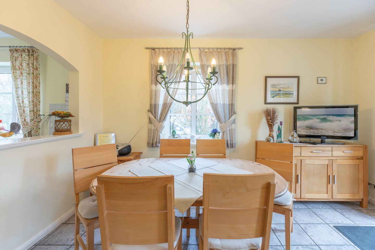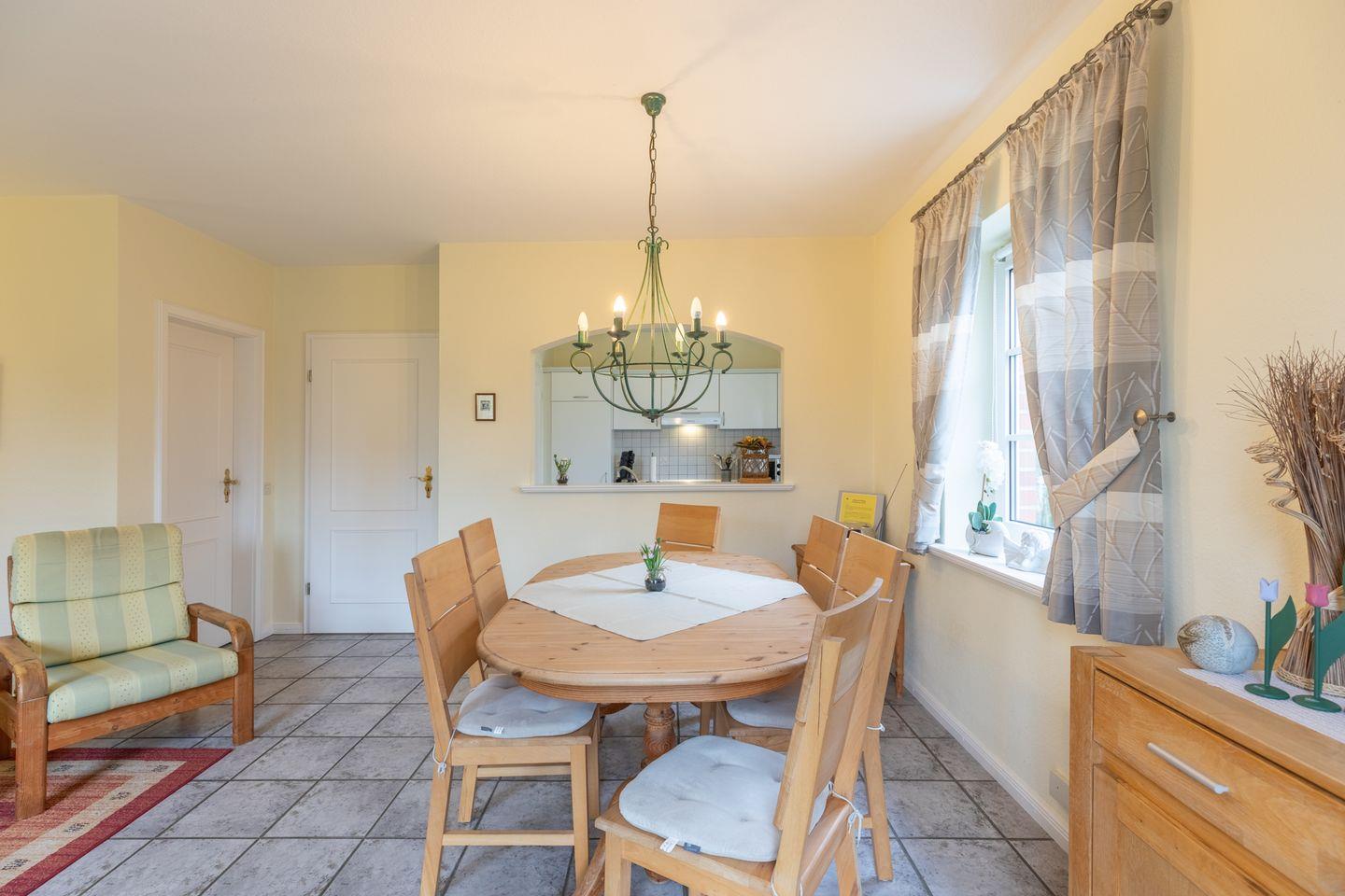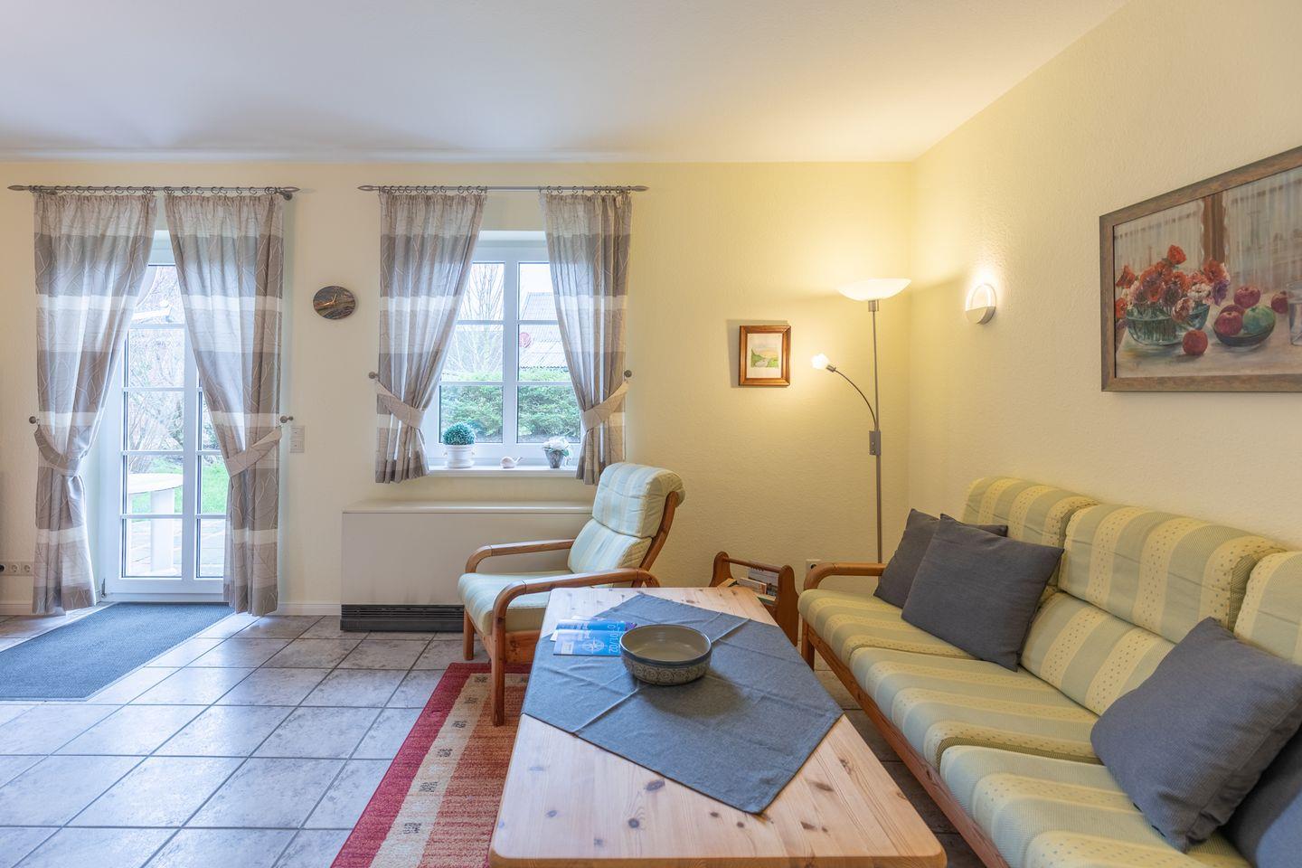 Das Ferienhaus lädt Sie ein zu einem erholsamen Nordseeurlaub: gemütliches Wohnzimmer mit Sofa, SAT-TV, Musikanlage, einer gut ausgestatteten Einbauküche mit Ceranfeld, Backofen, Geschirrspülmaschine, Waschmaschine und einer Kaffeemaschine (Filtergröße 4). Das Gäste-WC rundet das Bild ab.