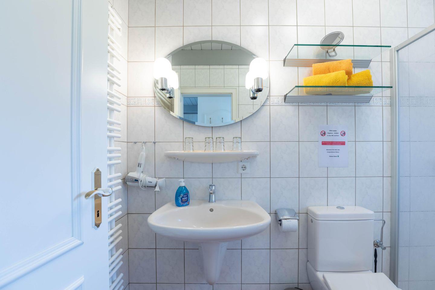Die Ferienwohnung verfügt über zwei Schlafzimmer im Obergeschoss, die jeweils mit einem Doppelbett (180 x 200) und zwei Einzelbetten (90 x 200) ausgestattet sind. Zusätzlich gibt es eine Gästetoilette. Im Erdgeschoss befinden sich die Küche, der Wohnraum und das Badezimmer. Die Küche ist umfangreich eingerichtet: Ceranfeld, Backofen, Geschirrspülmaschine, Wasserkocher, Kühlschrank mit Gefrierfach, Mikrowelle und einer Filterkaffeemaschine (Größe 4) sowie eine Tchibo Qbo Kapselmaschine. Das Badezimmer bietet eine Dusche, ein WC und eine Waschmaschine. Der Wohnraum ist gemütlich gestaltet mit einem Sofa zum Entspannen und einem Fernseher für Ihre Unterhaltung. Vom Wohnzimmer haben Sie eine direkte Zugangstür zur Terrasse. Die Wohnung wird im Erdgeschoss zusätzlich über eine Fußbodenheizung erwärmt.