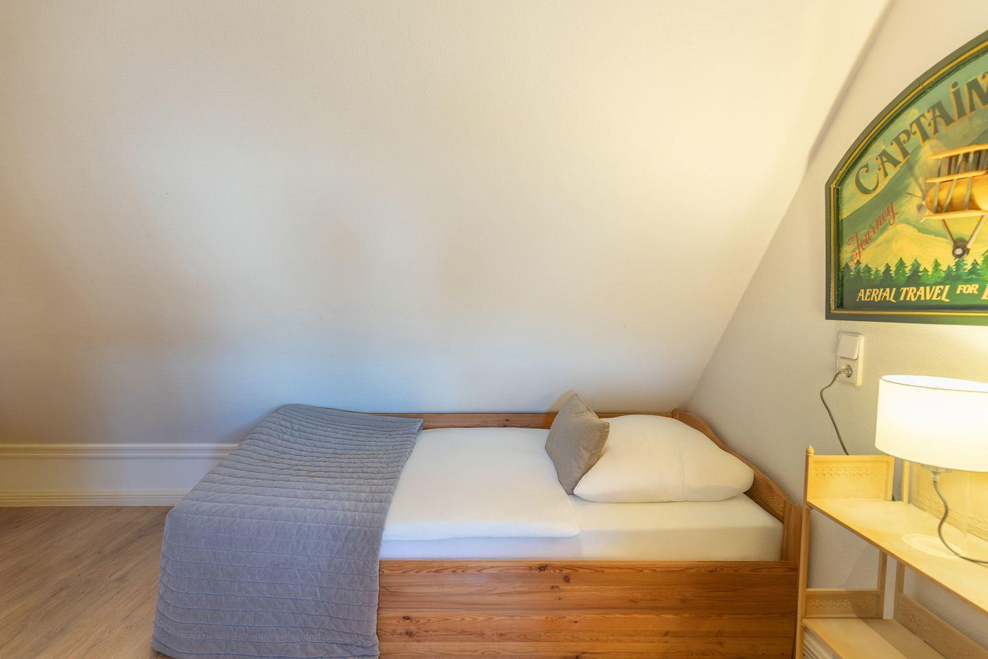 Im zweiten Obergeschoss können Sie in dem Galeriezimmer der Wohnung bei dem traumhaften Blick über die weiten Felder Ihre Seele baumeln lassen. Im Galeriezimmer steht ein weiteres Einzelbett (90 x 200) zur Verfügung. Hier besteht die Möglichkeit, das Bett auszuziehen, sodass es die Größe von 160 x 200 Meter erreicht. Aufgrund der Größe der Einzelbetten sind sie vor allem für Kinder geeignet.