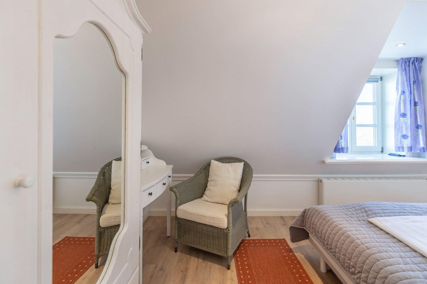 Das Schlafzimmer im ersten Obergeschoss bietet mit einem bequemen Doppelbett (180 x 200) Platz für bis zu zwei Personen. Ein Einzelbett (je 90 x 200), welches sich ebenfalls im ersten Obergeschoss befindet, stellt eine weitere Schlafmöglichkeit dar.