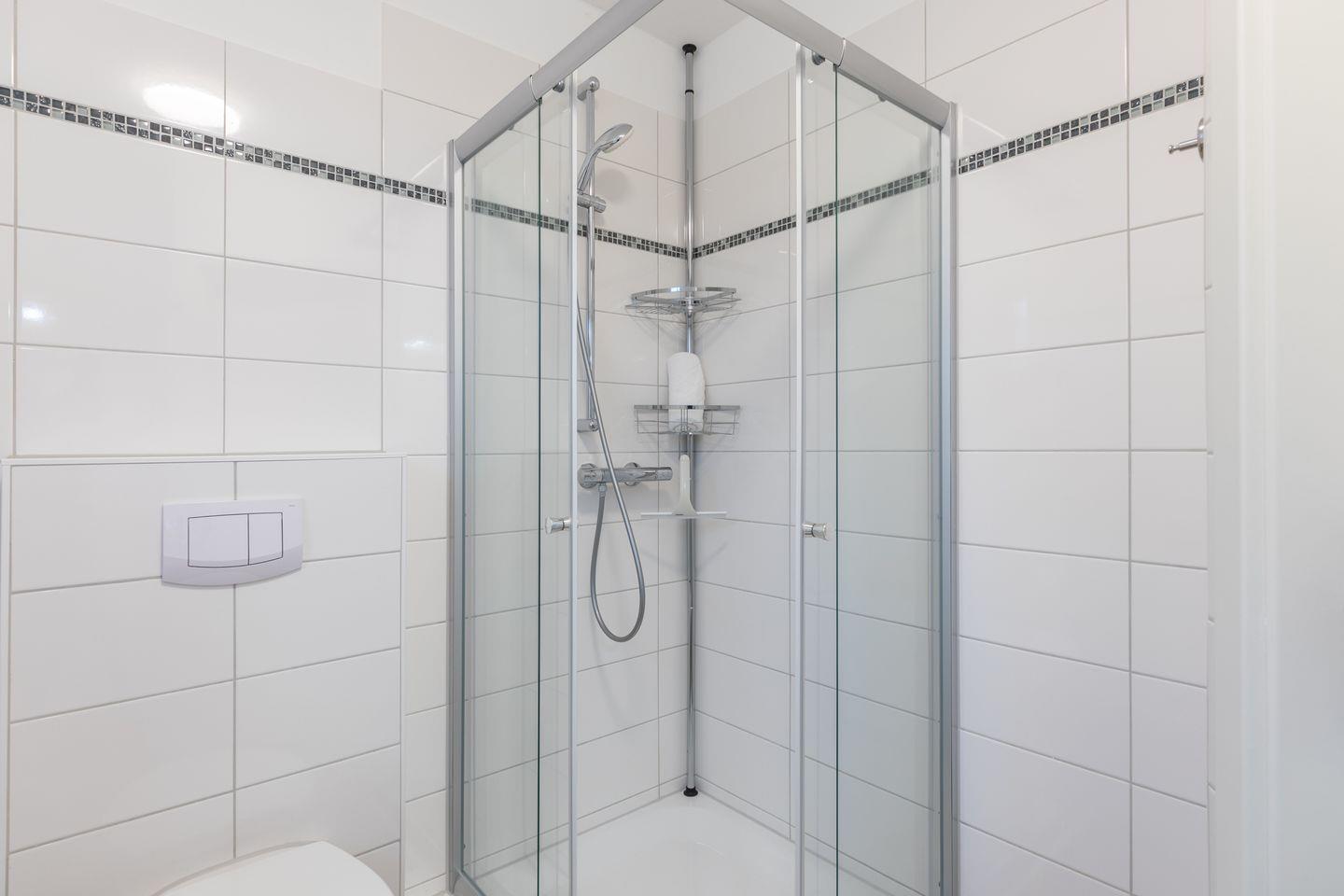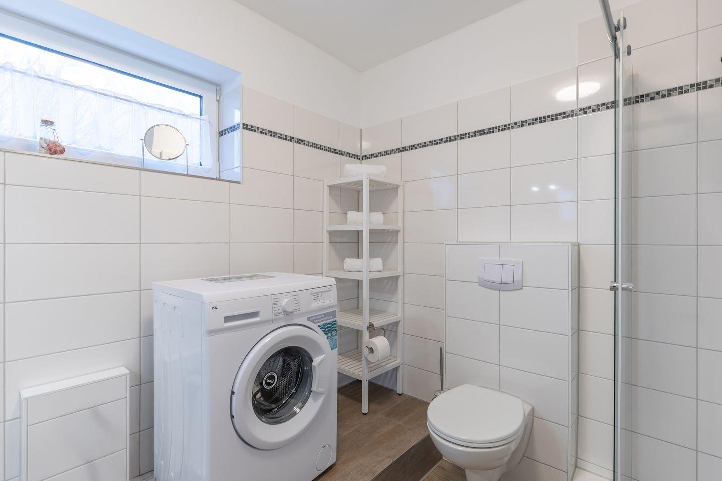 Das lichtdurchflutete Badezimmer ist mit einer Dusche, einem Waschbecken mit praktischem Spiegelschrank, einer Waschmaschine und einem Handtuchheizkörper ausgestattet.