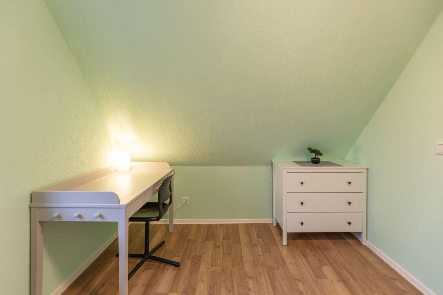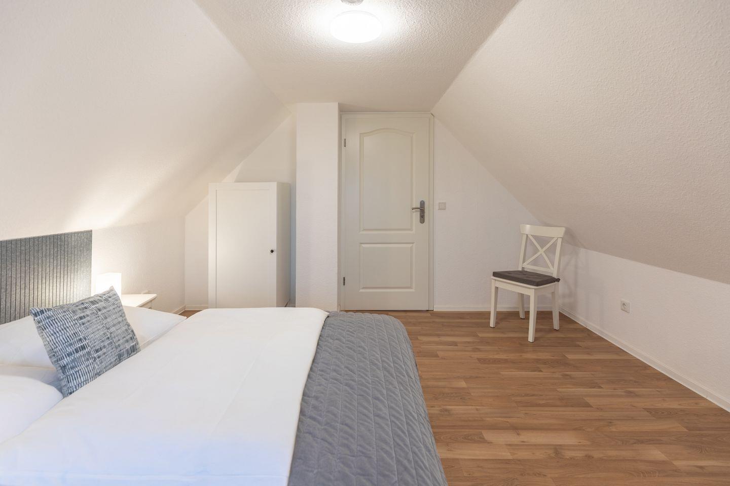 Über eine Treppe gelangen Sie in das Obergeschoss, wo sich zwei gemütliche Schlafzimmer befinden. Das Hauptschlafzimmer ist mit einem großzügigen Doppelbett (160 x 200 cm) ausgestattet und in ruhigen Farbtönen gestaltet. Ein Kleiderschrank und eine Kommode bieten ausreichend Stauraum. Das zweite Schlafzimmer ist flexibel nutzbar und verfügt über ein Schlafsofa, das als zusätzliche Schlafmöglichkeit dient. Ein Schreibtisch und eine Kommode ergänzen die Einrichtung, sodass der Raum auch als Rückzugsort oder Arbeitsbereich genutzt werden kann.