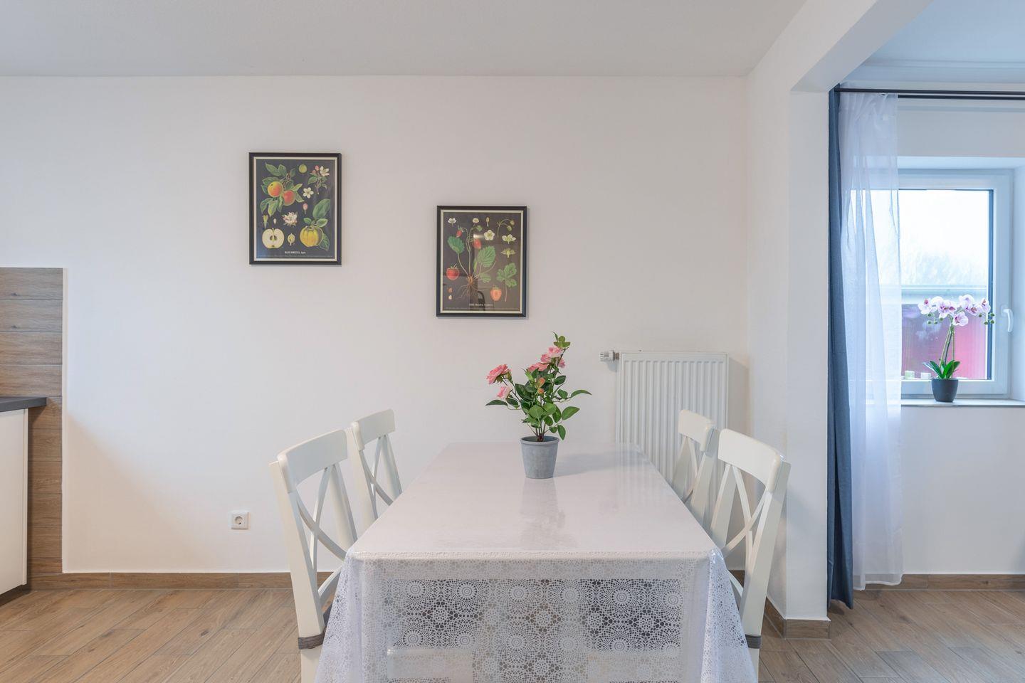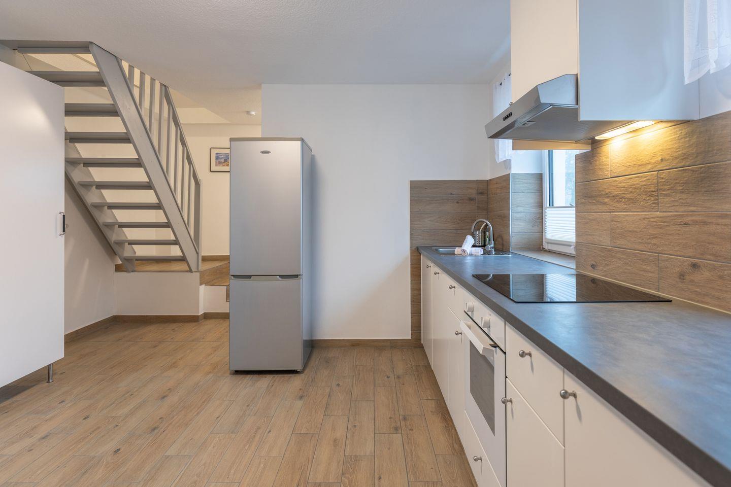 Die offene Küche kombiniert Funktionalität mit Stil: Helle Fronten und eine dunkle Arbeitsplatte schaffen eine moderne, aber gemütliche Atmosphäre. Zur Ausstattung gehören ein Herd, ein Backofen, eine Kaffeemaschine, ein Wasserkocher, ein Toaster und vieles mehr - sodass Sie bestens versorgt sind. Der angrenzende Essbereich fügt sich harmonisch in den offenen Wohnbereich ein.