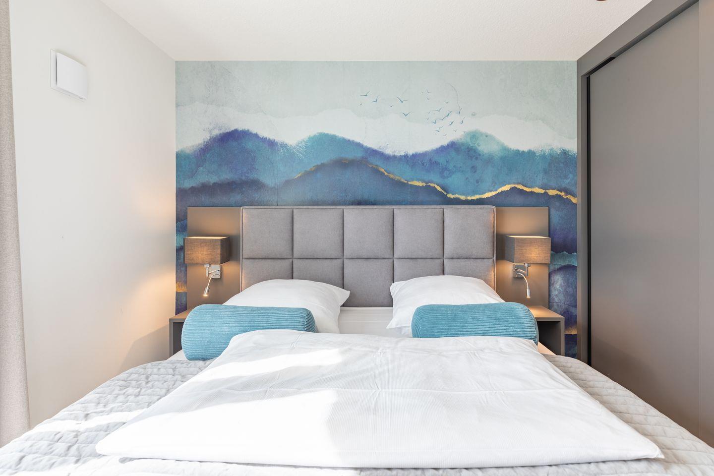 Die Wohnung verfügt über zwei separate Schlafzimmer (jeweils mit TV-Screen) mit komfortablen Schlafmöglichkeiten und hochwertigem Fliesenboden. Sie eignen sich ideal für Familien, Paare oder kleine Reisegruppen. Zwei moderne Badezimmer, ausgestattet mit bodengleichen Duschen, stilvollen Waschtischen, Fenstern und Haartrocknern, sorgen für zusätzlichen Komfort und Wohlbefinden.