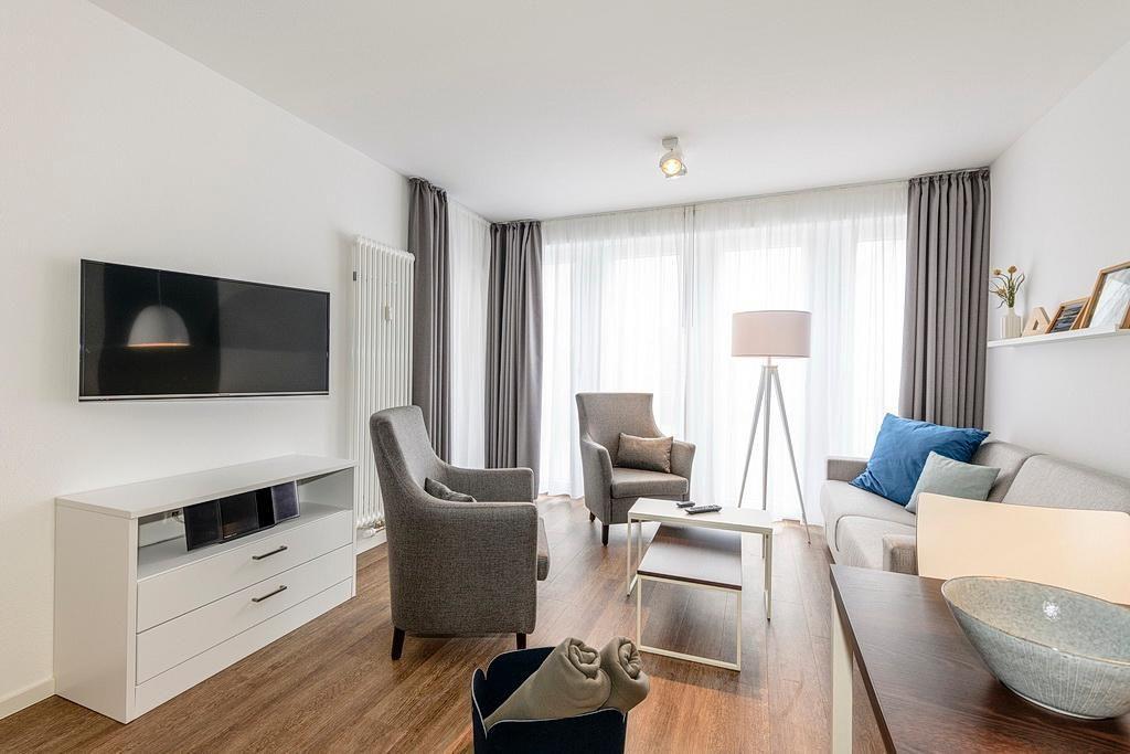 Das geschmackvoll eingerichtete Nichtraucher-Apartment verfügt über kostenfreies WLAN. Der Wohnbereich mit Schlafcouch bietet eine voll ausgestattete offene Küchenzeile mit Geschirrspüler, Gefrierfach, Kaffeemaschine, Toaster, Wasserkocher und Mikrowelle mit Backfunktion sowie einen großen Flatscreen-TV und ein Radio. Das Apartment verfügt über einen Esstisch für 4 Personen und einen behaglichen Sitzbereich. Ein Schlafzimmer verfügt über ein Doppelbett und einen eigenen Flatscreen-TV, ein weiteres Schlafzimmer über zwei Einzelbetten. Ein Kinderbett kann gegen Entgelt aufgestellt werden. Im stilvollen Badezimmer befinden sich eine große begehbare Dusche sowie ein Waschtisch mit Föhn und Kosmetikspiegel. Nach einem erlebnisreichen Urlaubstag entspannt ihr auf dem überdachten und mit Gartenmöbeln für 4 Personen ausgestatteten Balkon. Dieser ist vom Wohnbereich und vom Hauptschlafzimmer aus zugänglich.