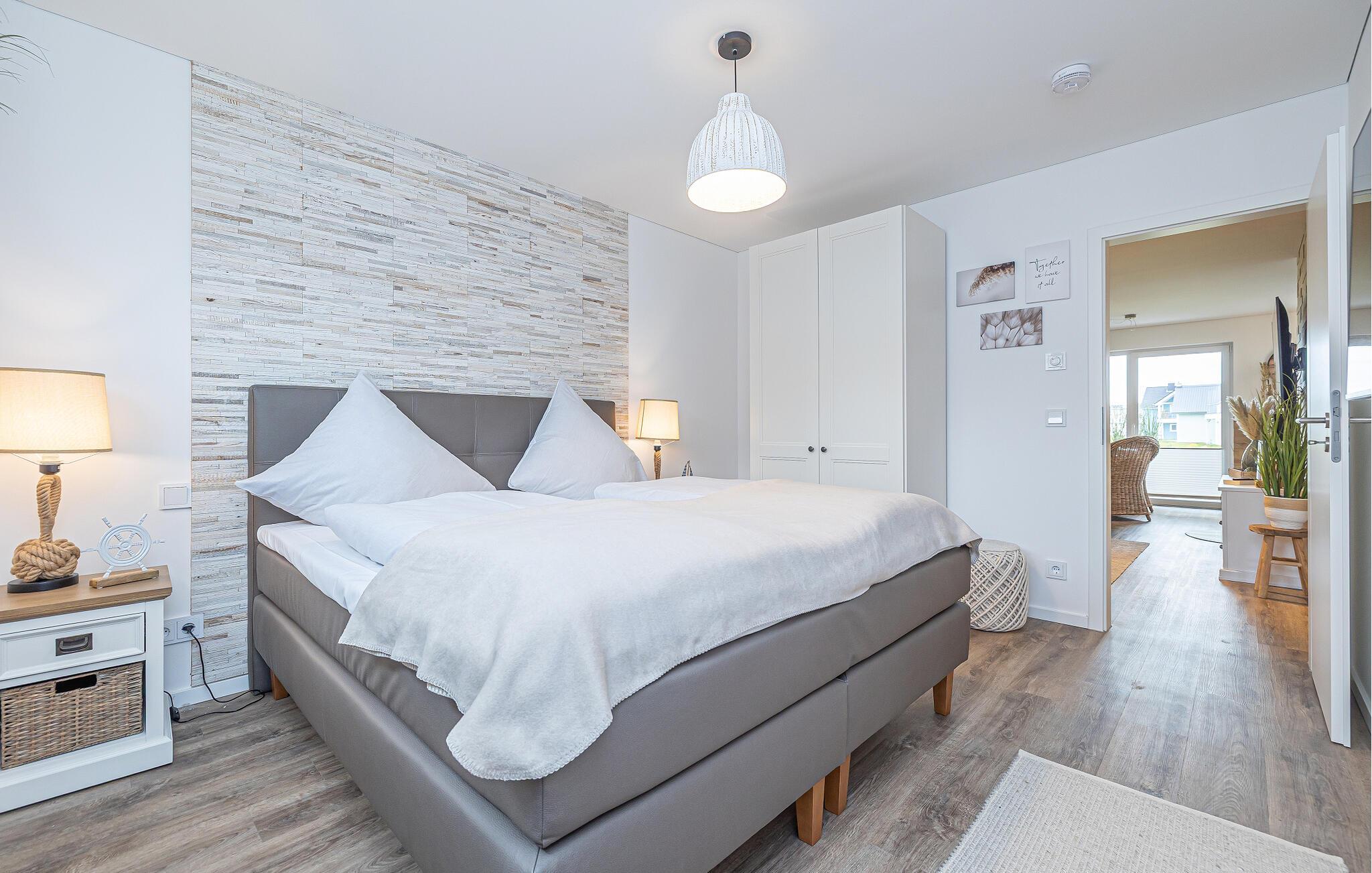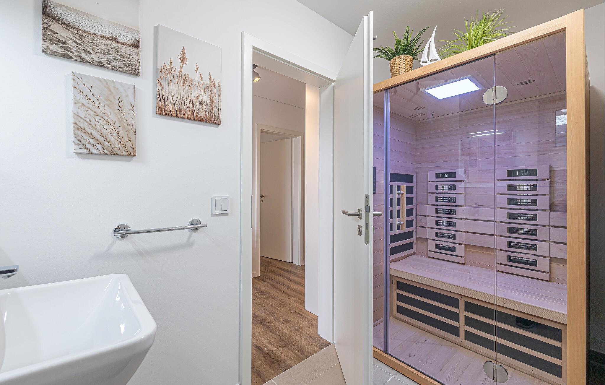 Fordyb jer i Olpenitz-oasen, hvor Østersøluften og lyden af bølgerne bliver jeres daglige følgesvend. Denne magiske ferielejlighed ligger i gåafstand fra den indbydende Weidefelder-strand og den livlige havnepromenade. Et sted, hvor skønheden i Schlei-regionen kan mærkes i enhver brise. Gå ind i denne ferielejlighed i stueetagen via en overdækket terrasse. Gangen åbner ud i en rummelig, åben stue/alrum, som indbyder til at blive hængende med en behagelig opholdsstue, et smart-tv og en knitrende pejs. Her skabes minder om ubekymrede familieaftener ved det store spisebord, som også inviterer til spil sammen med de spil, der findes. Det åbne køkken, udstyret med elegance og funktionalitet, støtter jer i kulinariske opdagelser. Fra køkkenet og spisepladsen fører stien til den overdækkede hovedterrasse, hvor et terrassebord og en grill inviterer til fælles måltider i havluften. Omgivet af en græsplæne mellem husene, bliver dette sted et legeparadis for børn. Drømme om højeste niveau venter på jer i de to hyggelige soveværelser. Dobbeltsengen i det ene værelse og de to enkeltsenge i det andet lover en afslappende søvn. Smart-tv'er i begge værelser giver individuel underholdning. Wellness-badet tager jer med ind i en verden af afslapning. Den infrarøde sauna (varmekabinen) og bruseren på gulvniveau forkæler jeres krop og sjæl i en oase af afslapning. Olpenitz-oasen er ikke kun et sted for fred, men også et lykkeligt familieliv, da hunde og børn er meget velkomne her. jeres bil finder sin plads lige foran døren, og der er et separat skur til cykler. Det betyder, at der er alle muligheder for at udforske området og opleve skønheden i Schlei-regionen på to hjul. Hele lejligheden er udstyret med gulvvarme og myggenet. Vores favoritsted Den infrarøde sauna efter en begivenhedsrig dag med ferie. Bemærk: Sommerhuset er stadig ved at blive færdiggjort. Billeder af huset, indretning og indretning blev visualiseret med venlig støtte fra Helma Ferienimmobilien. Feriehuset adskiller sig i indretningsstil.Bemærk venligst: OstseeResort Olpenitz er meget populært, og der bygges fortsat i parken. Ikke desto mindre kan I se frem til en 5-stjernet standard og et førsteklasses ophold. Byggeaktiviteterne kommer ikke til at forstyrre jer på ferien, og derfor gives der ikke yderligere afslag i prisen.
