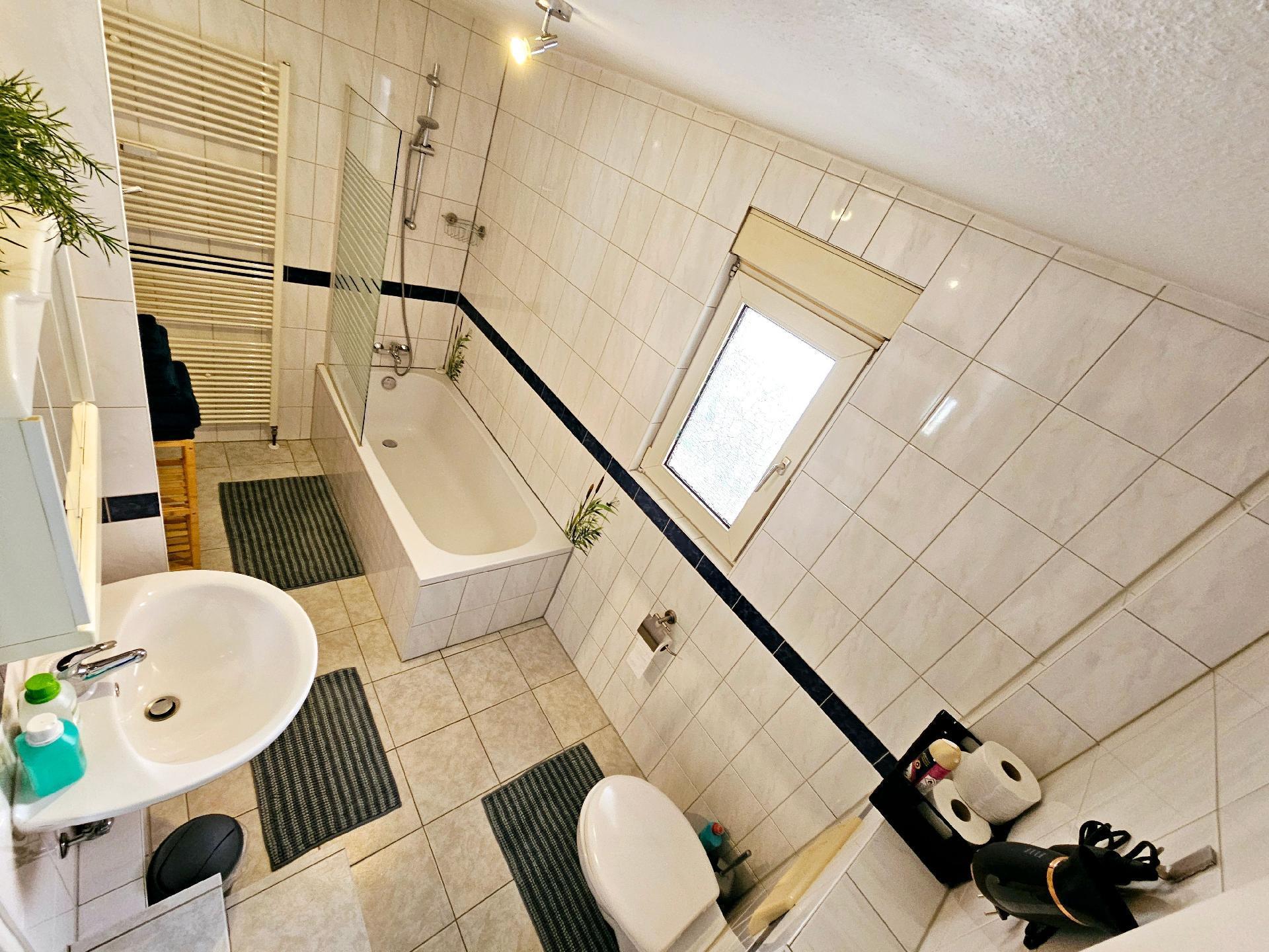 The sofa bed, which can be used as a bed, offers additional sleeping accommodation. Two steps lead down to the white-tiled, daylight bathroom with bathtub and WC. The flat is not suitable for people who are sensitive to noise.