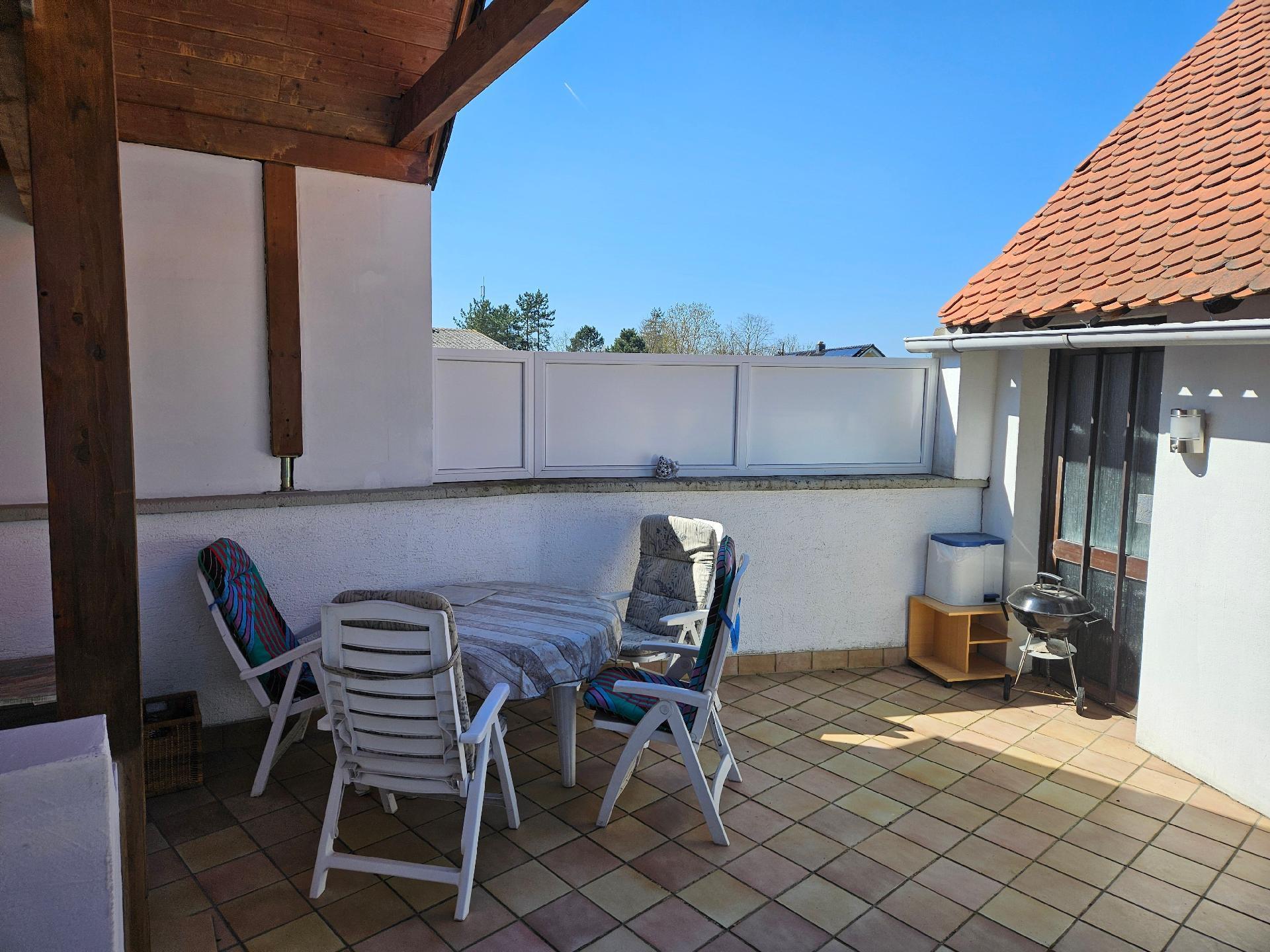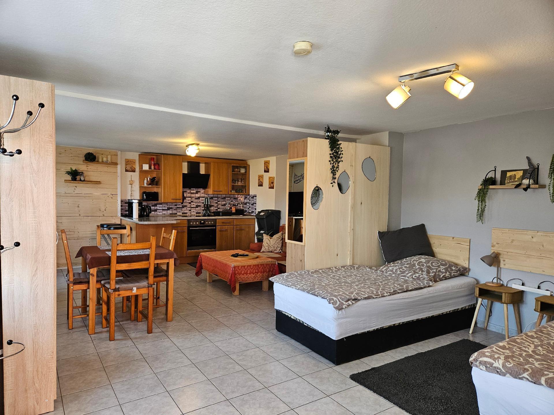 The flat on the upper floor has its own entrance via the large roof terrace. A cupboard as a room divider visually separates the cooking area and the dining area from the sleeping area, which is furnished with two divan beds.
