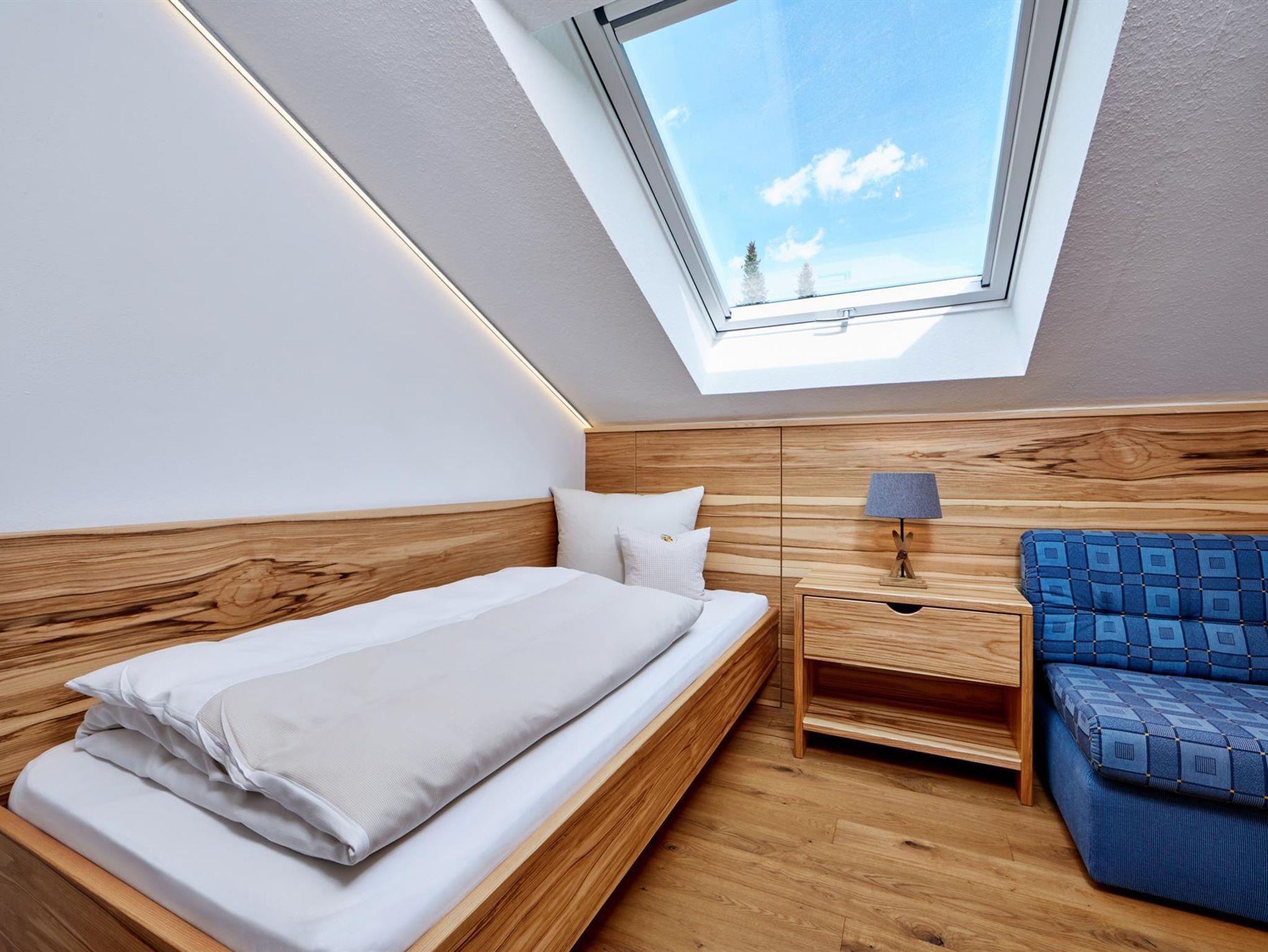 Dachgeschoss-Ferienwohnung (65 m²) mit Holzdielenboden. Einbauküche offen zum Wohnraum. 2 Balkone. Doppelzimmer, kleines Einbettzimmer mit Zustellmöglichkeit für 2. Bett. Duschbad mit WC, Einzelgarage inklusive.